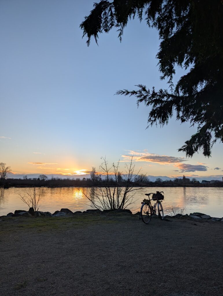 I continued south through Musqueam Park, a quieter and beautiful bit of green space south of Marine Drive. Working my way around the golf course, I stopped at Deering Island, a favourite spot of mine and some friends for a beer. I sat and watched the sun set while and chatted with a family with two teen daughters whose dad was jealous of my beer, as well as an older lady and her sweet dog. On the way out of Deering there were three bald eagles having a bit of a domestic dispute at close range and we all watched in awe.