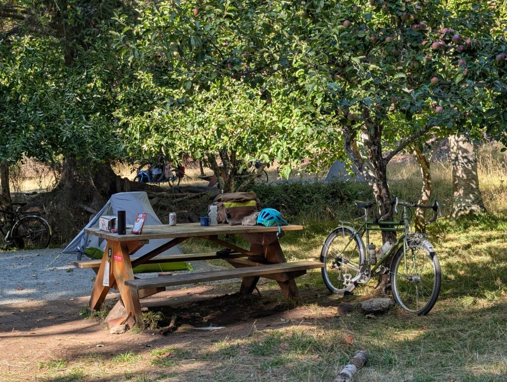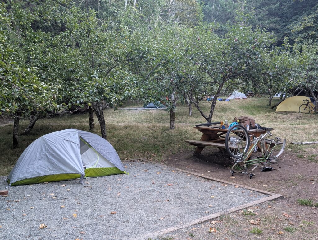 The image below hopefully captures the beauty of this campground. It’s a small clearing filled with apple trees, on a small bay where the remainder of nearby coastline is cliffside. It’s a bit of a marvel.