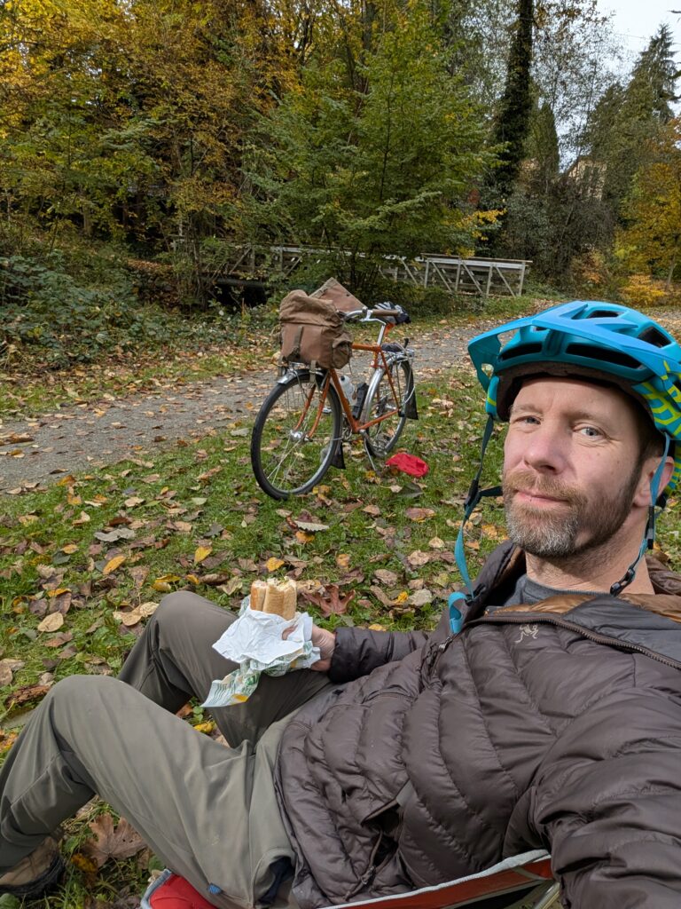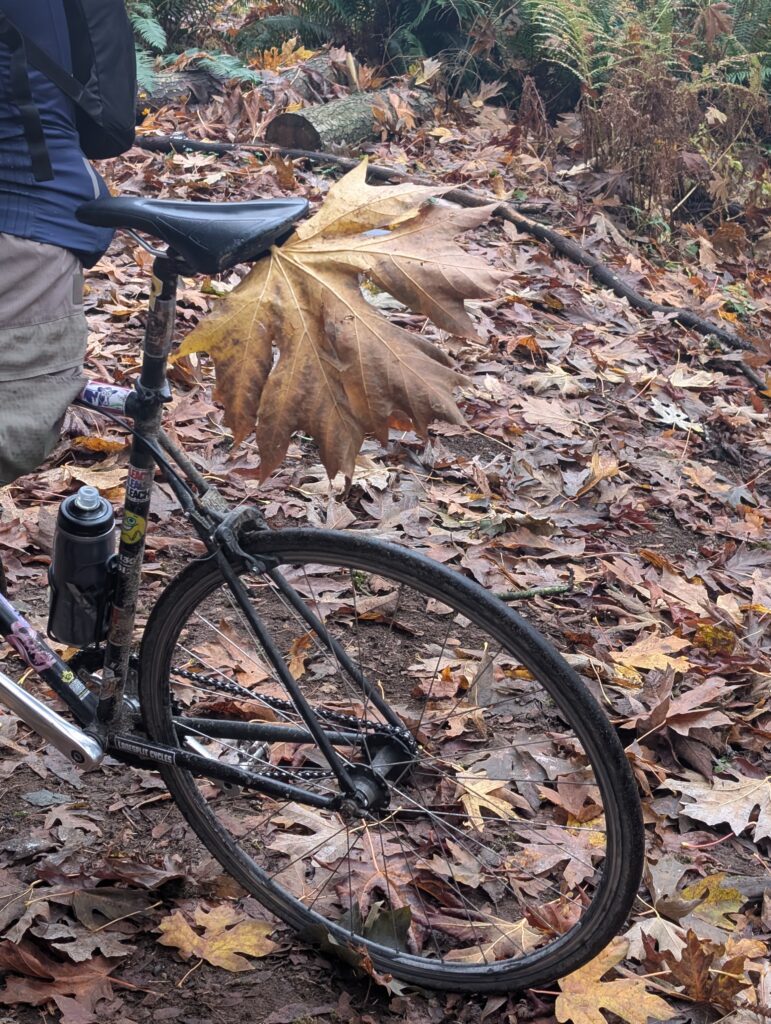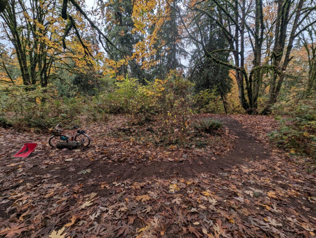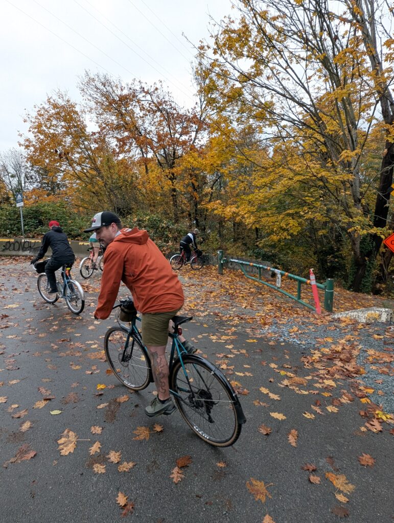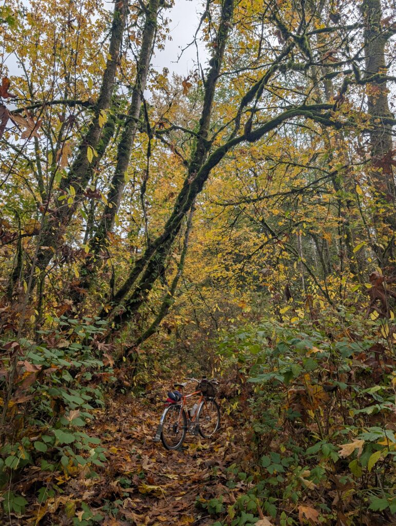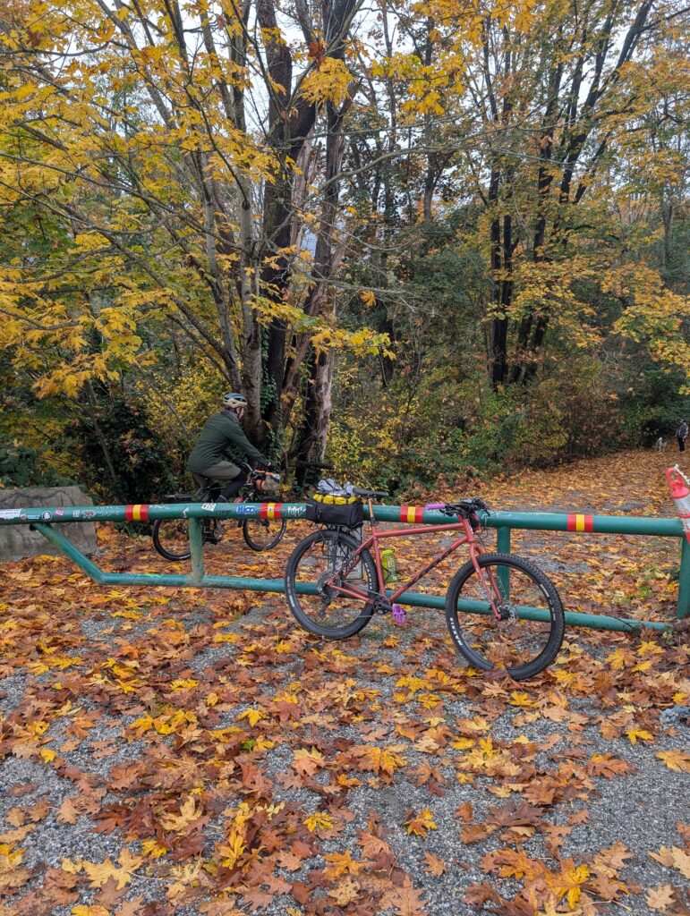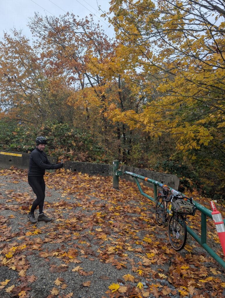 The final group had lost some time due to taking some route liberties that went predictably poorly, so by the time they’d rolled through I knew I had to book it to the finish gate if I wanted to catch the first folks through this aid station. But first, I had to pose my bike with the beauty that is the Interurban rail trail: