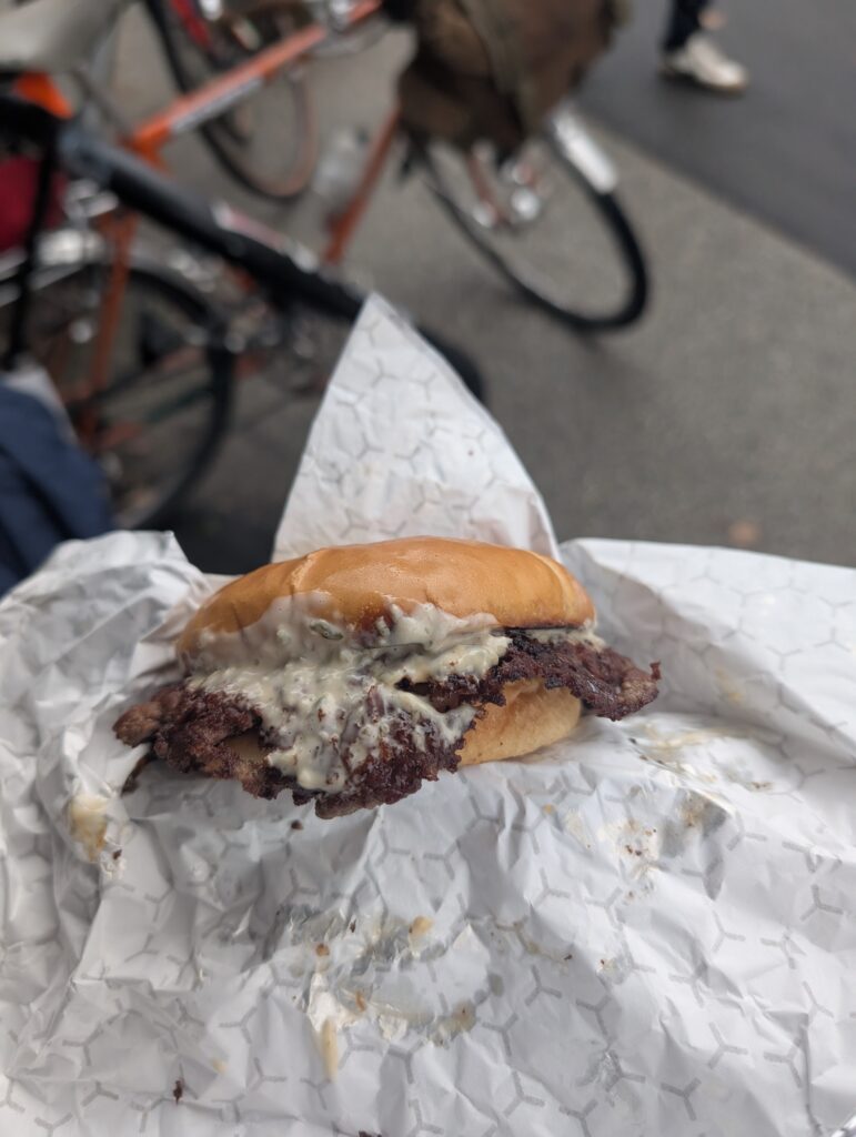 I swung by the brewery again to re-stock as well as grab a smash burger for early dinner. The weather had been behaving remarkably well all day – the forecast looked wet, but I didn’t get rained on until now and it was pretty light.