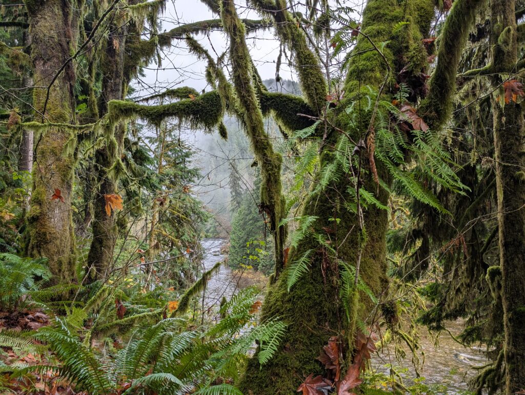 I stopped where I had taken a foliage photo last time I was up here – the big leaf maples at that time were just newly yellow – and now they’d dropped all their leaves and looked entirely different. Below is Nov 2 vs Oct 7.