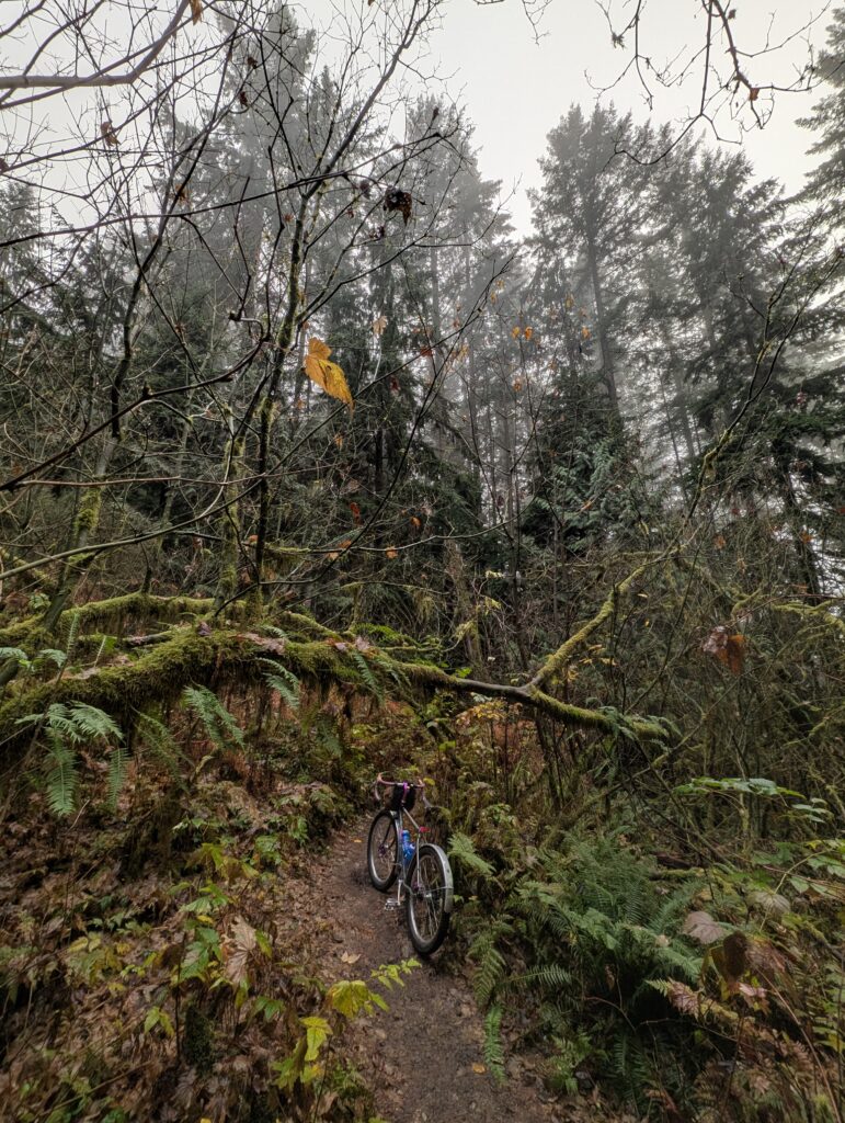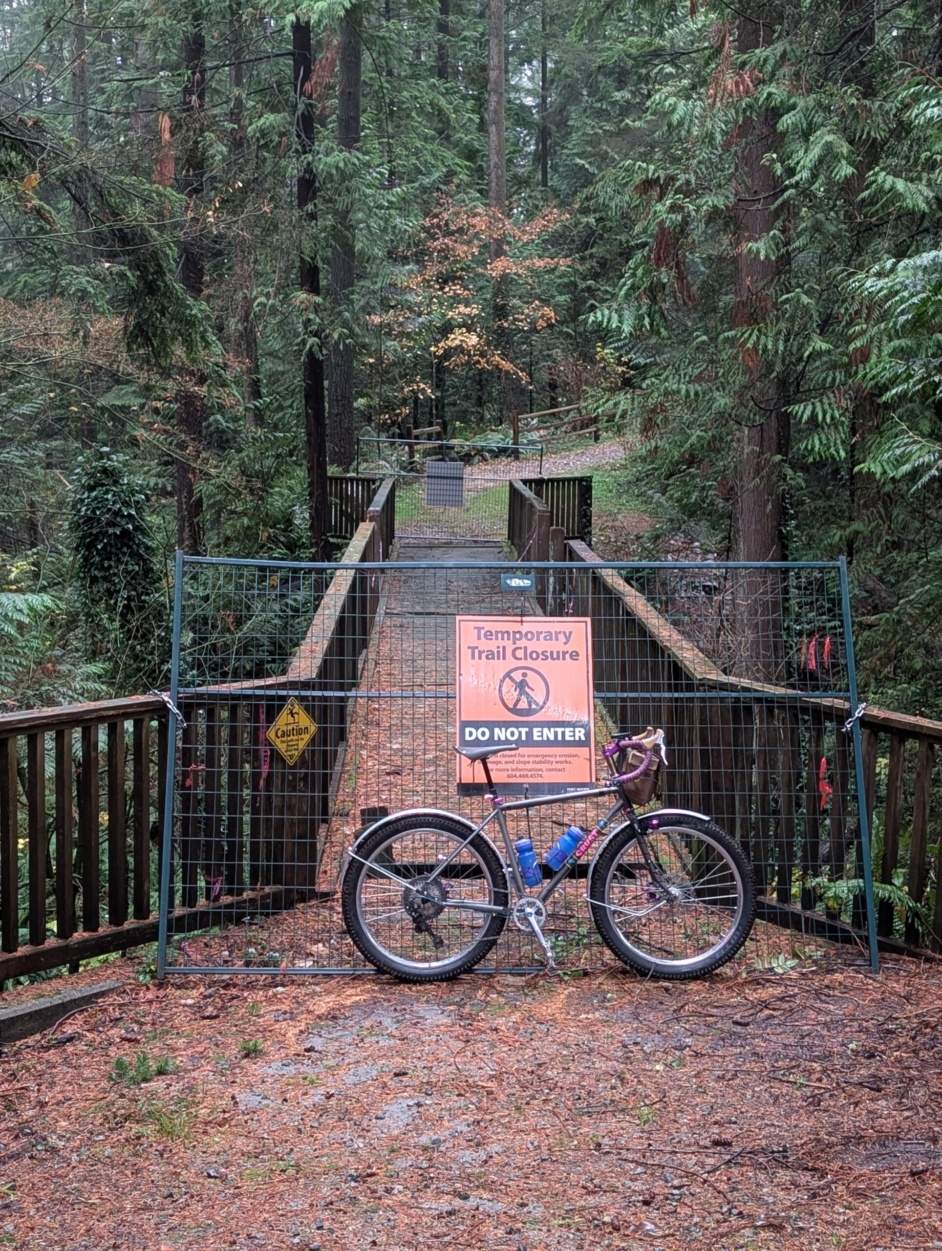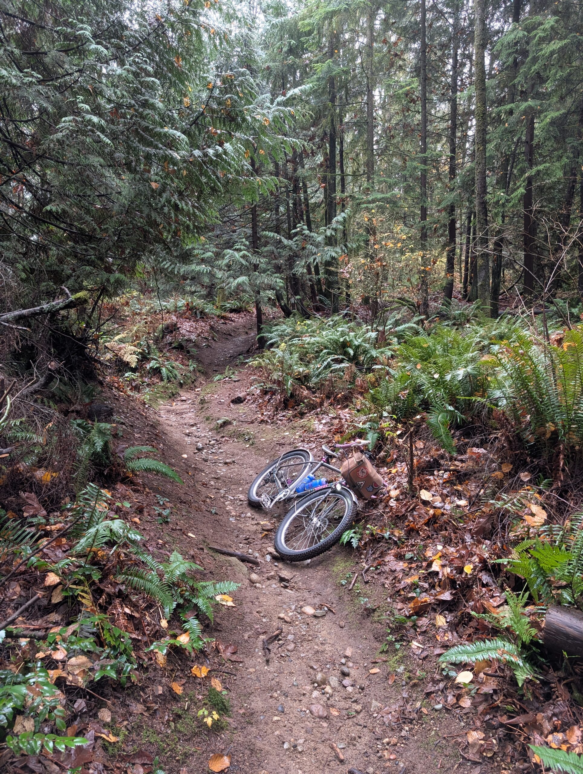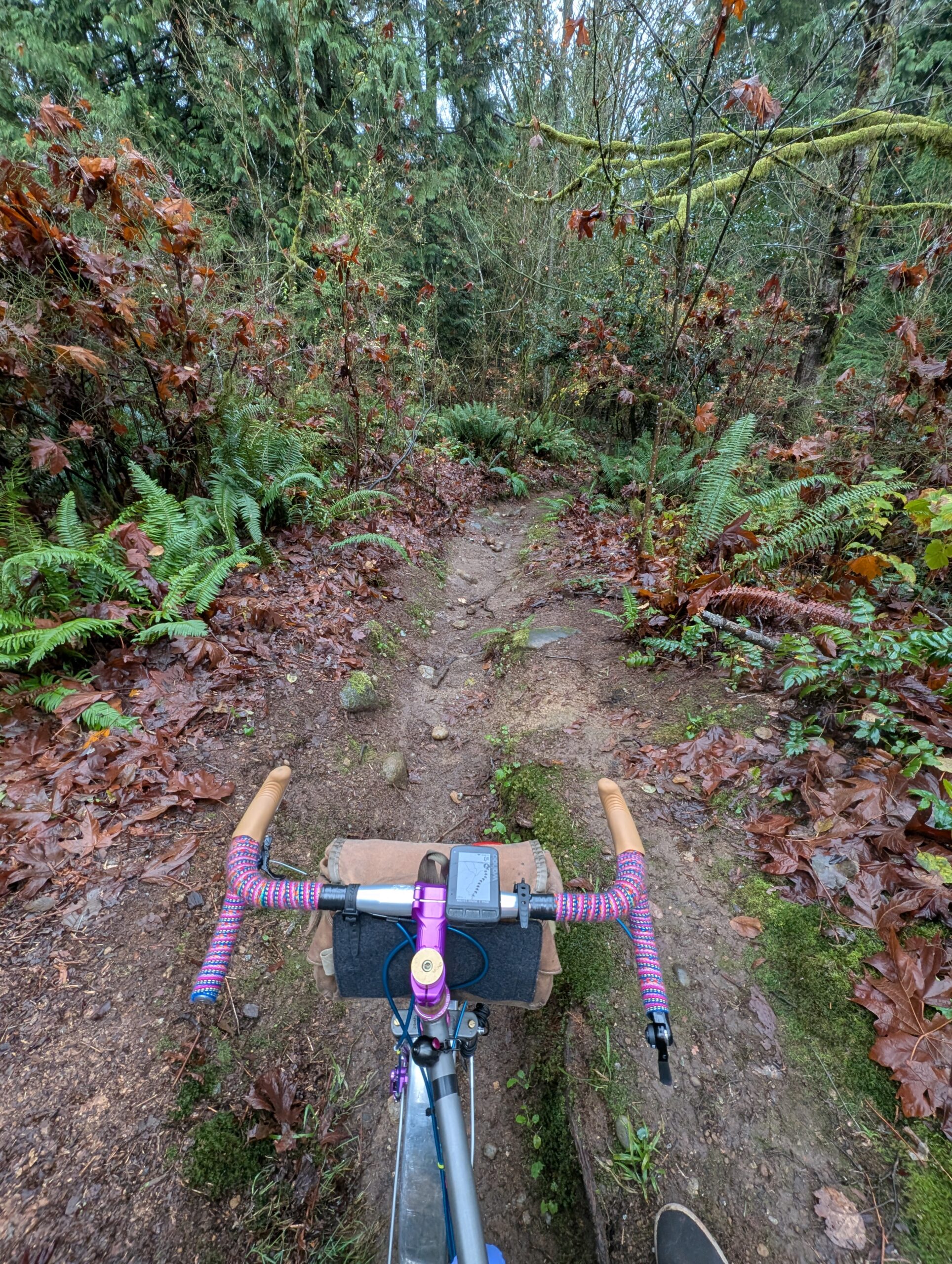 This is the second ride on my newly built up Crust Evasion, and the first one with freshly installed fenders. The weather was looking drizzly but not overly rainy, and cool but not too cold – about 7 or 8 degrees Celsius. I had noticed a trail on heatmaps months ago that piqued my curiosity, as it descended quite a significant hill next to a road climb/descent I was quite familiar with. Knowing the terrain, I knew it wouldn’t be a lot of fun on one of my Rivs, but riding out that far on my Stooge wasn’t super attractive, either.