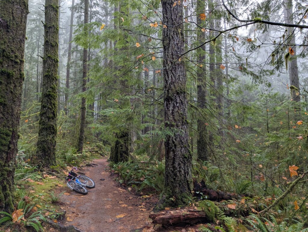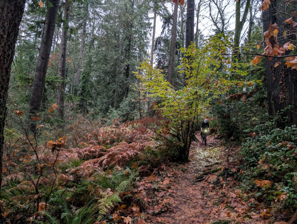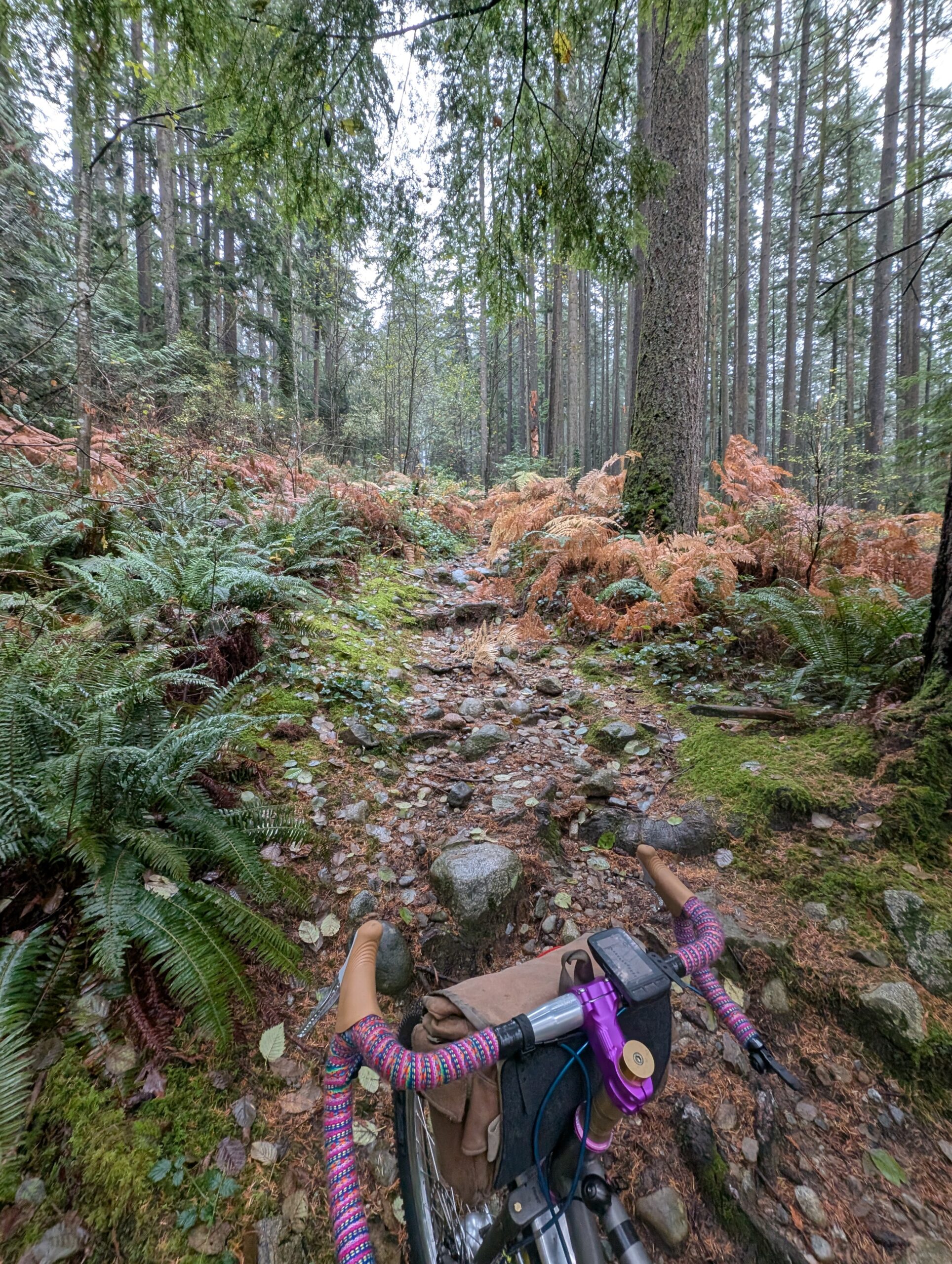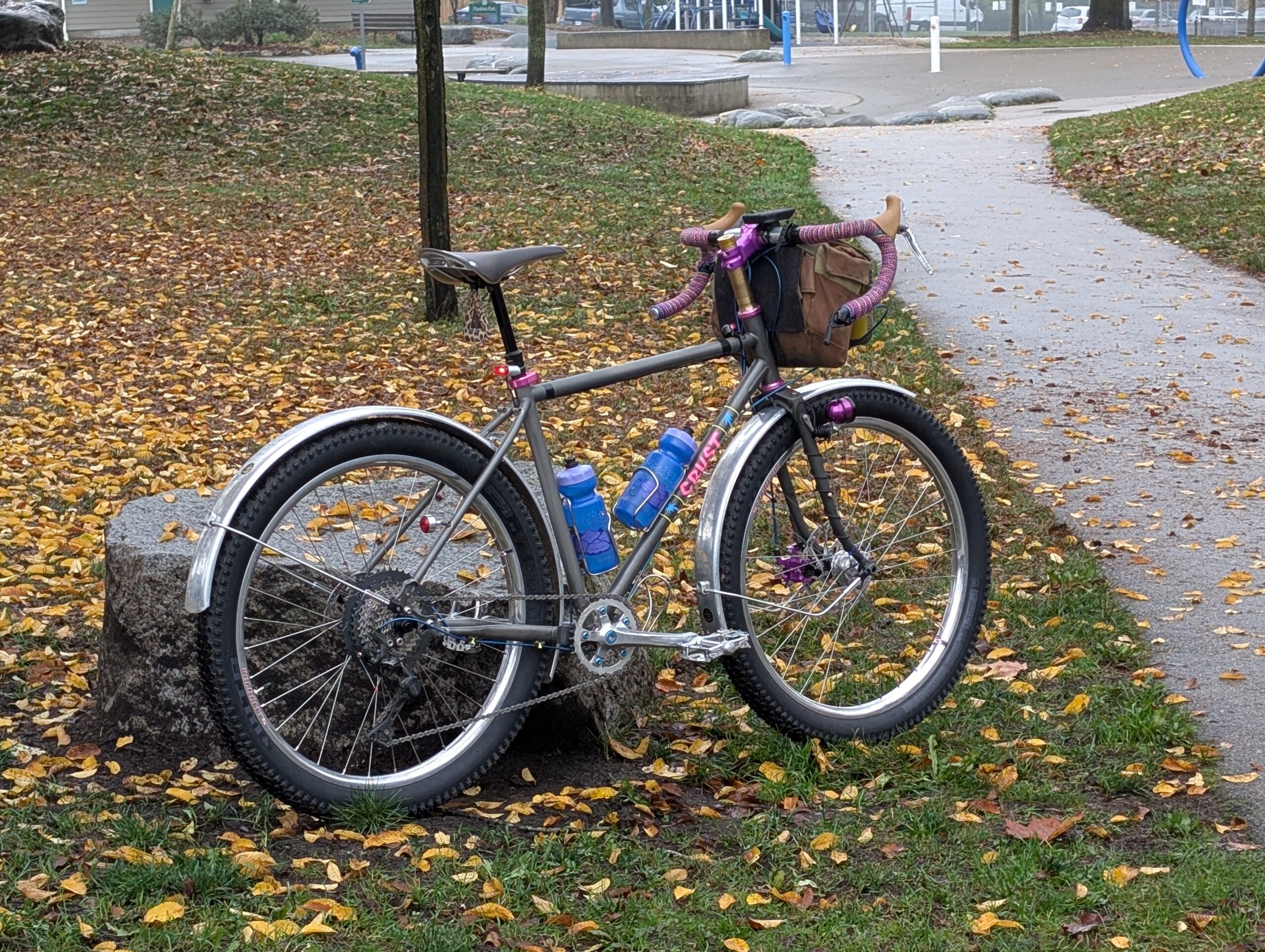 This is the second ride on my newly built up Crust Evasion, and the first one with freshly installed fenders. The weather was looking drizzly but not overly rainy, and cool but not too cold – about 7 or 8 degrees Celsius. I had noticed a trail on heatmaps months ago that piqued my curiosity, as it descended quite a significant hill next to a road climb/descent I was quite familiar with. Knowing the terrain, I knew it wouldn’t be a lot of fun on one of my Rivs, but riding out that far on my Stooge wasn’t super attractive, either.