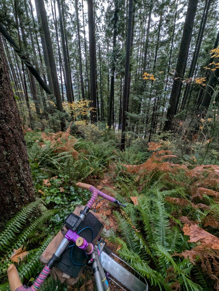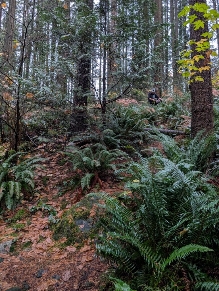 The image above right is near the top of the mystery trail we went to see. It was deeply rutted but generally rideable. Furthermore, the forest was beautiful! The trail traced along a ridge, so the forest floor fell sharply to either side of the trail for sections.