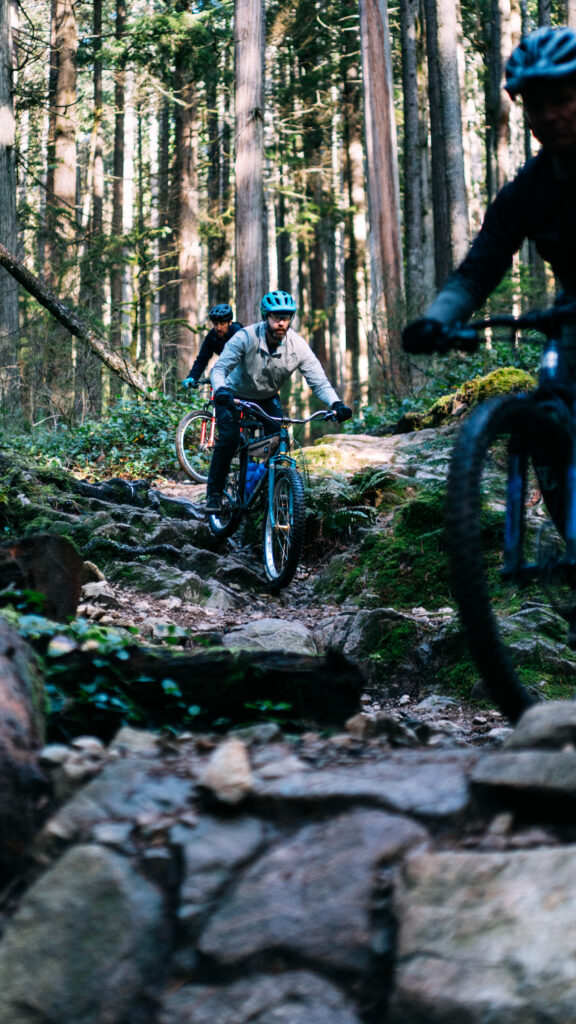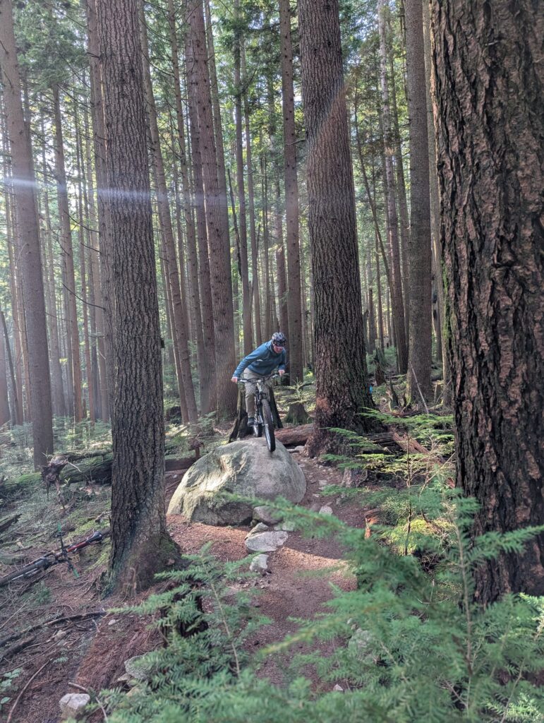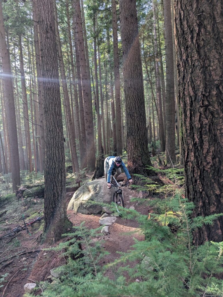 Meg got some photos of the group as well, which I’ve shared below. One of me failing to make it up a techy climb bit and am in mid-hop off the rock (I did roll away without a dab!) and descending the chunder.