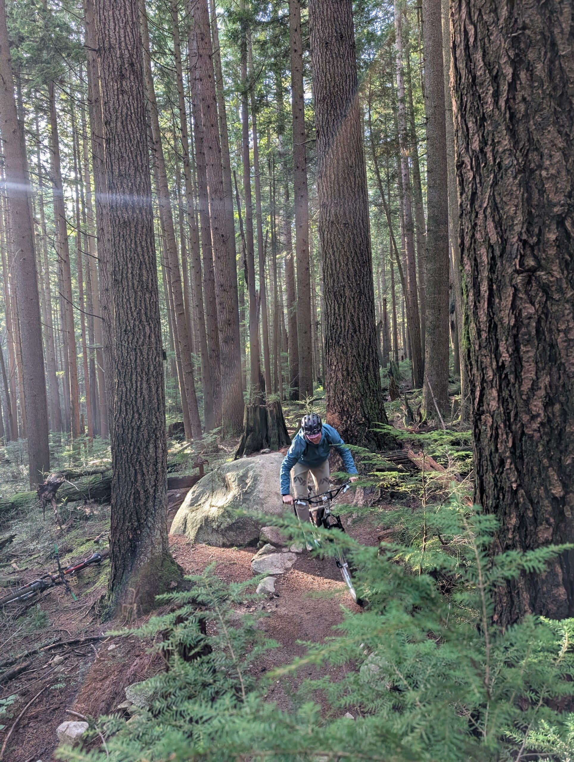 The group headed directly out from Neds to make their way to the café, but Tay and I looped over through Greenland to ride Bottletop, a short but fun trail. It was nice to have a sort of ‘cool down’ period after the socializing before heading home. Tay and I are much more aligned in how we want to experience the forest – stopping to appreciate beauty at every opportunity. Such as the light here: