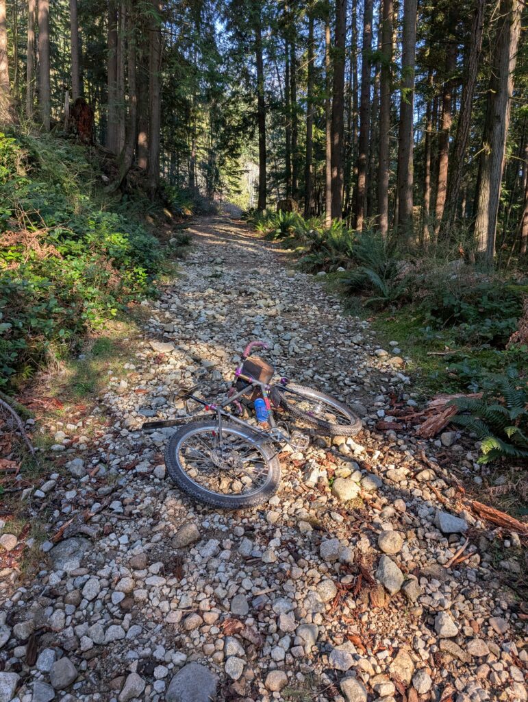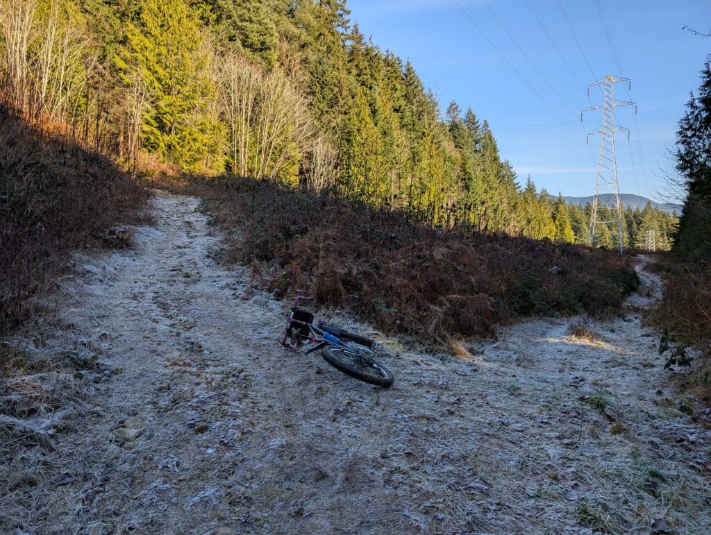 The hiking trail passed under the power lines, where a thick layer of frost had not been touched by the sun. The Evasion’s 2.8″ tires were a perfect match for this chunky wide trail – after the powerlines, the trail narrowed and became unrideable, but thankfully it wasn’t much further to go.