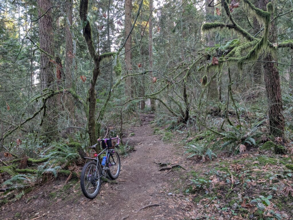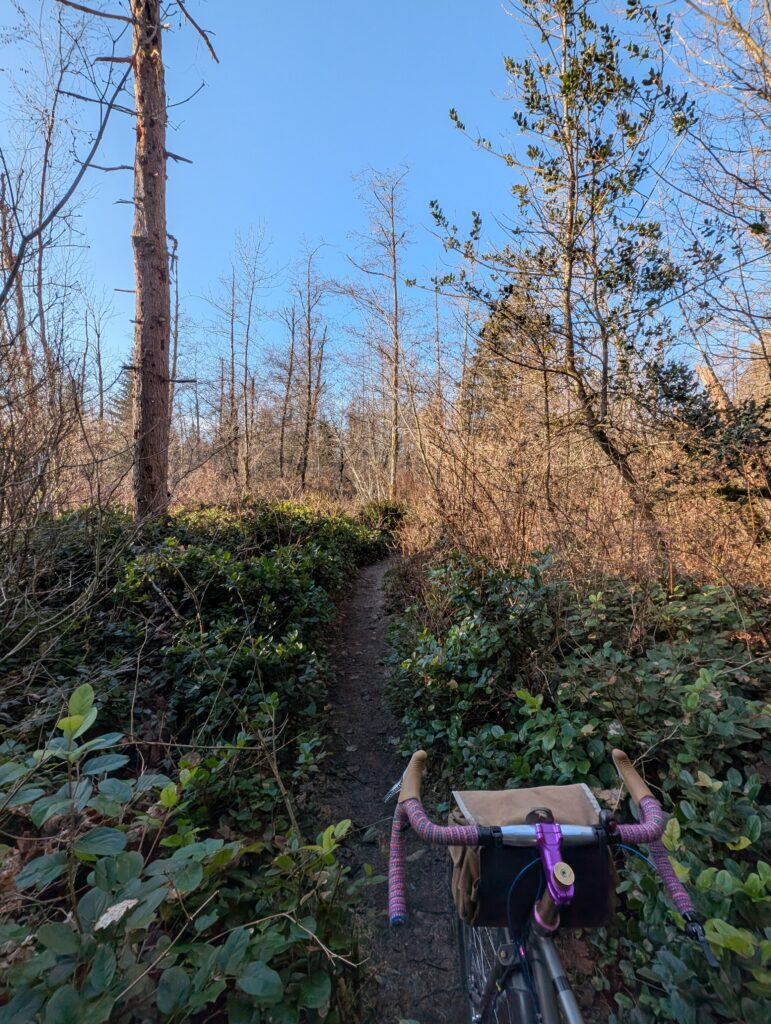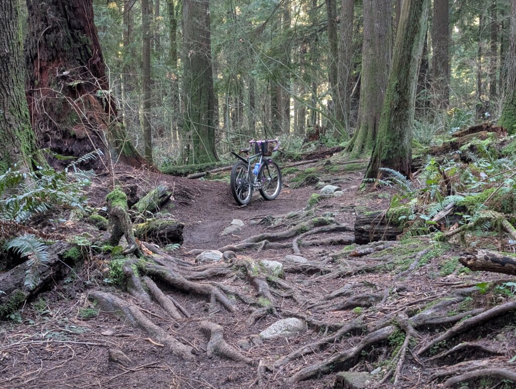 With some aid from trailforks, I managed to stay in the woods for much of the traverse back towards the city. It included short sections of hike-a-bike, but mostly I was on technical (but not too difficult) XC type trails. The Evasion is quite well-suited to these trails – I do find these ergonomic levers to be a bit difficult to hold onto when trying to both grip them sufficiently for the rough stuff and also operate the brakes, so that’s a limitation, and the wheelbase is short enough that you do have to be mindful going over roots and rocks as soon as it gets a little bit steep – I haven’t gone OTB on this bike yet but I could see it happening if I’m not careful.