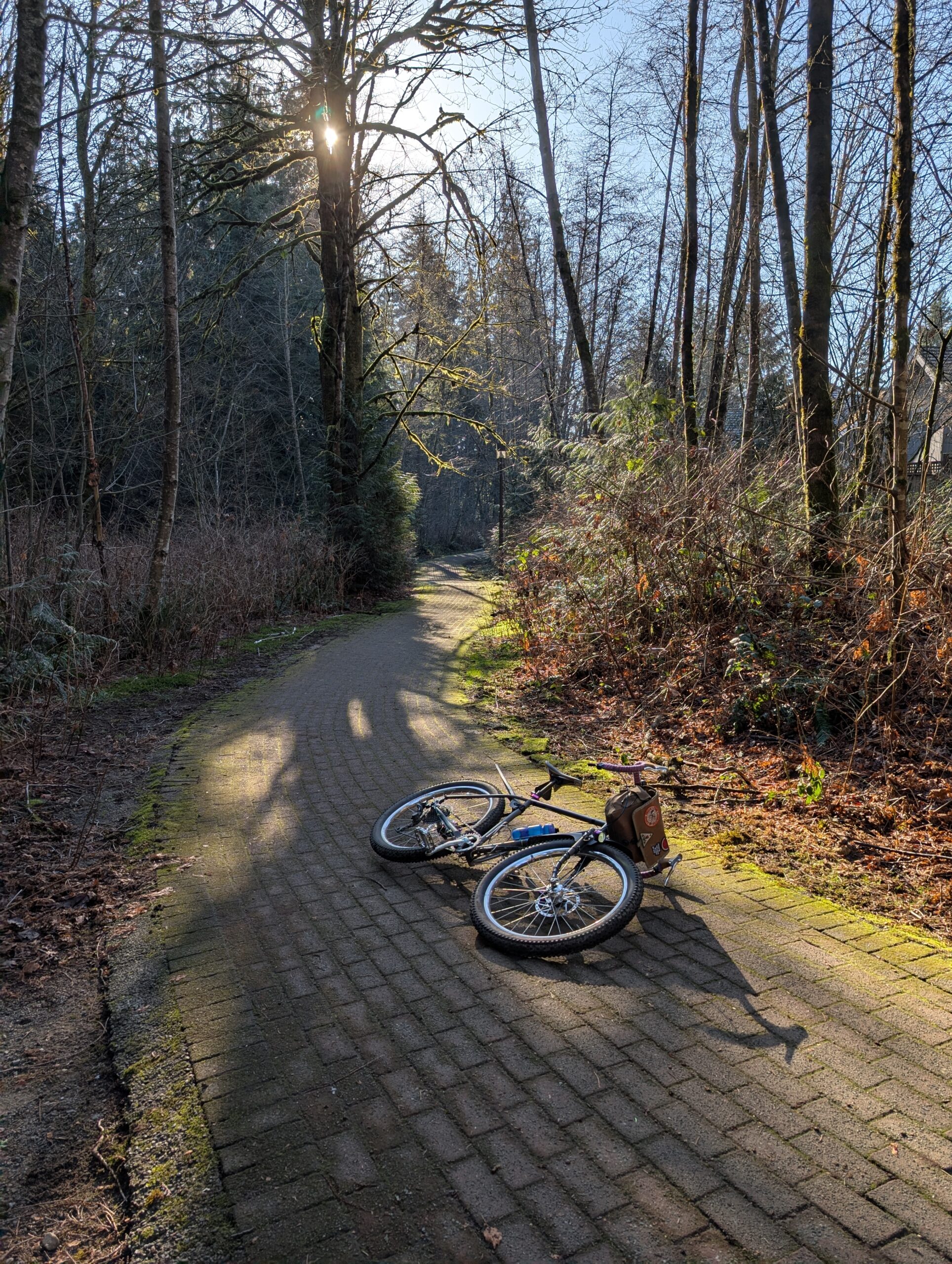The hiking trail passed under the power lines, where a thick layer of frost had not been touched by the sun. The Evasion’s 2.8″ tires were a perfect match for this chunky wide trail – after the powerlines, the trail narrowed and became unrideable, but thankfully it wasn’t much further to go.