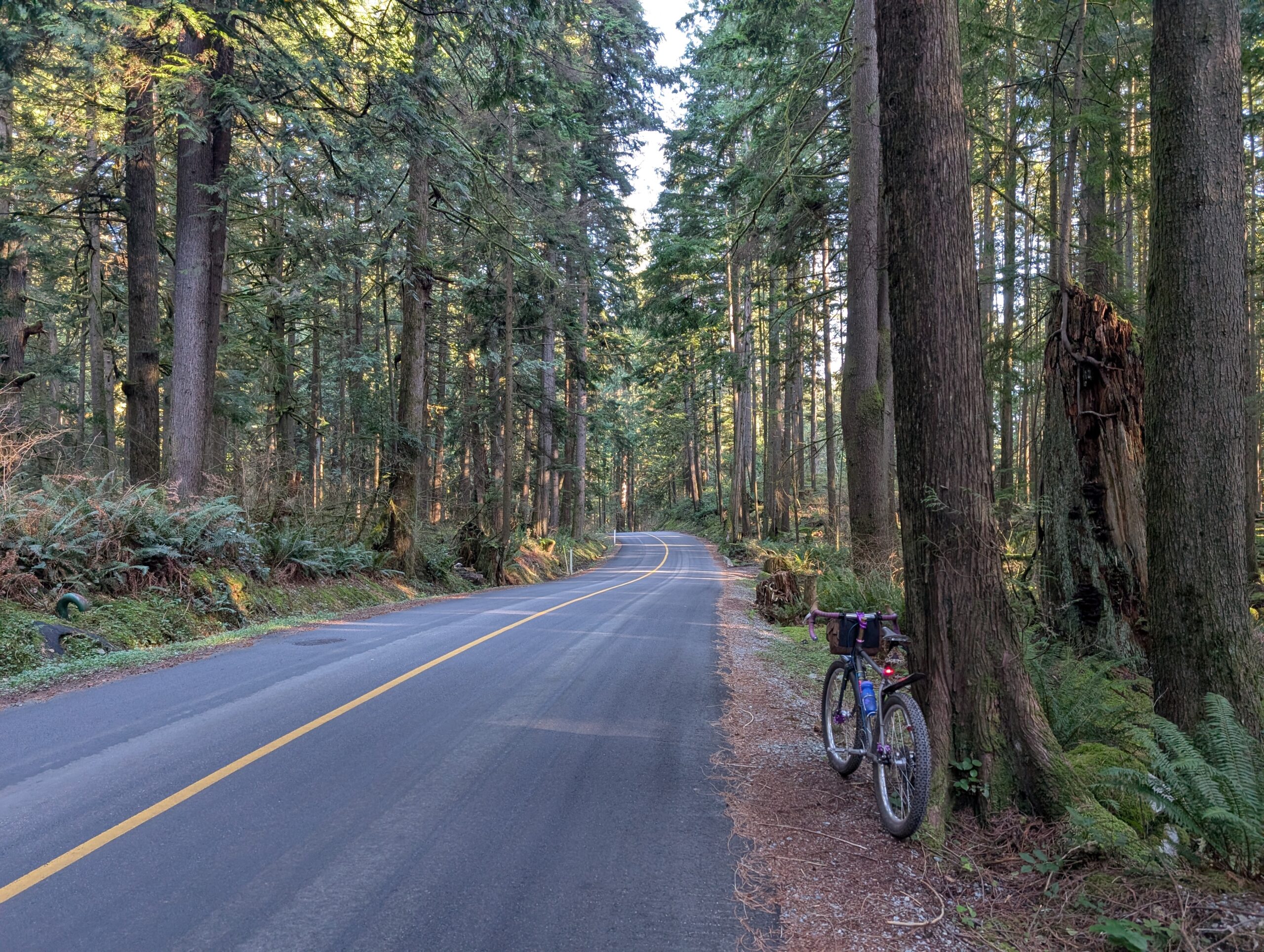 Indian River Drive is a unique road around here – relatively newly paved, it passed through miles of intact forest to reach a small community of houses further up the inlet from Deep Cove. It’s popular with roadies because at its end, it drops down about 150m to sea level with brutally steep switchbacks, making for an exciting descent and challenging climb.