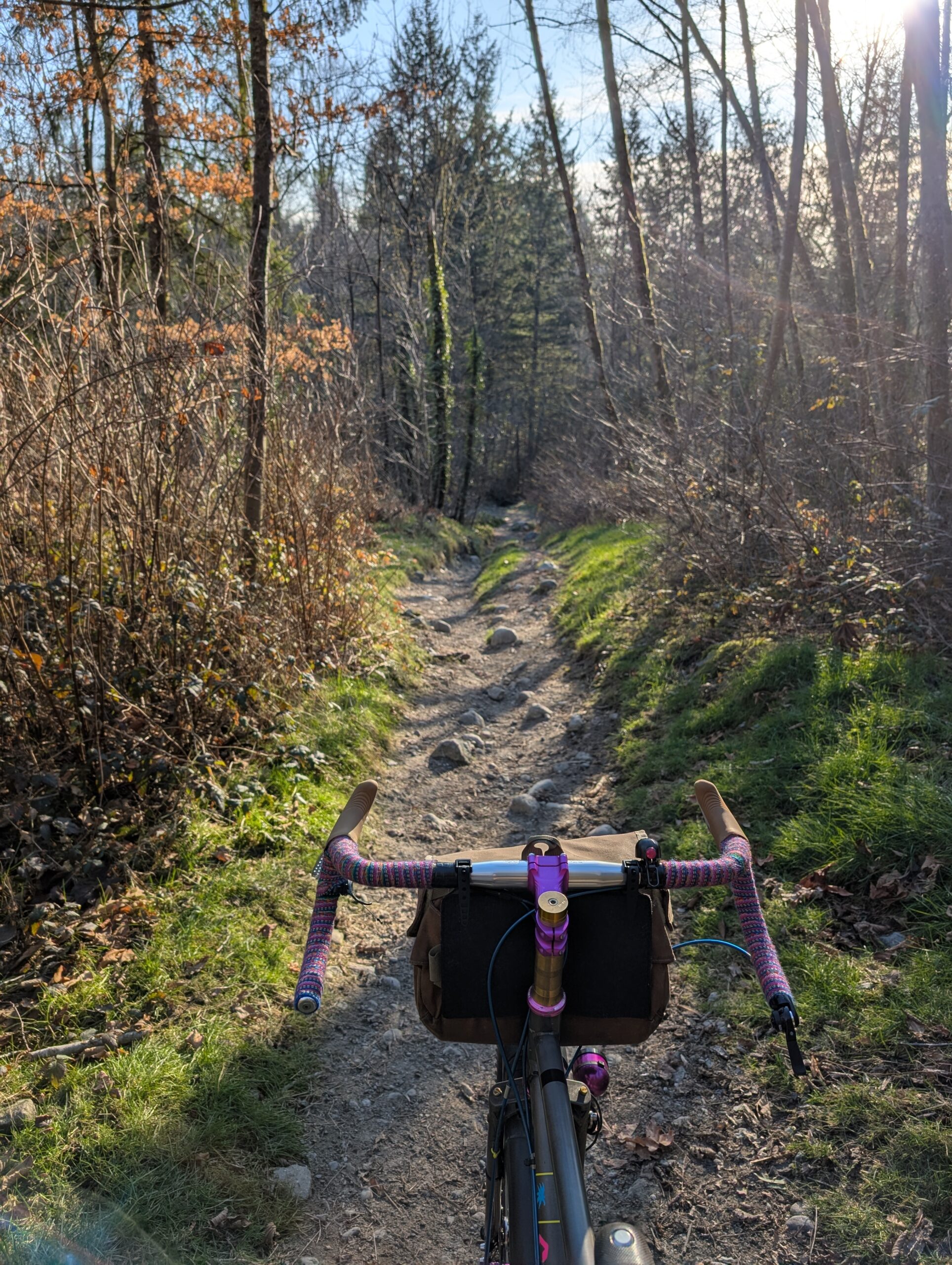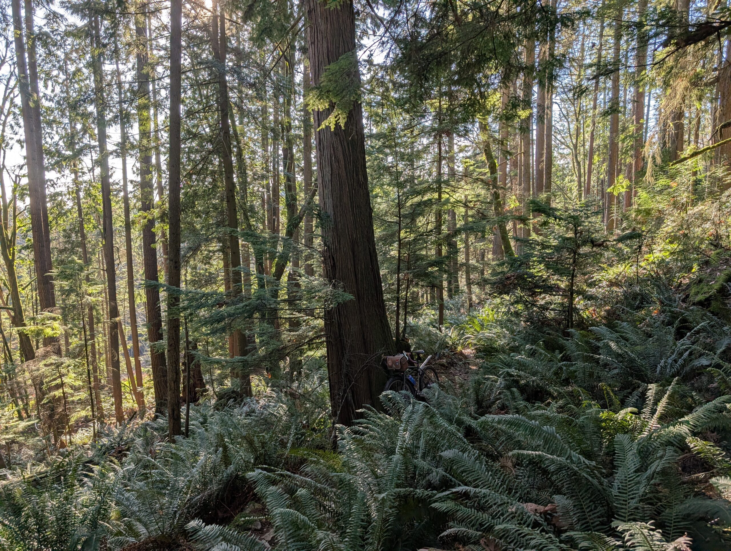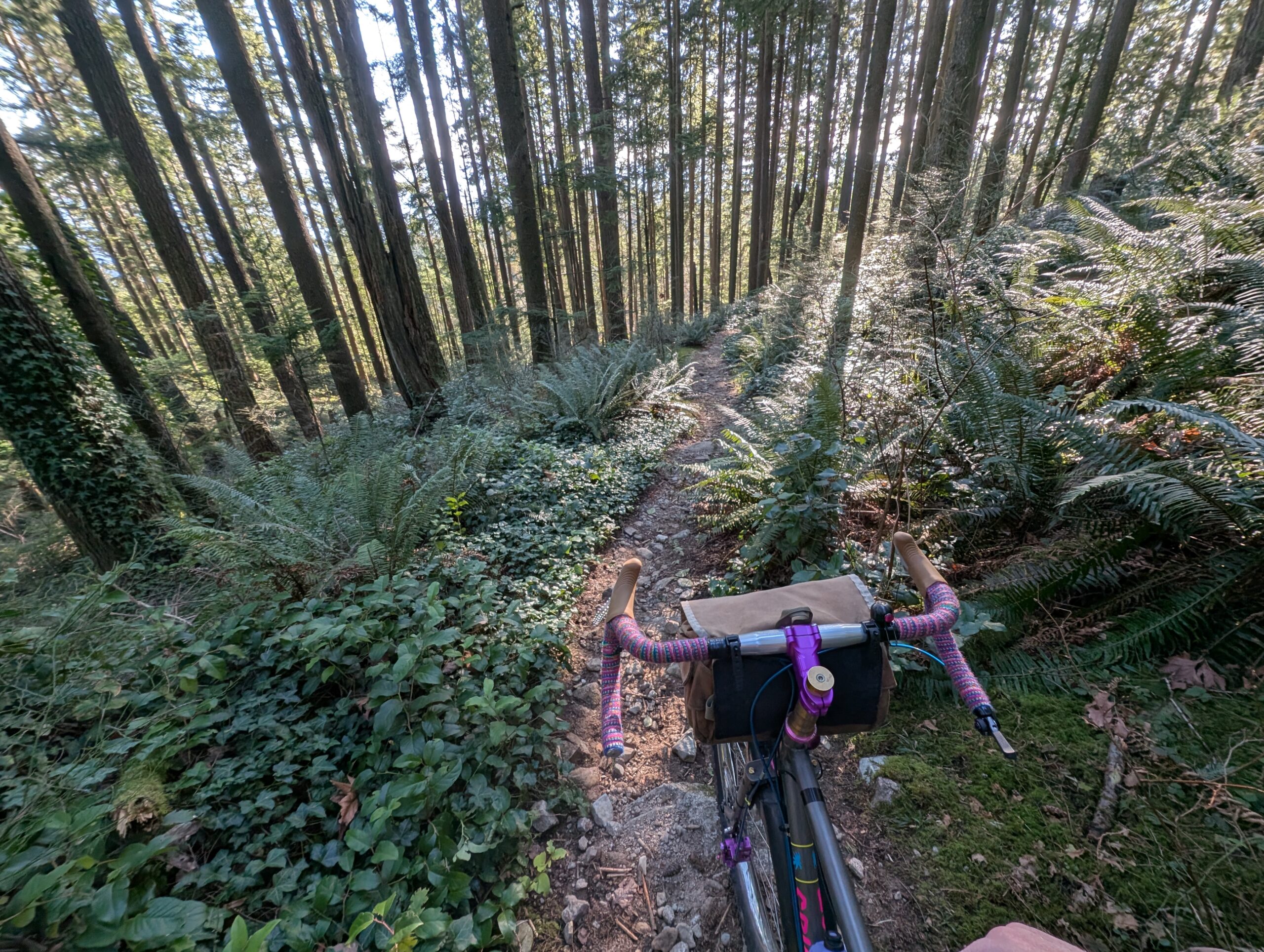 With some aid from trailforks, I managed to stay in the woods for much of the traverse back towards the city. It included short sections of hike-a-bike, but mostly I was on technical (but not too difficult) XC type trails. The Evasion is quite well-suited to these trails – I do find these ergonomic levers to be a bit difficult to hold onto when trying to both grip them sufficiently for the rough stuff and also operate the brakes, so that’s a limitation, and the wheelbase is short enough that you do have to be mindful going over roots and rocks as soon as it gets a little bit steep – I haven’t gone OTB on this bike yet but I could see it happening if I’m not careful.