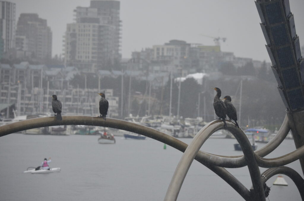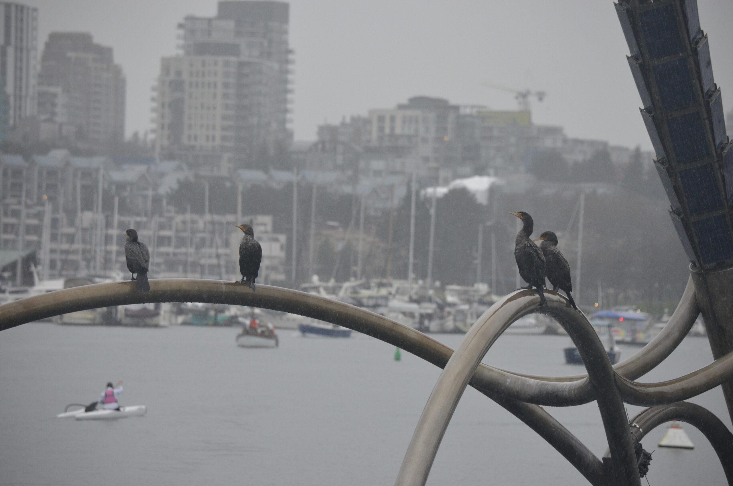Another phone photo of four cormorants watching the kayakers along false creek inlet.