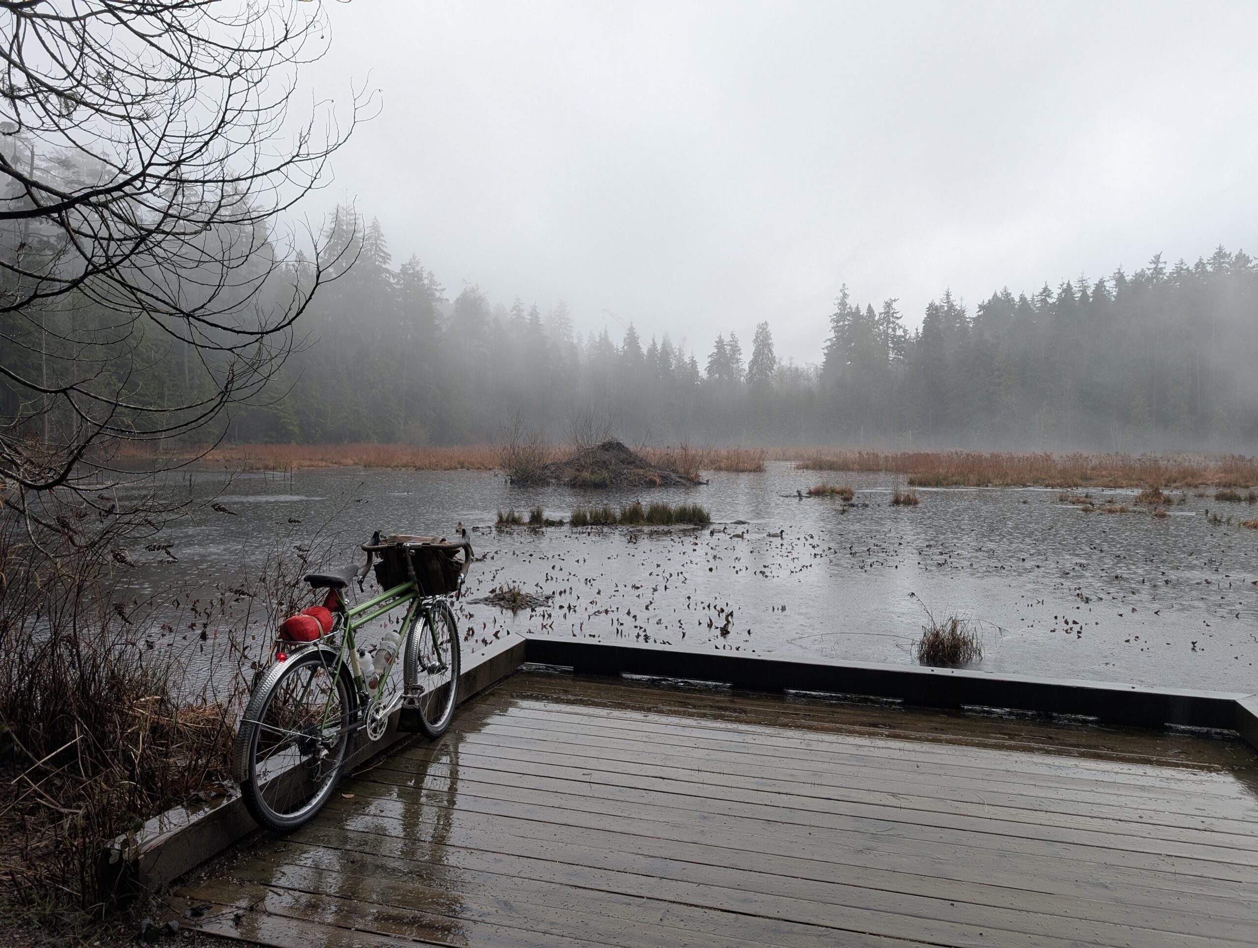 Riding through the forest in the rain is quite lovely, but I had it in my mind I’d go get some water fowl photos at the pond at Ambleside Park, known for a good selection of birds. My poncho did a good job for a while, but the rain and wind both picked up and left me pretty soaked after a while.