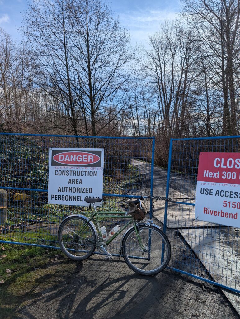From there I wanted to check on a construction closure in Fraser Foreshore because it was a part of my Burnabop XL route but has been inaccessible for the past year and a bit. Turns out it’s going to be a while yet unfortunately.. large scale utility work going in. Guess I’ll need to plan the route accordingly – shame, this connection was rather wonderful.