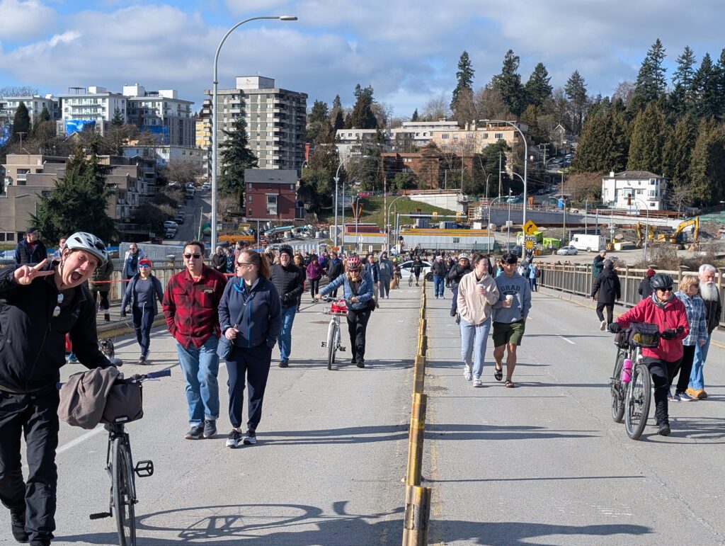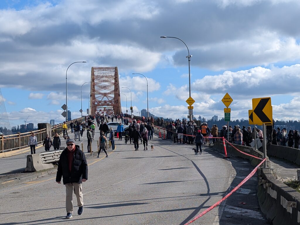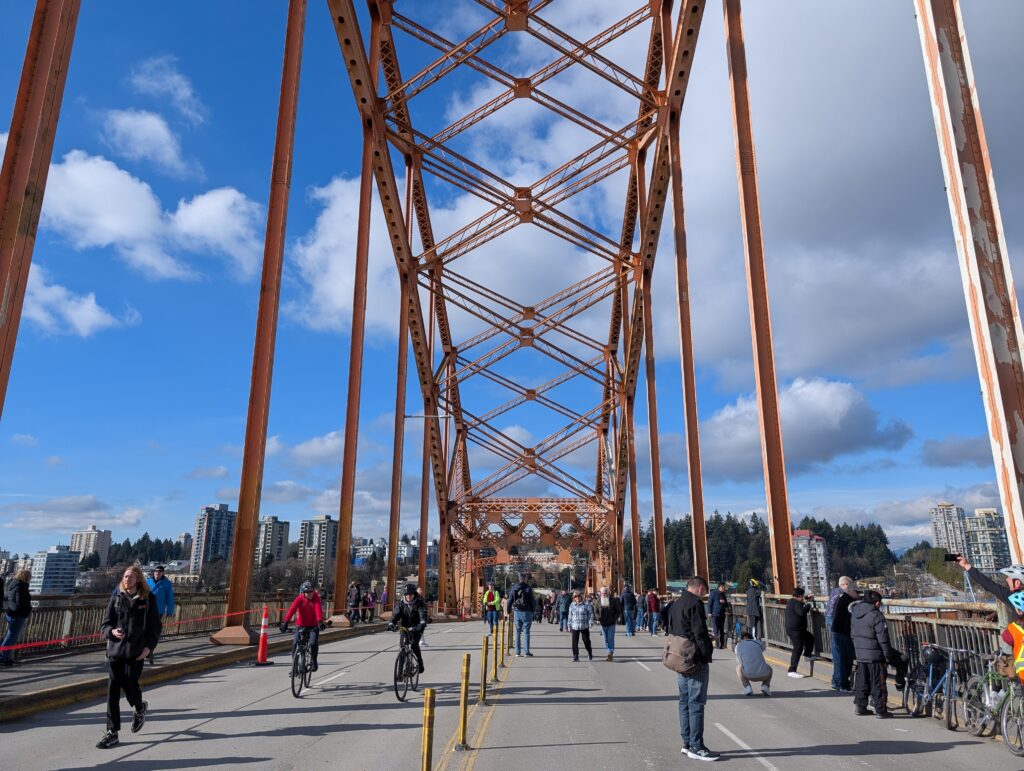 After a reasonably challenging ride yesterday, I managed to get out for a bit bigger one today (albeit flatter) to see off the Patullo bridge, whose decommissioning work begins in two days. A few friends were also interested so we met there, and apparently many others had the same idea – it was packed! They had a big line to get onto the bridge deck even, though that fell apart after a while (and I’ll admit I challenged it and ended up just cutting in). I think they vastly underestimated how many people would want to walk along a bridge deck in the sunshine on Sunday, knowing its imminent demise.