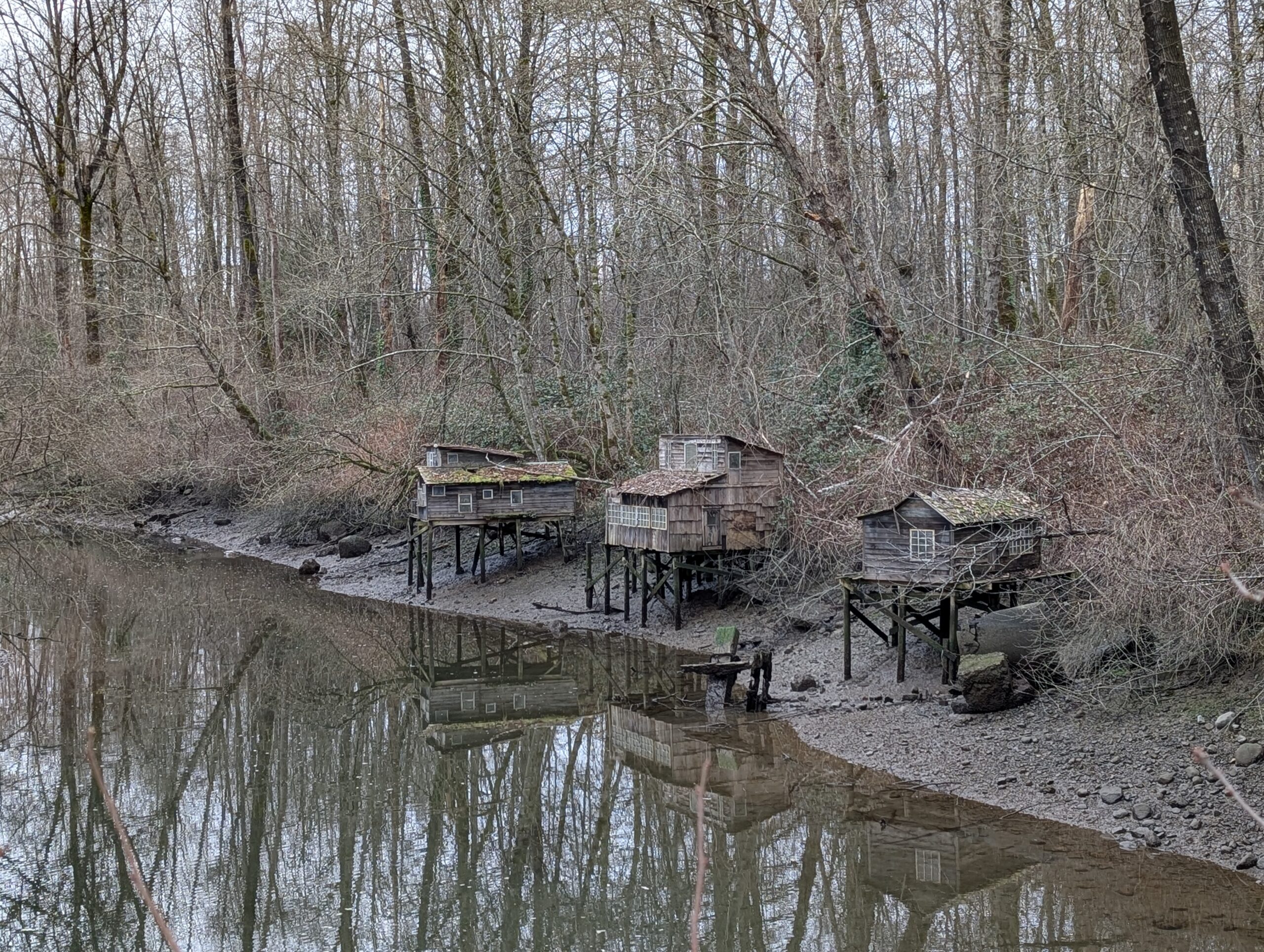 I’m currently too under the weather to ride, so instead I went for a walk around Maplewood Flats in North Vancouver with my old DSLR and photographed some birds. As you come into the nature preserve, there are these scale models of the now-gone squatter shacks that used to exist along the mudflats. Pretty cute.