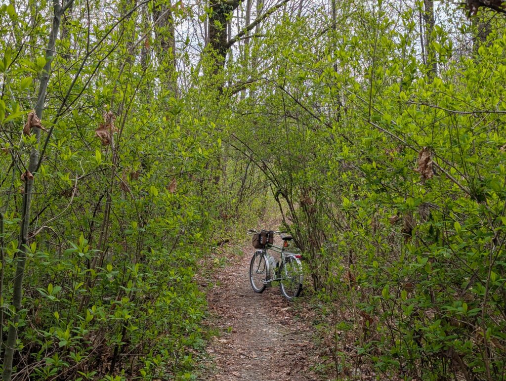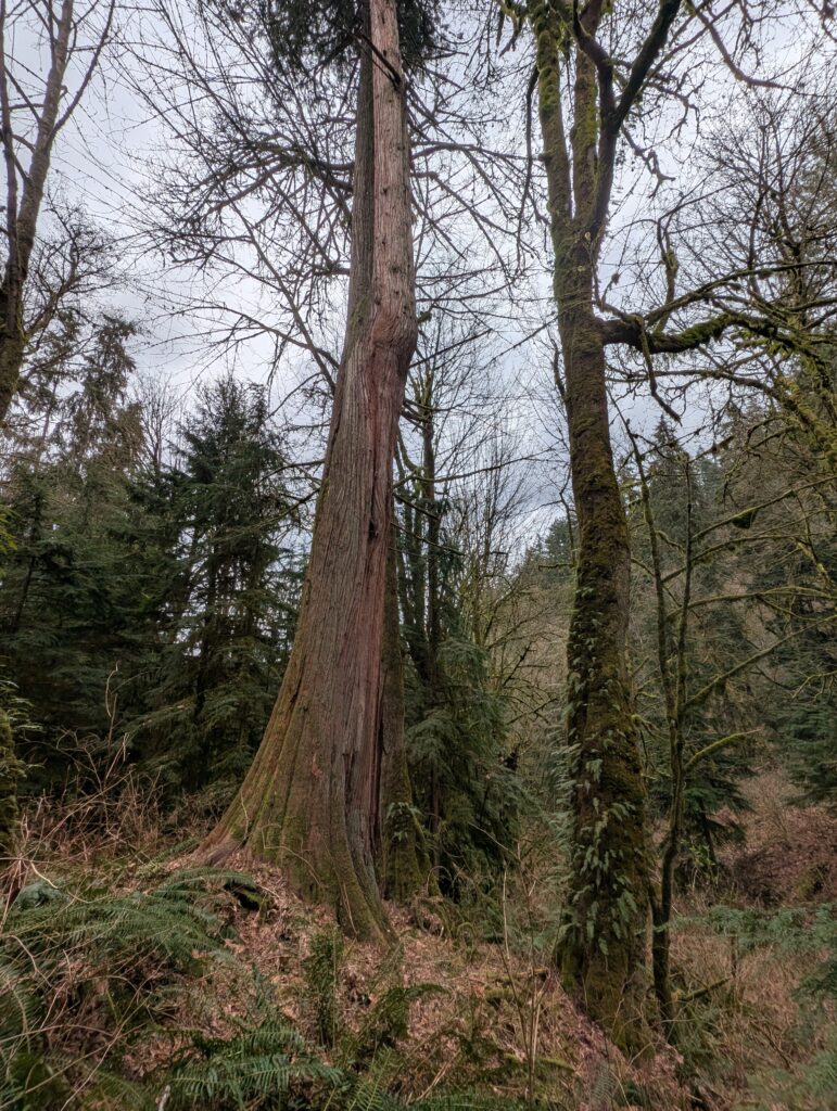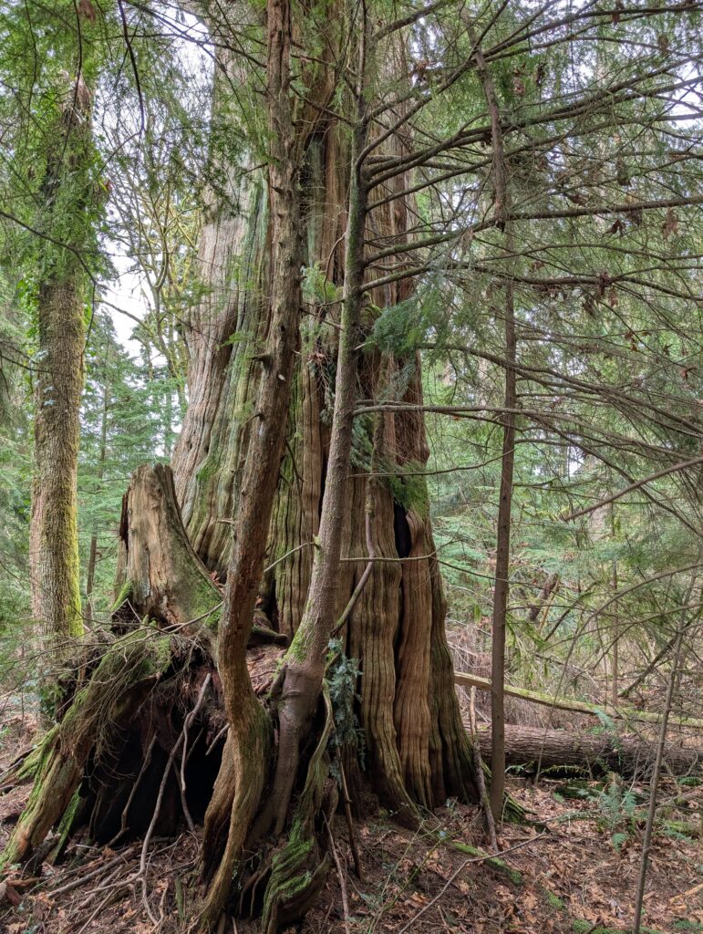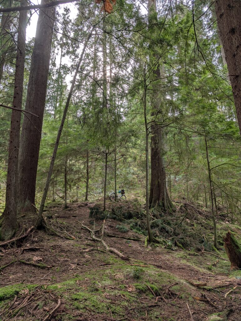 Below is another older cedar, and where I parked my bike. I realized as I clamoured through the woods without a trail that finding my bike could become less straightforward than ideal – but turned out fine, I was well bounded by the terrain.