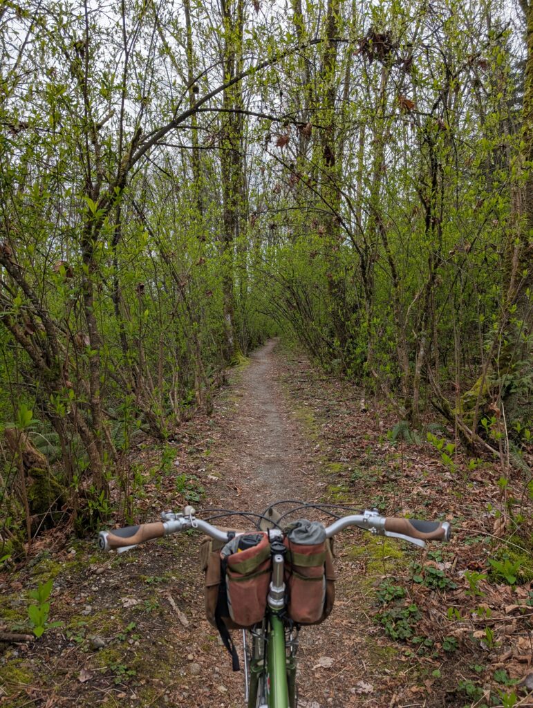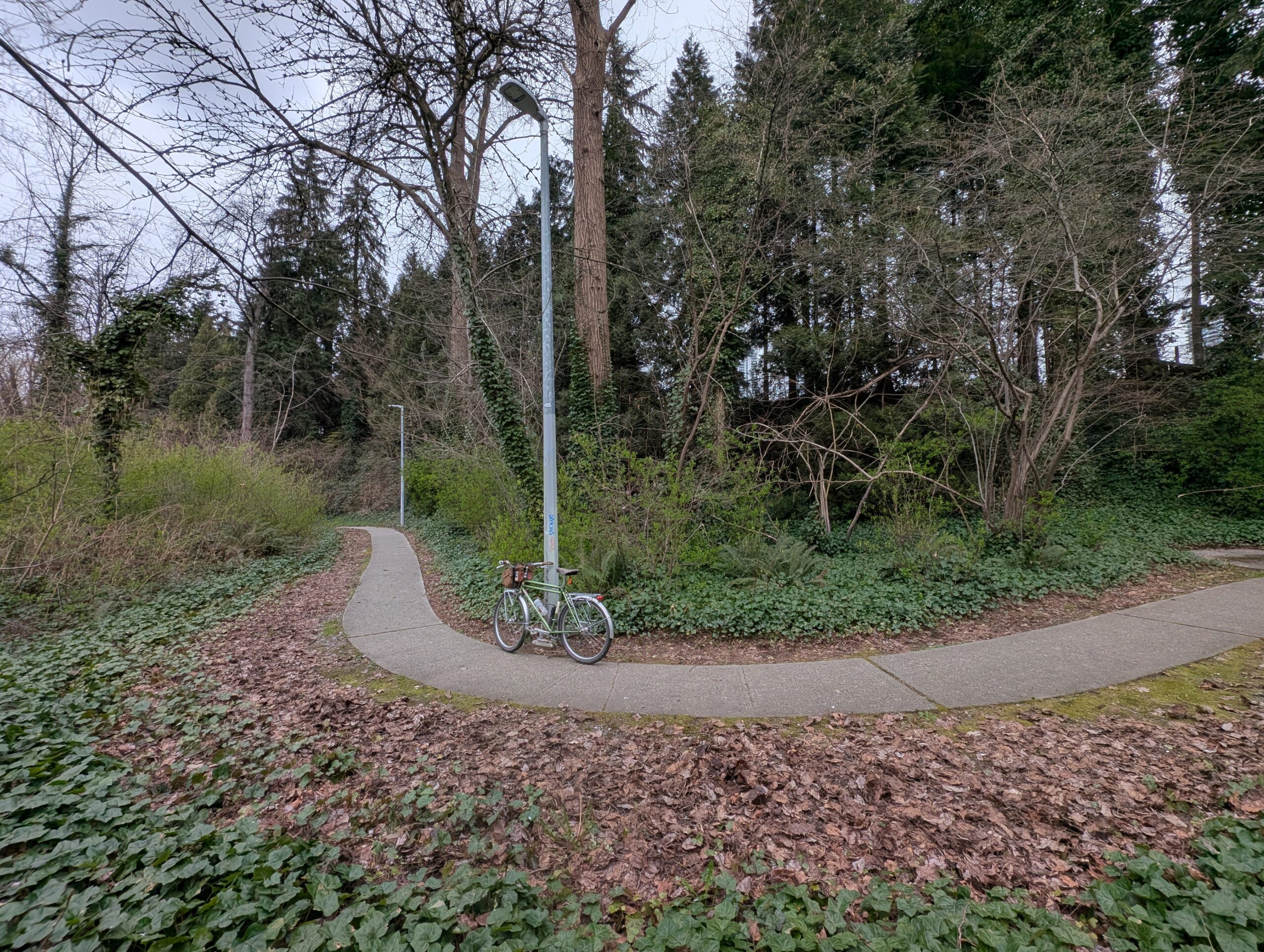 I keep a checklist of rides I want to do so that I can draw upon it for inspiration when it comes time to go for a ride, if I need help with deciding where to go. Two items on that list were riding out to an area about 20km east to try out some pathways I’d seen on google maps, and also to explore the north face of Burnaby Mountain a bit (with the stretch goal of a route from the upper trails to the lower trails). I combined them into one ride today aboard the Bombadil, and took one of my favourite paths to get out there, this old inter-urban rail trail that is basically unknown outside the locals who care for it: