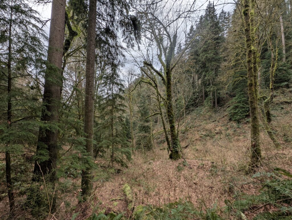 I noticed a hint of a trail off the “real” trail into an open area and decided to follow it, carrying my bike until it was well concealed from the trail then locking it in place. To my surprise I found some pretty old Western red cedars pretty quickly; perhaps they are the reason for the off-shoot trail. I also came across a wide creek ravine, below, where I listened to some Varied Thrush make their distinctive call. I still haven’t seen one, despite hearing them on multiple occasions.