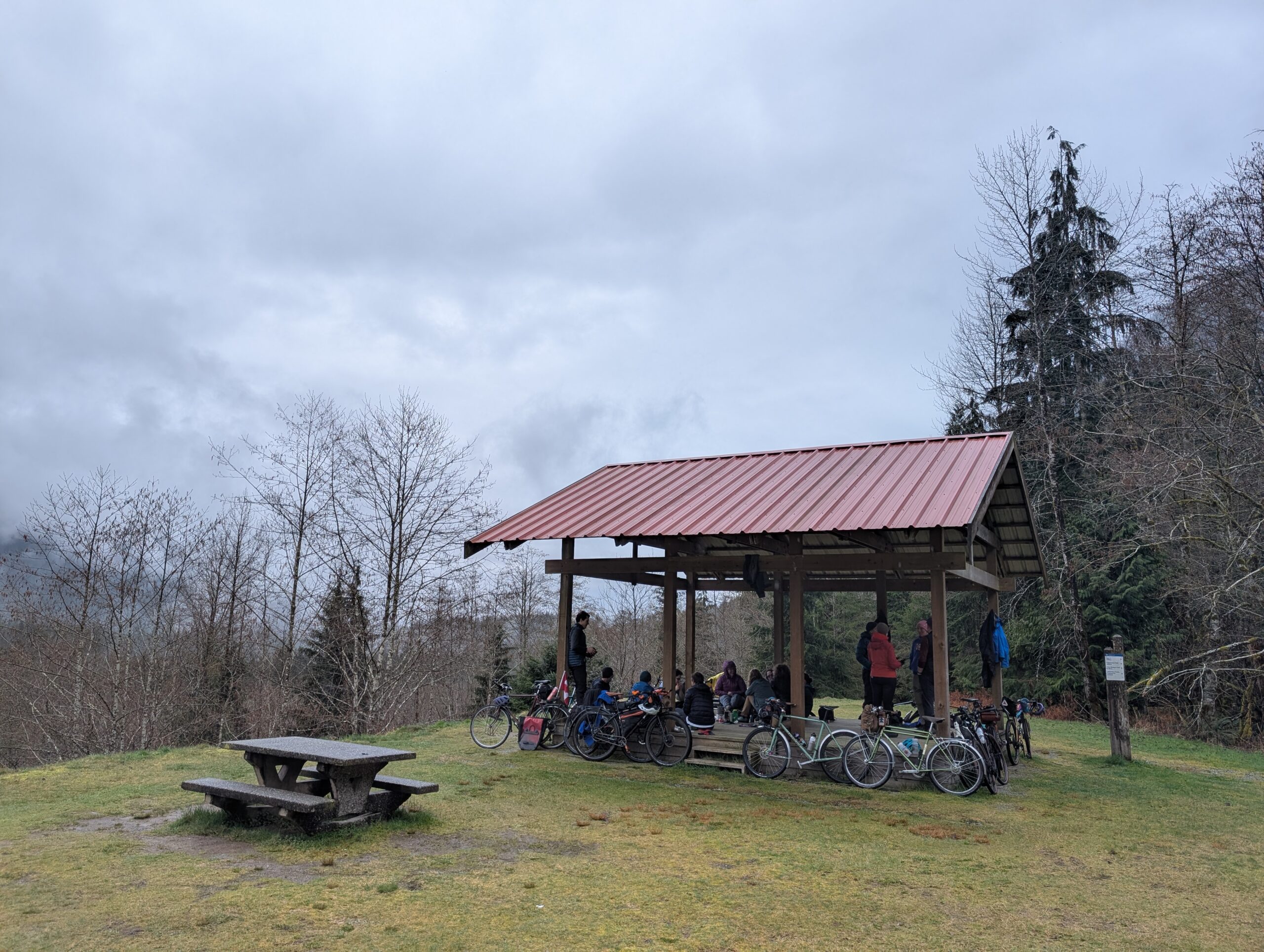 I rode up Fishermans with Tay to the spot. The day was cloudy and rain felt not far off, so I expected as we moved up the valley it would turn wetter as it usually does. However the rain never amounted to more than a sprinkle, and only occurred while we were under the protection of the gazebo. Lucked out!