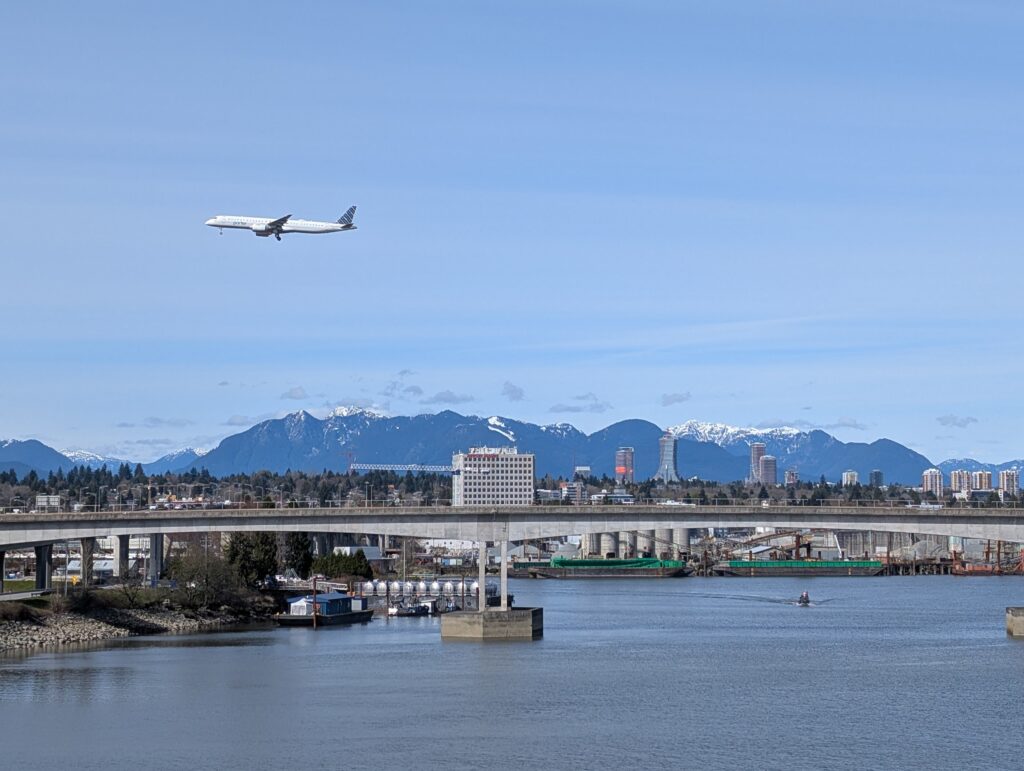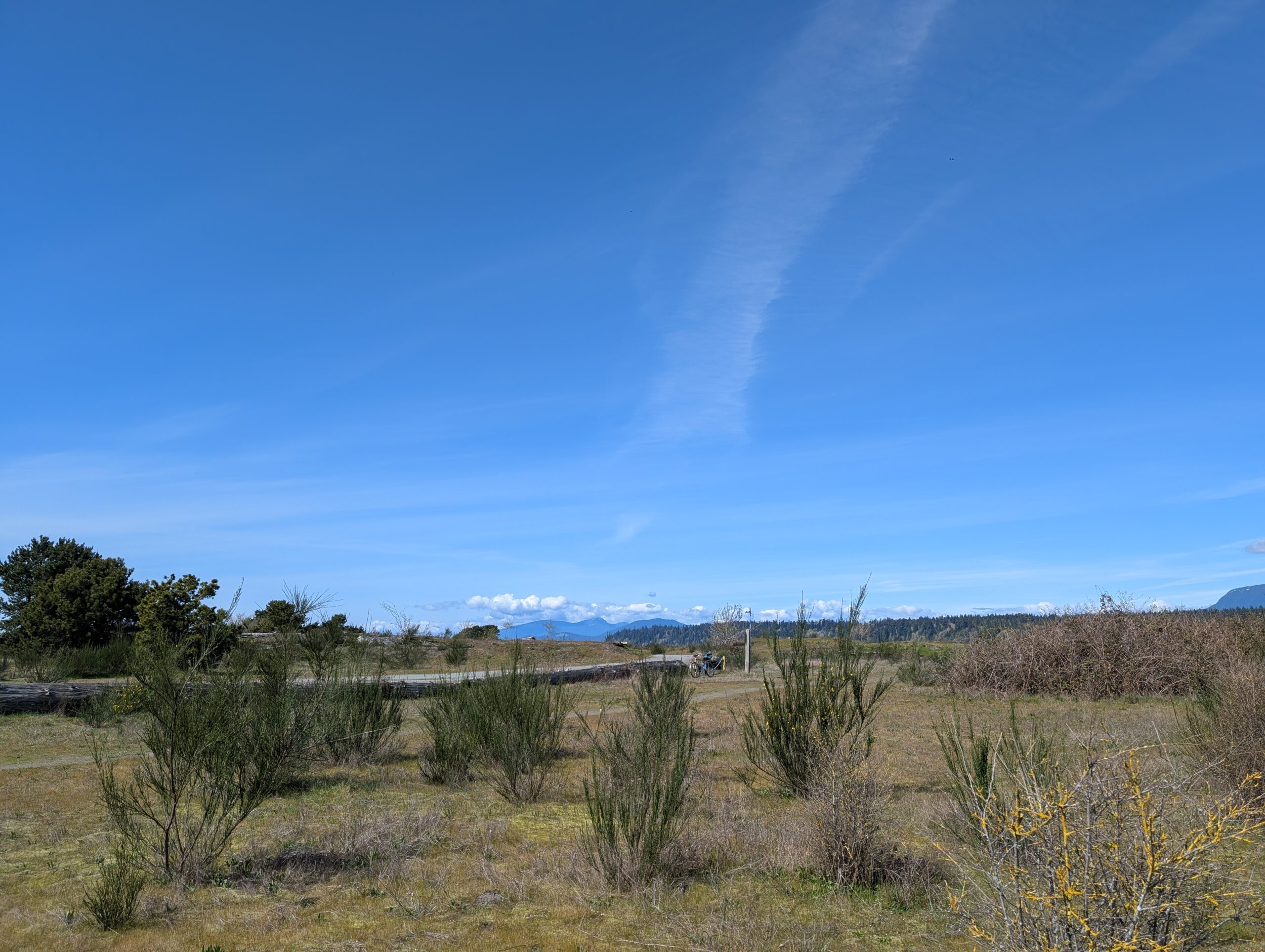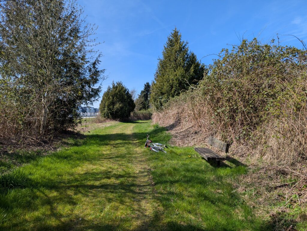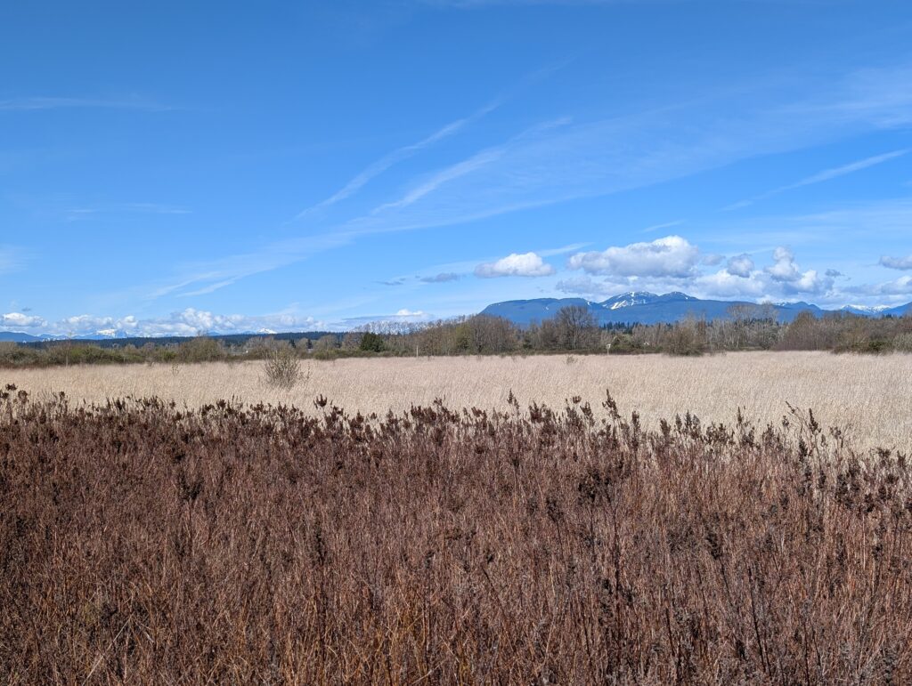 Back on the paved path, admiring this view to the north – just past these grasses is the Fraser River out of sight, then Vancouver beyond that.