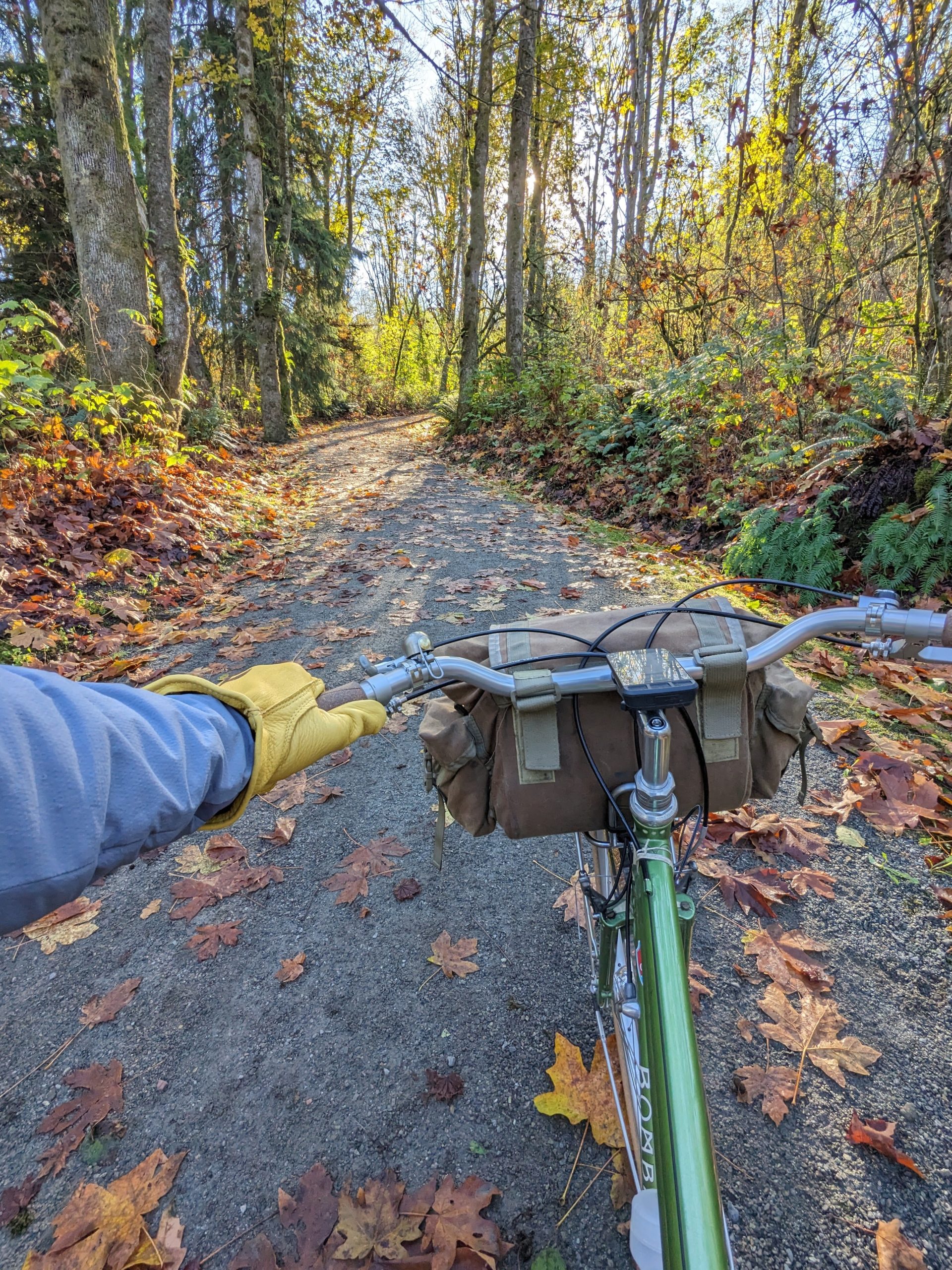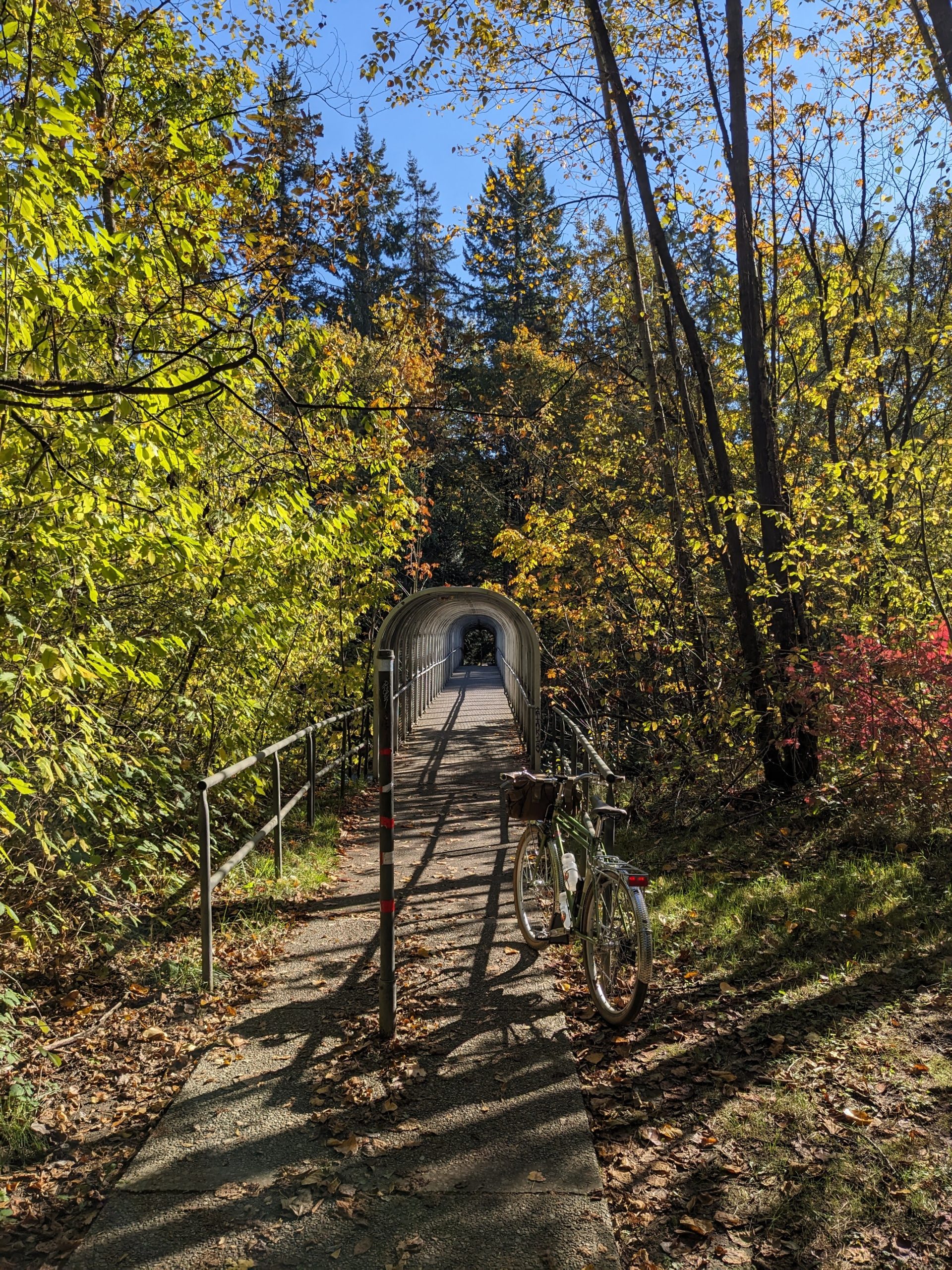 This stretch is probably my favourite of the whole course; it’s rail grade so nearly flat, yet narrow and rooty enough to keep you occupied. And the foliage! At some point the trail passes under powerlines and it’s easy to forget that you’re in a suburban area. I mean, just look at this! Of course, autumn cannot be beat for beauty in these largely deciduous groves.