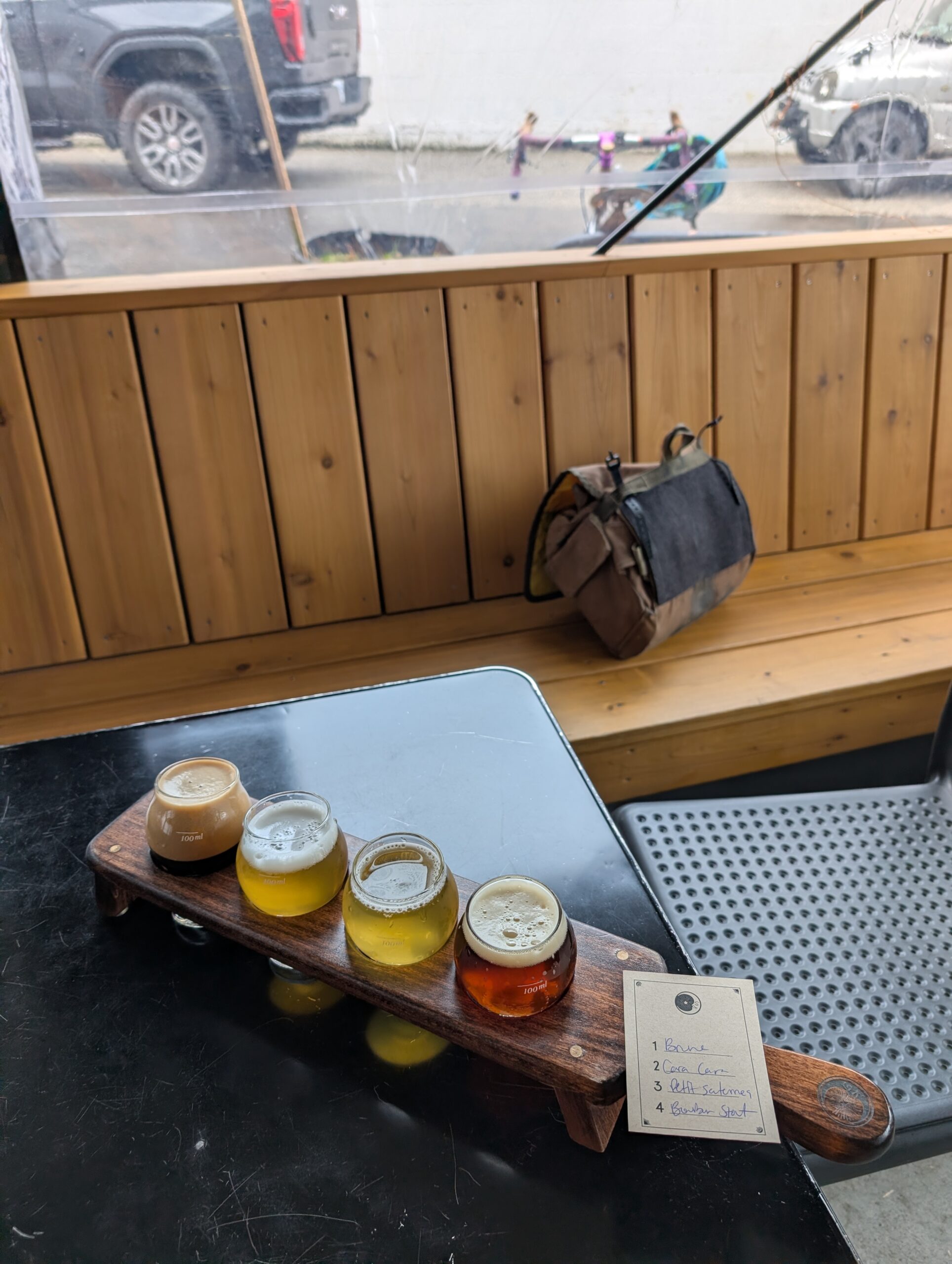 The Shed draws a funny mix of people based on its location – the extremely challenging MTB trails that Cypress is known for tend to dump out here, so there’s a bunch of dirtbags with full face helmets and DH bikes, there’s well-dressed and wealthy-looking folks who are here for the developer’s visitor centre, plus there is no shortage of tourists as well. In fact, someone from Toronto spotted the Hoop Driver (a cool bike shop in TO) on my bike when passing by. I got an overpriced IPA (below, left) while felt fairly priced given I was able to enjoy both a propane fire and view while drinking it. I also got a pretzel which took far too long to be ready, but then was rather incredible so I couldn’t complain.