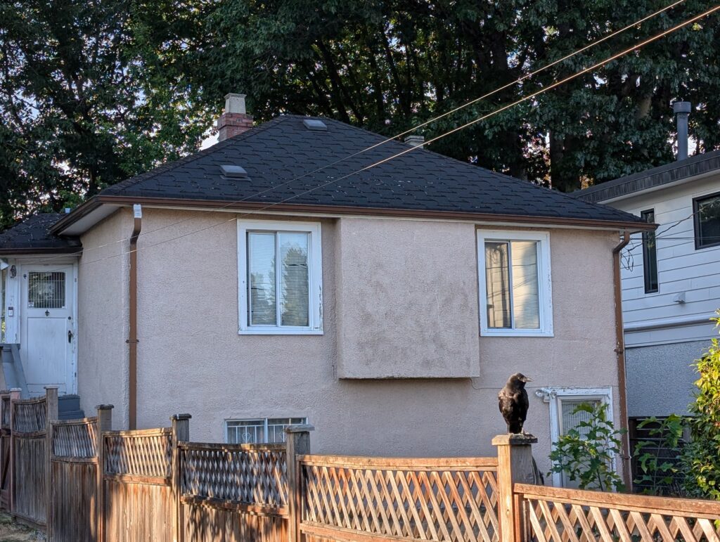 I love how this house looks like a face, and in this case, looks like it’s watching the crow on the fence. This is along my bike commute, and was taken on the way home from work on the first of August.
