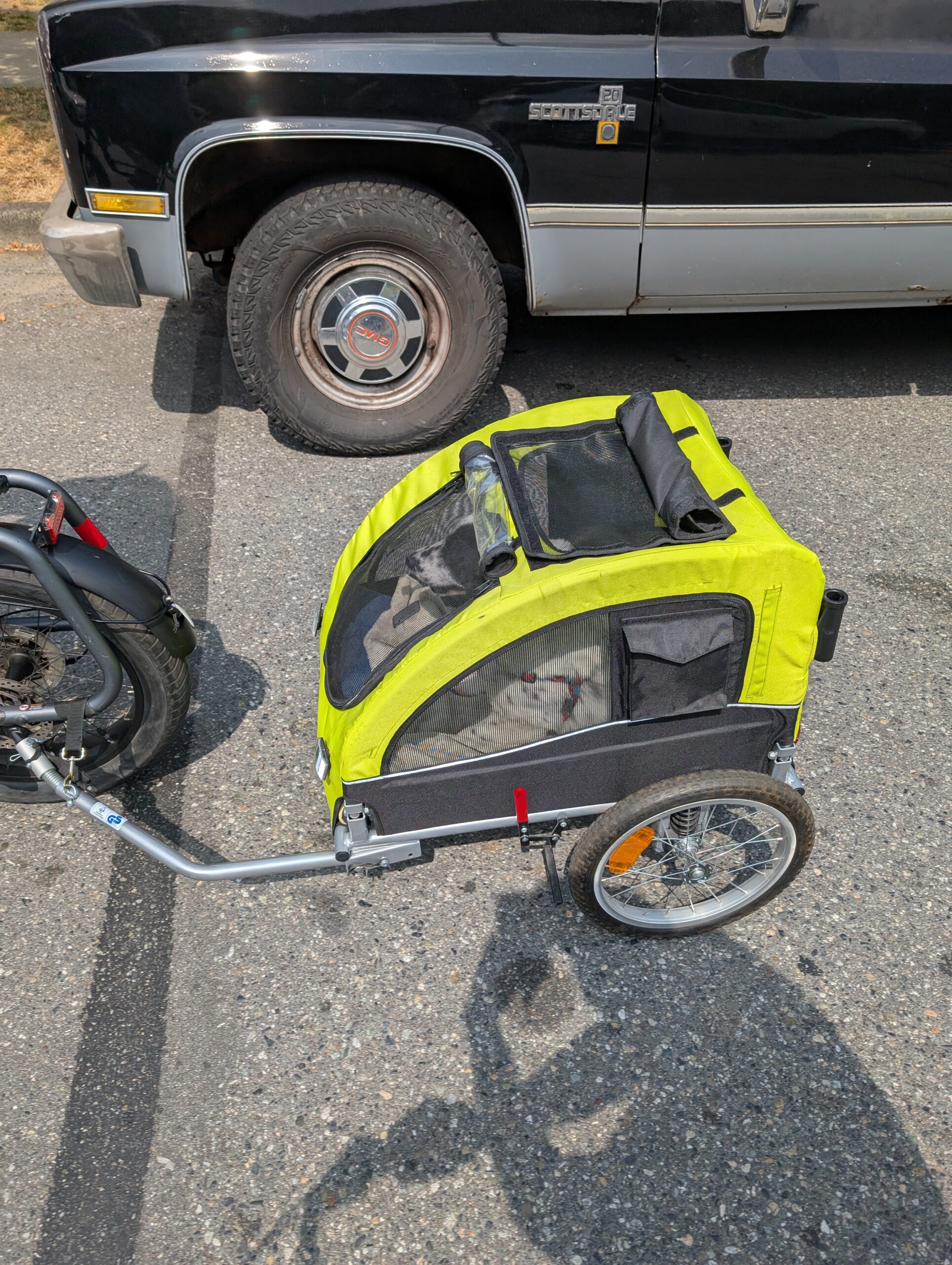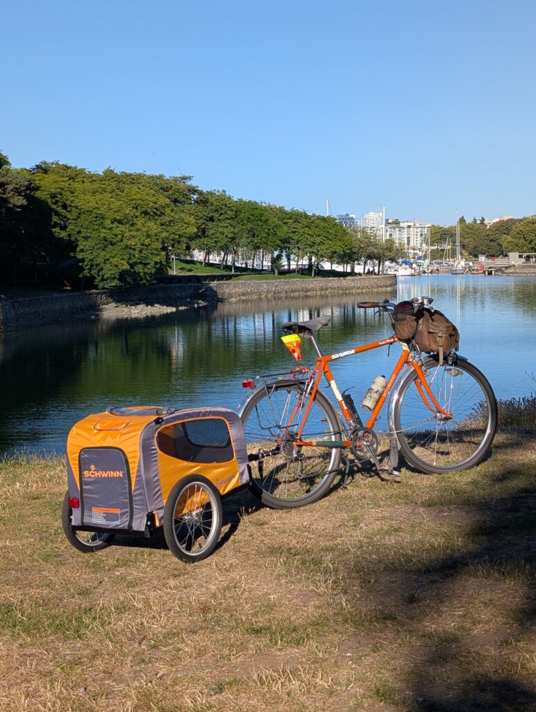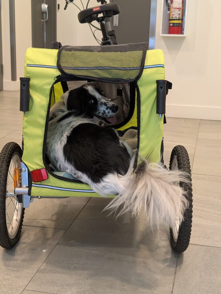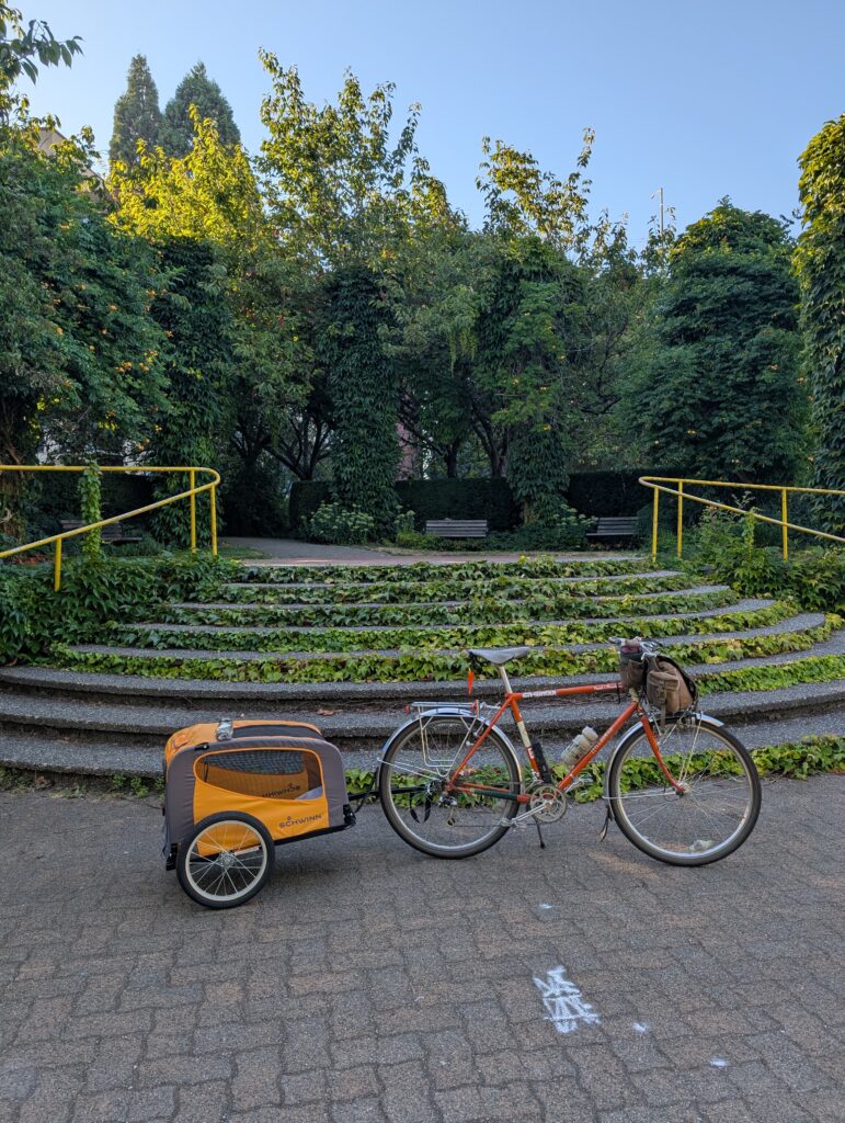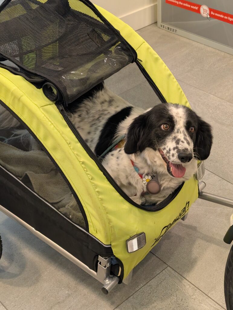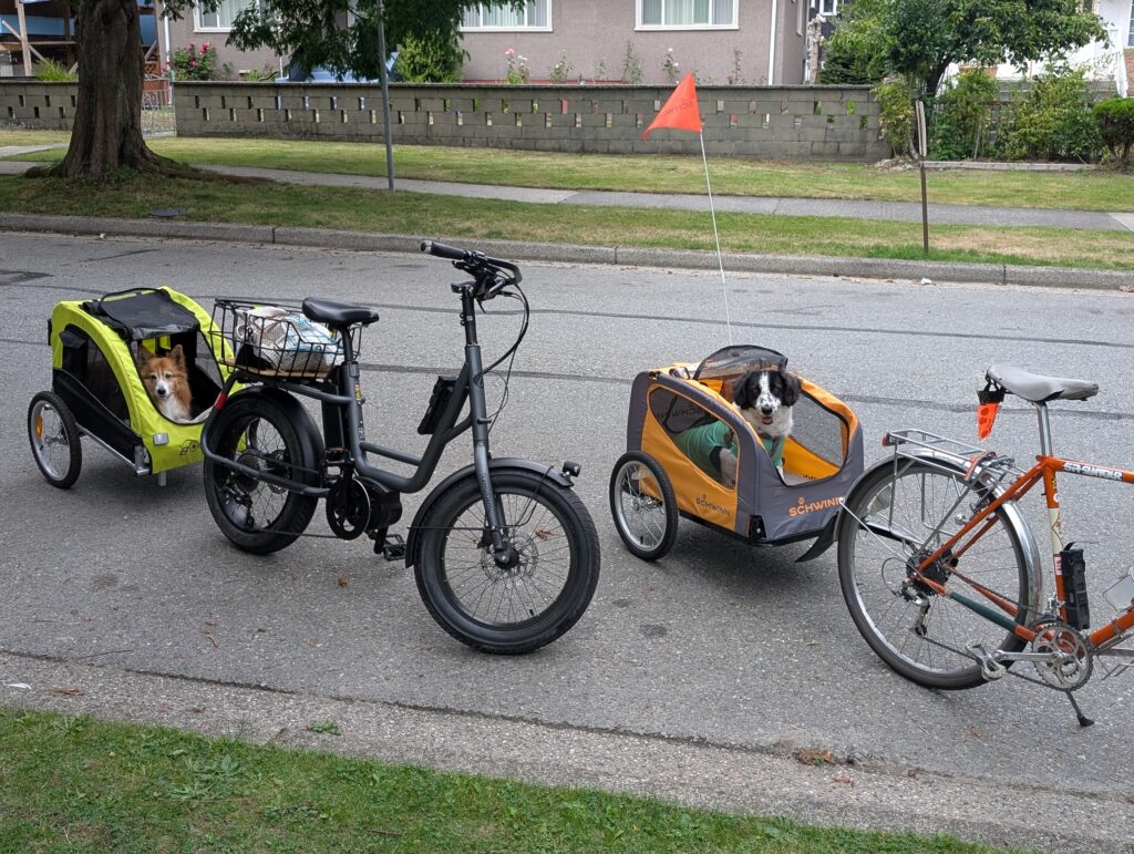 The next day I rode out to Kitsilano to pick up a dog trailer – the second in our household – so that Sunny has her own chariot. Now between Aimée and I, we can tow a dog each and the whole family can go for outings.