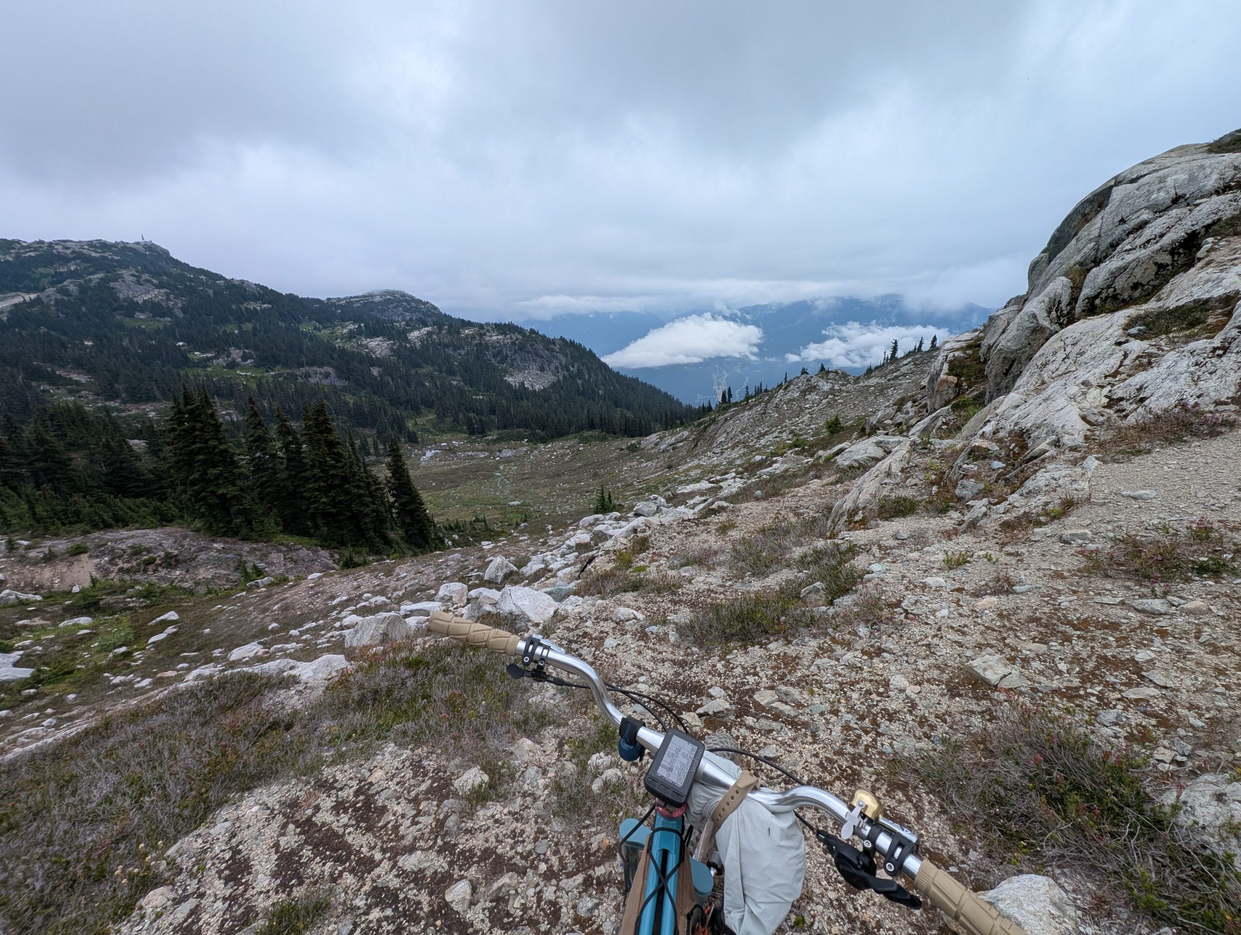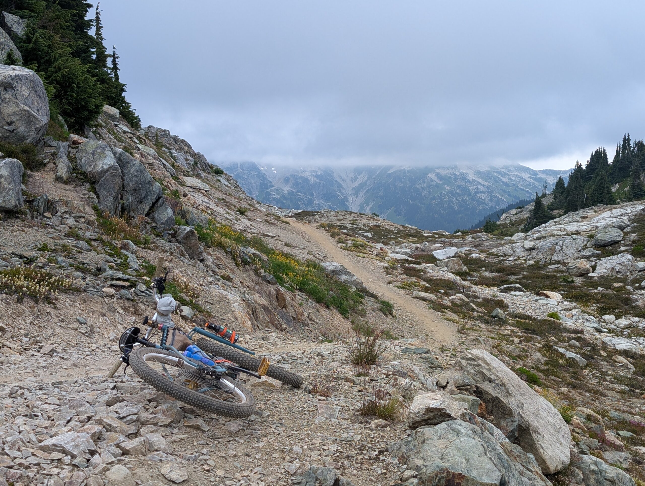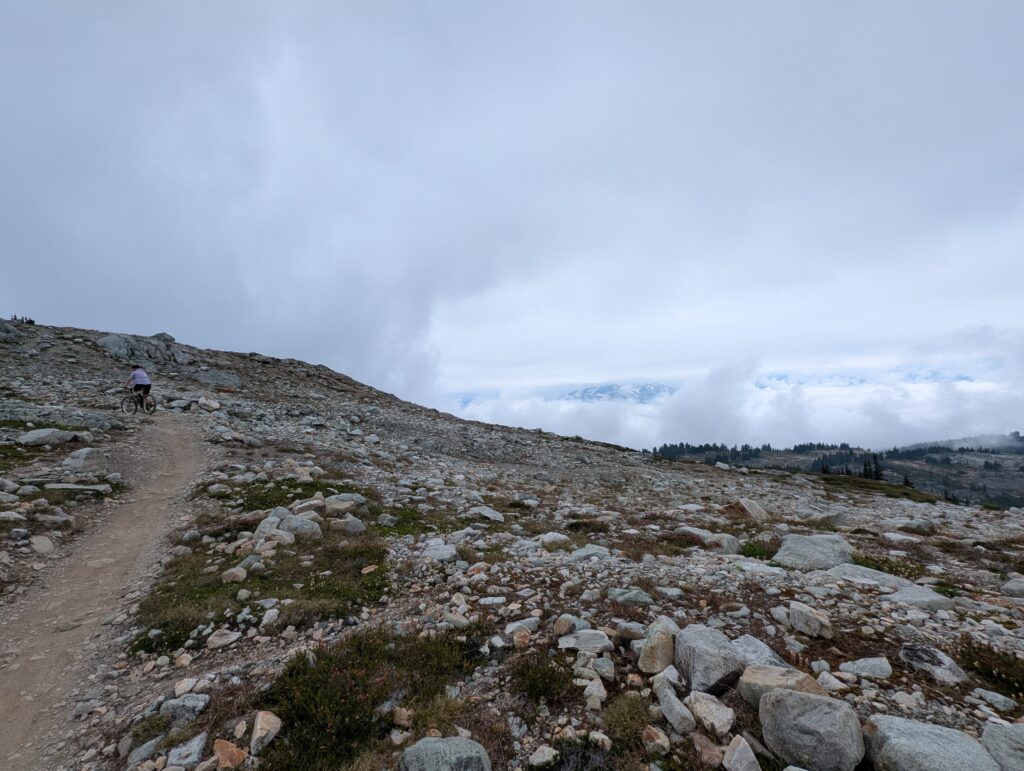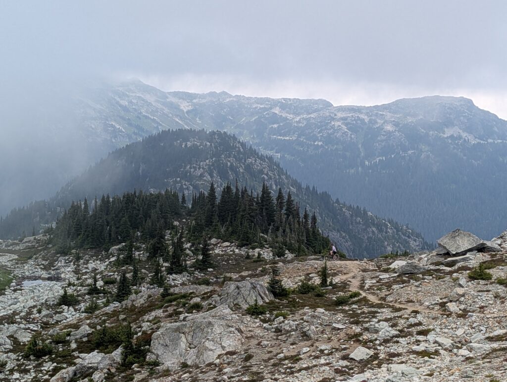 It was a decent climb just to get to the start of Into the Mystic – we started around 640m elevation, and this trail started at about 1000m, climbing to 1650m. From there we took a trail called On the Rocks which topped out at 1800m, and as the name implies, is all above the tree line. While the first couple hours of climbing were pleasant enough, it was when we reached the sub-alpine meadows filled with flowers that the ride started to really become something special. Both the sub-alpine meadows and the otherworldly alpine vistas had us giddy the whole time, just amazed by the beauty of the world. The descent was moderately technical, not too bad, and felt un-ending. This is absolutely worthy of a bucket-list ride. I hope to go back every year if I can.