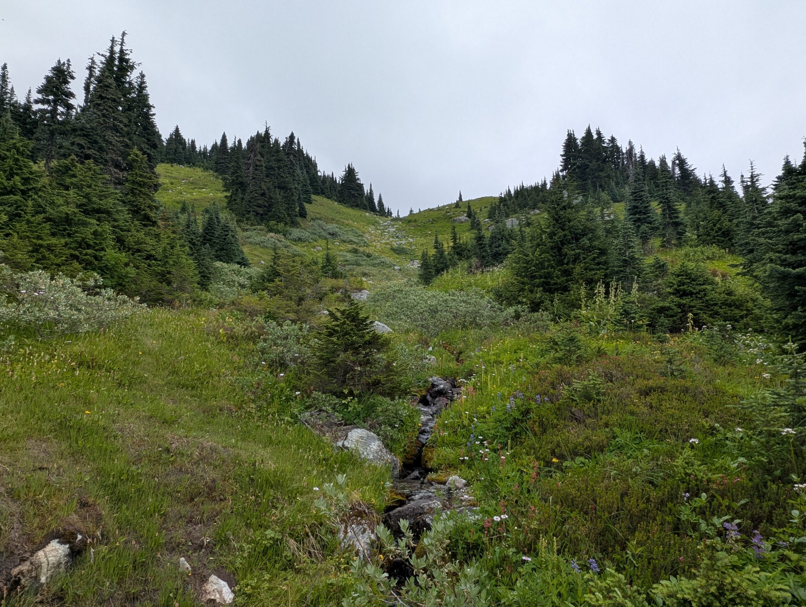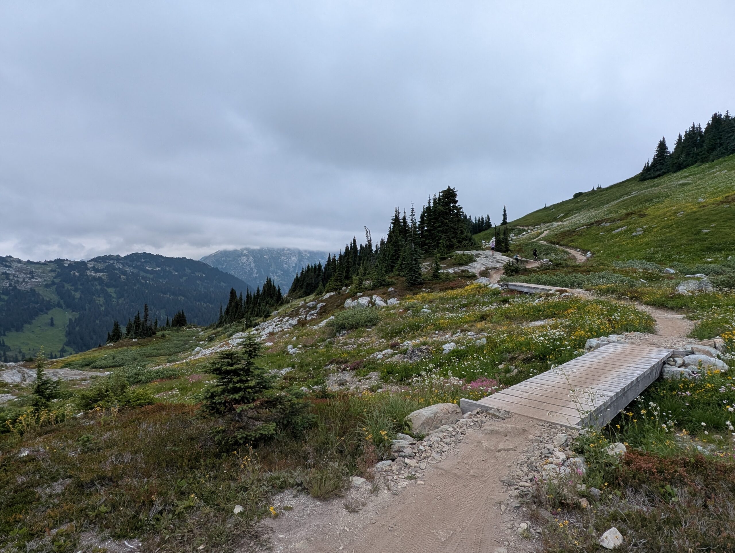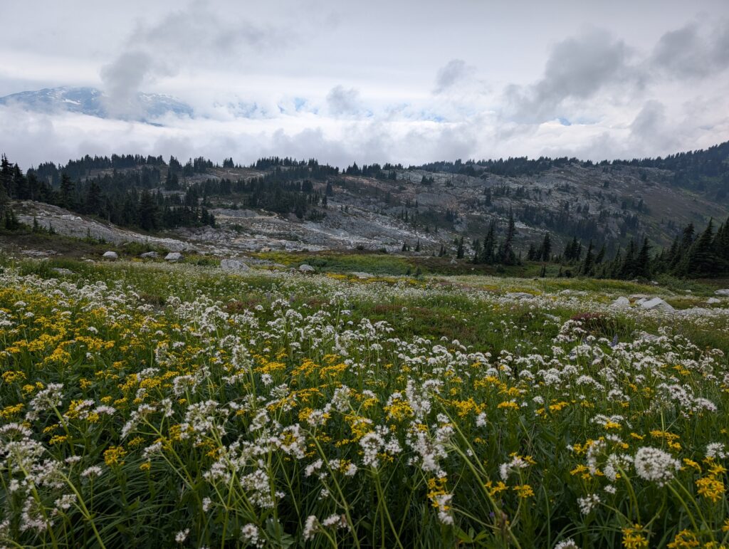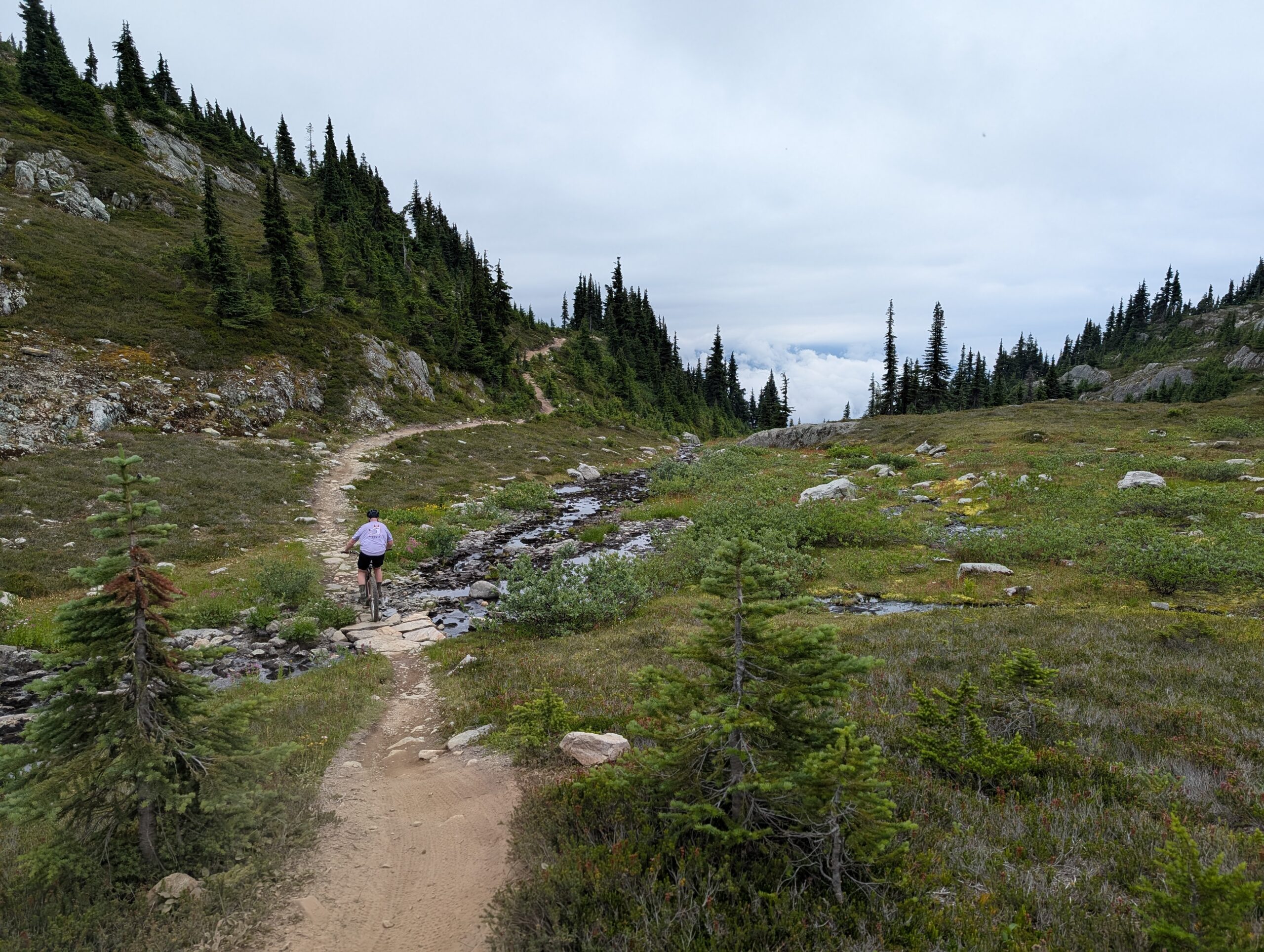 It was a decent climb just to get to the start of Into the Mystic – we started around 640m elevation, and this trail started at about 1000m, climbing to 1650m. From there we took a trail called On the Rocks which topped out at 1800m, and as the name implies, is all above the tree line. While the first couple hours of climbing were pleasant enough, it was when we reached the sub-alpine meadows filled with flowers that the ride started to really become something special. Both the sub-alpine meadows and the otherworldly alpine vistas had us giddy the whole time, just amazed by the beauty of the world. The descent was moderately technical, not too bad, and felt un-ending. This is absolutely worthy of a bucket-list ride. I hope to go back every year if I can.