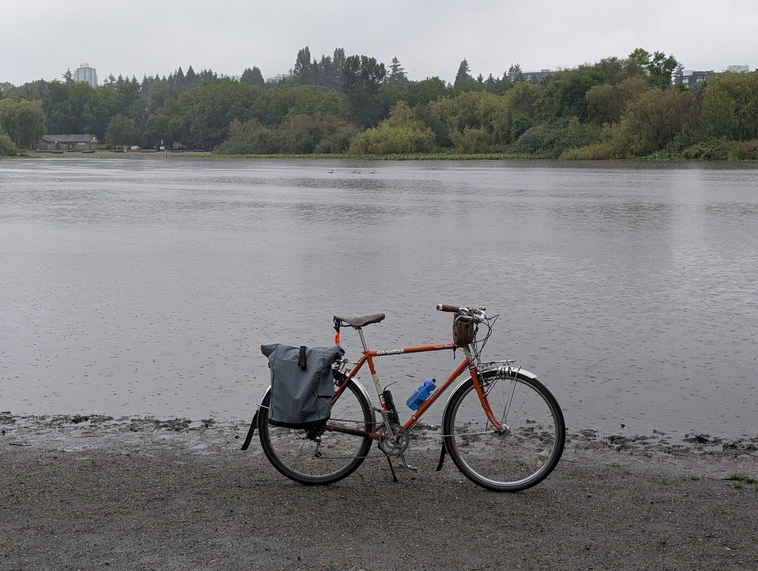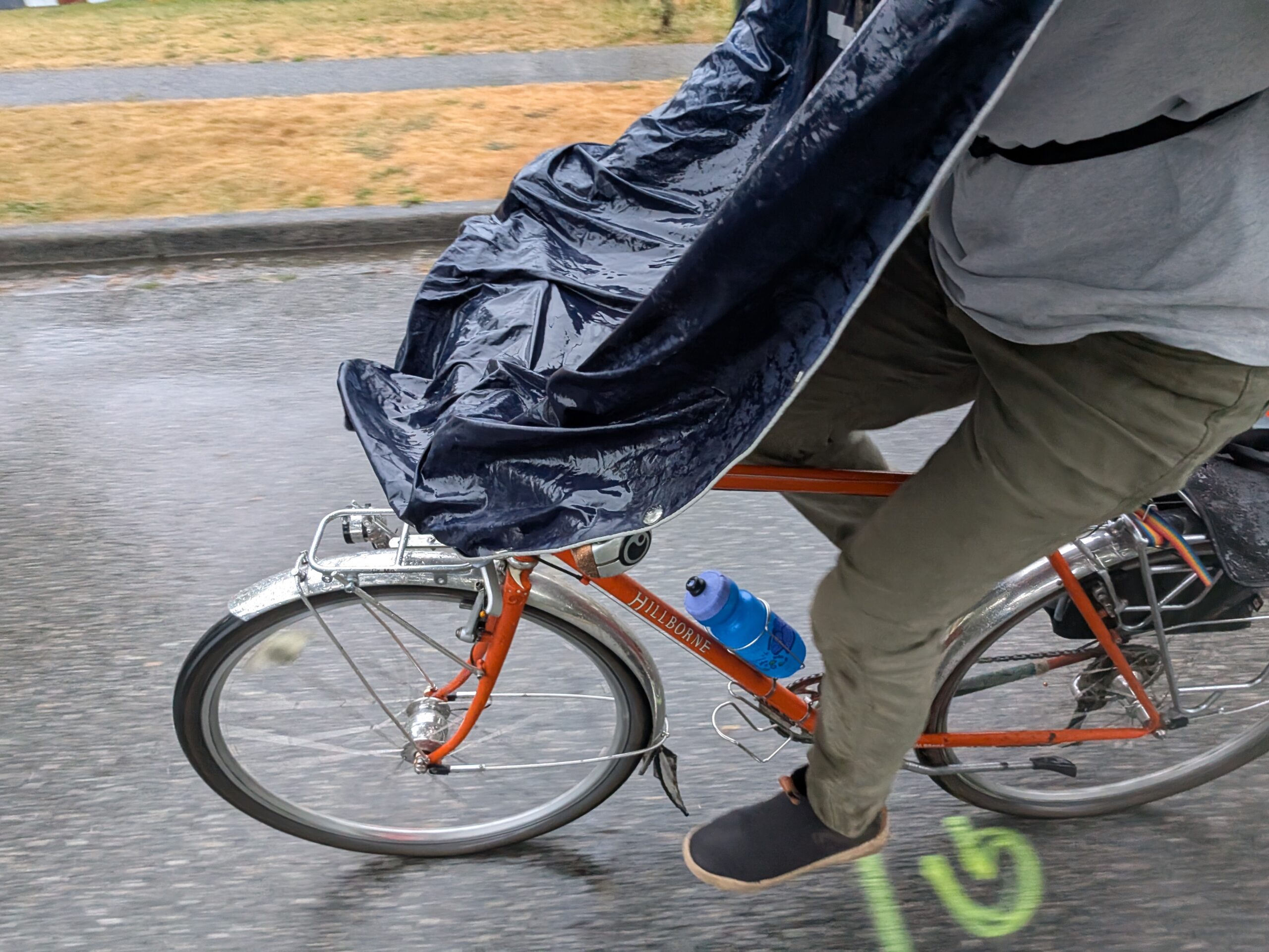That was certainly one of the highlights of August for me, but the humdrum of the normal week isn’t so bad either. I commuted the following Wednesday and it happened to coincide with a proper summer rainstorm in the morning. Thankfully my commute home was much drier. Check out the effectiveness of the poncho + full coverage fenders to keep my office attire reasonably dry!
