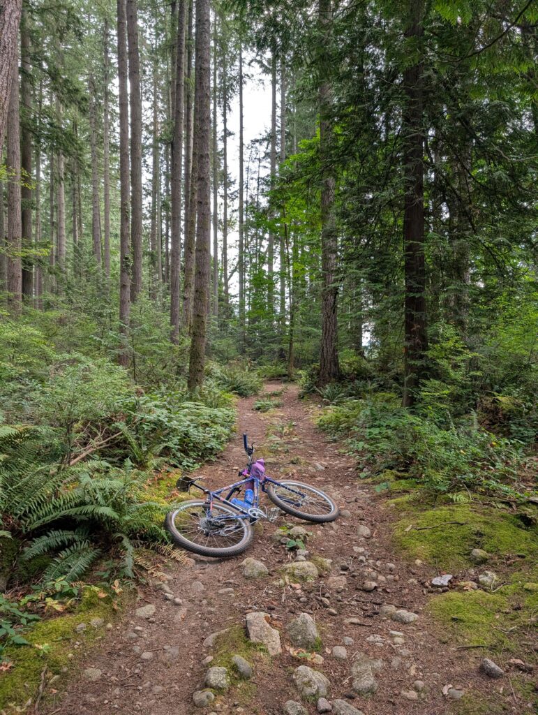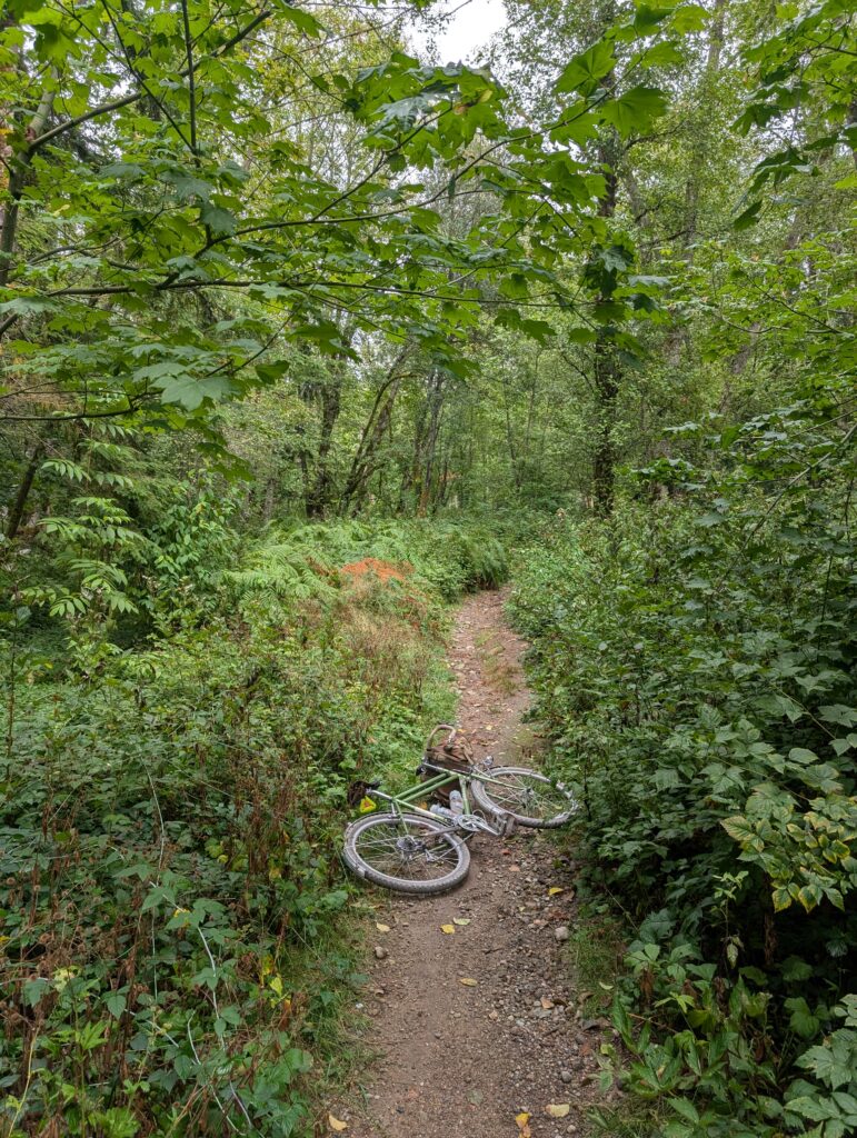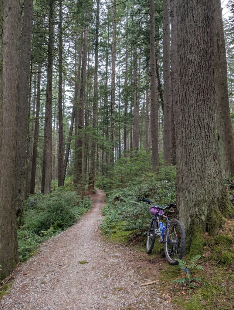 After resting a couple days I was feeling tentatively okay and was thinking of riding out to my dad’s. To test the theory that I was, in fact, recovered I rode the Seymour valley full loop – and added in a 150m technical hike-a-bike up to some old growth I was keen to find near the lake. In hindsight this was a bit silly, to tire my legs out like this (especially after not eating a lot for a couple days) before a big ride to my dad’s, but it was successful and lovely.