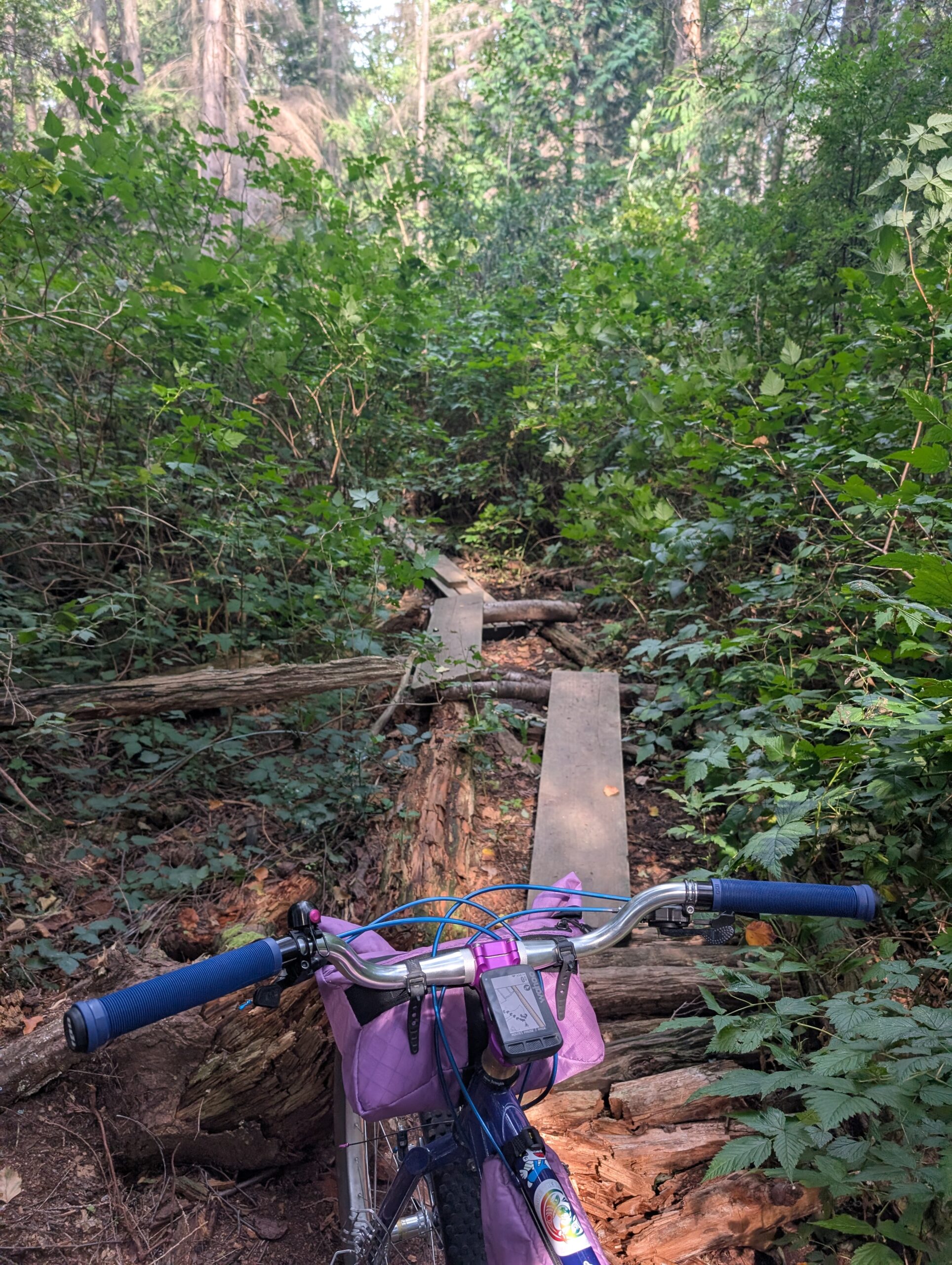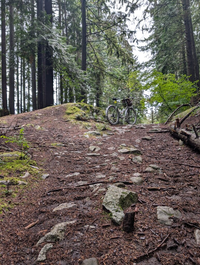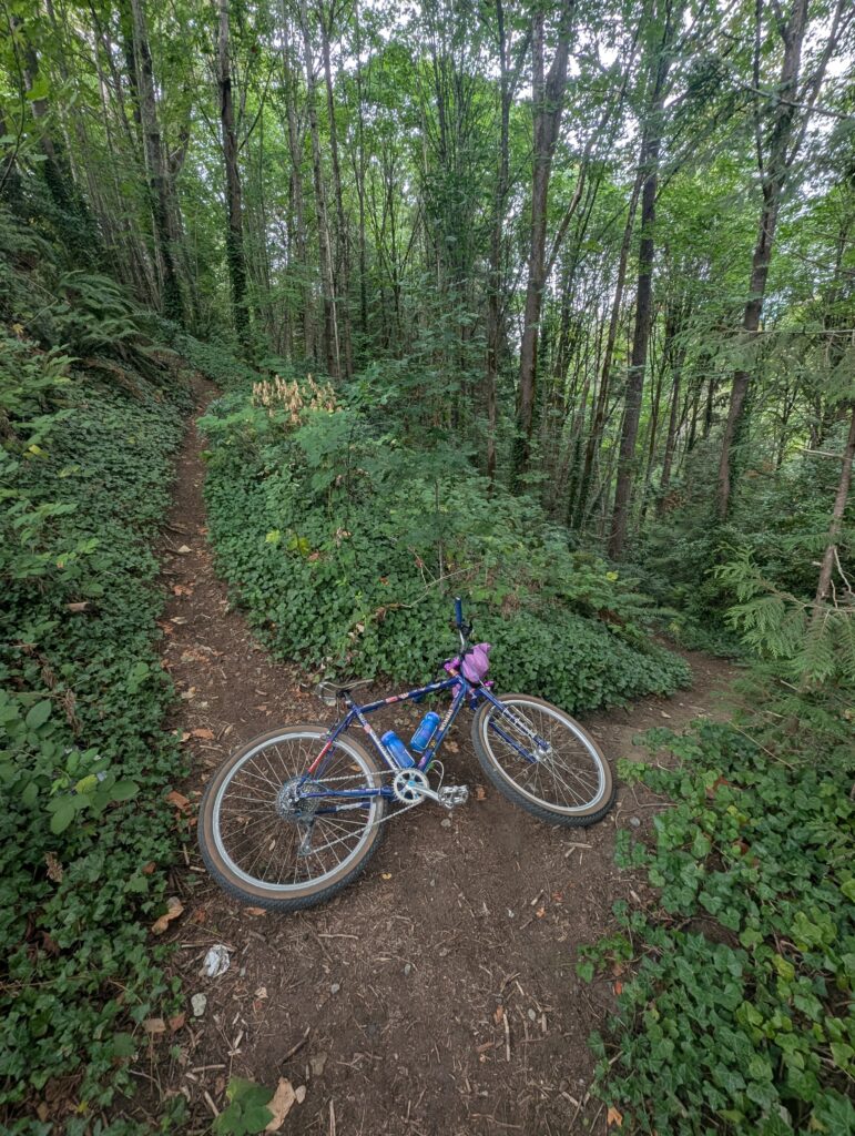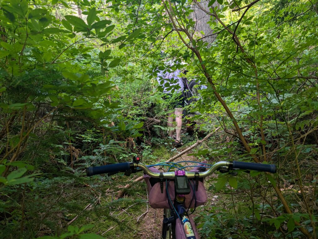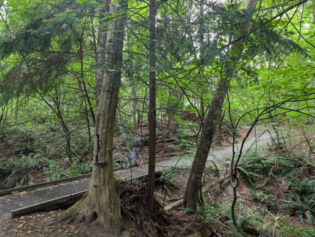 I was in what’s called the Bert Flinn trail network, which is a mix of green and blue MTB trails. Quite gravel-bike friendly compared to most local MTB trails, these weren’t too steep and only modestly technical. Most of the wood features were older, many rotted away. As I hope the photos convey, it’s really lovely in here. I went back with Rob in November, aboard the newly built Evasion which I had literally this route in mind when I built.