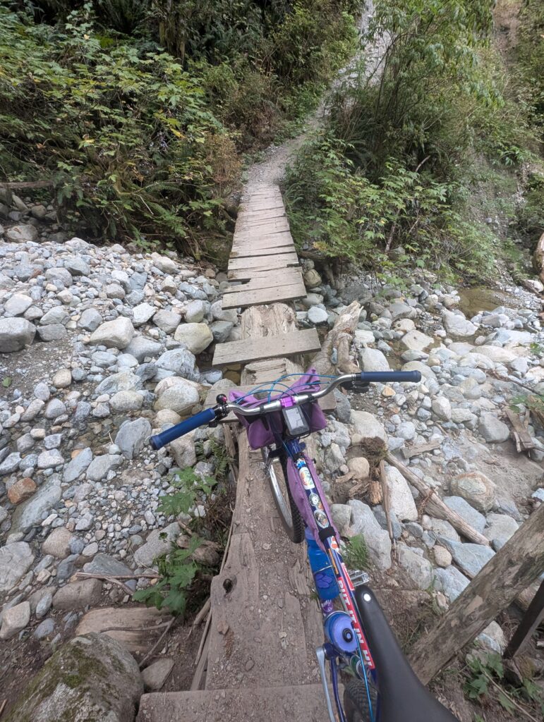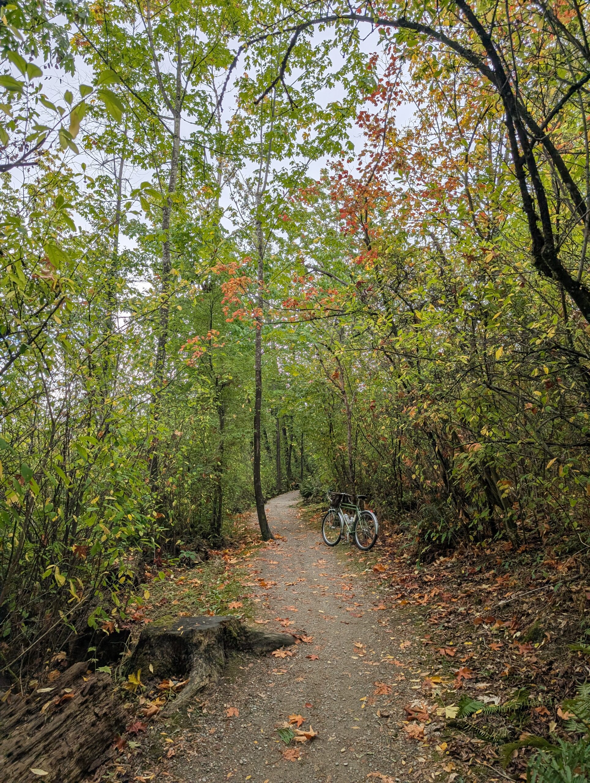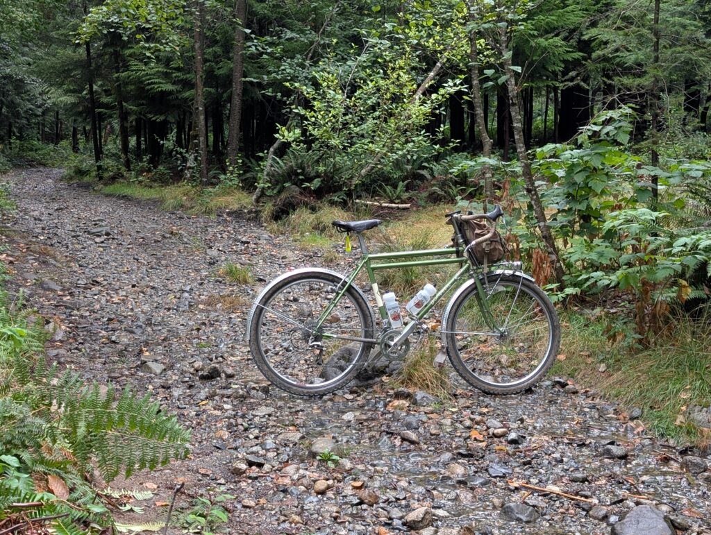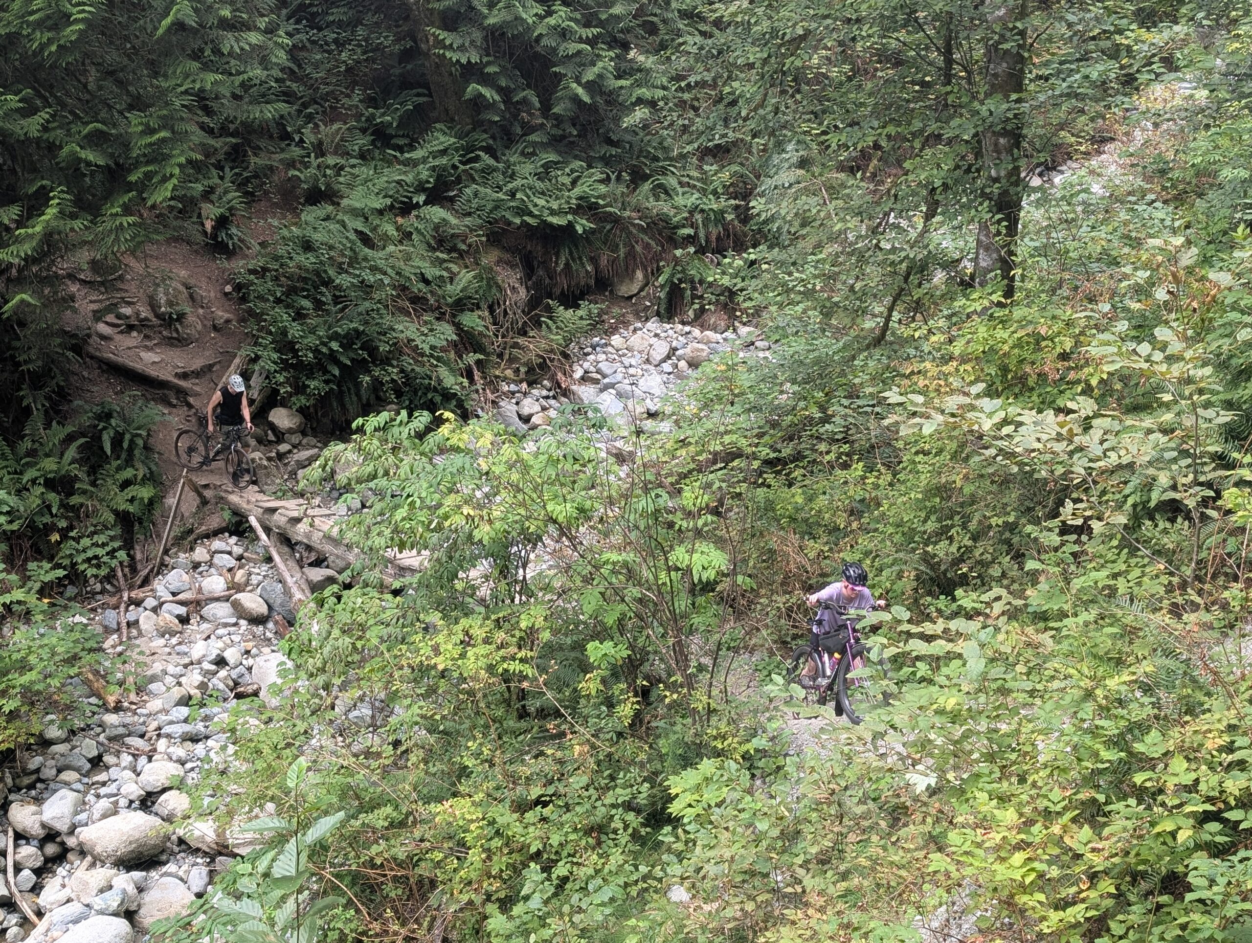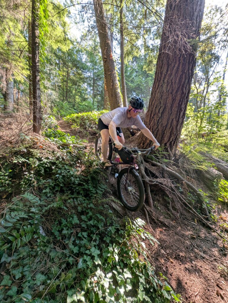 I was in what’s called the Bert Flinn trail network, which is a mix of green and blue MTB trails. Quite gravel-bike friendly compared to most local MTB trails, these weren’t too steep and only modestly technical. Most of the wood features were older, many rotted away. As I hope the photos convey, it’s really lovely in here. I went back with Rob in November, aboard the newly built Evasion which I had literally this route in mind when I built.