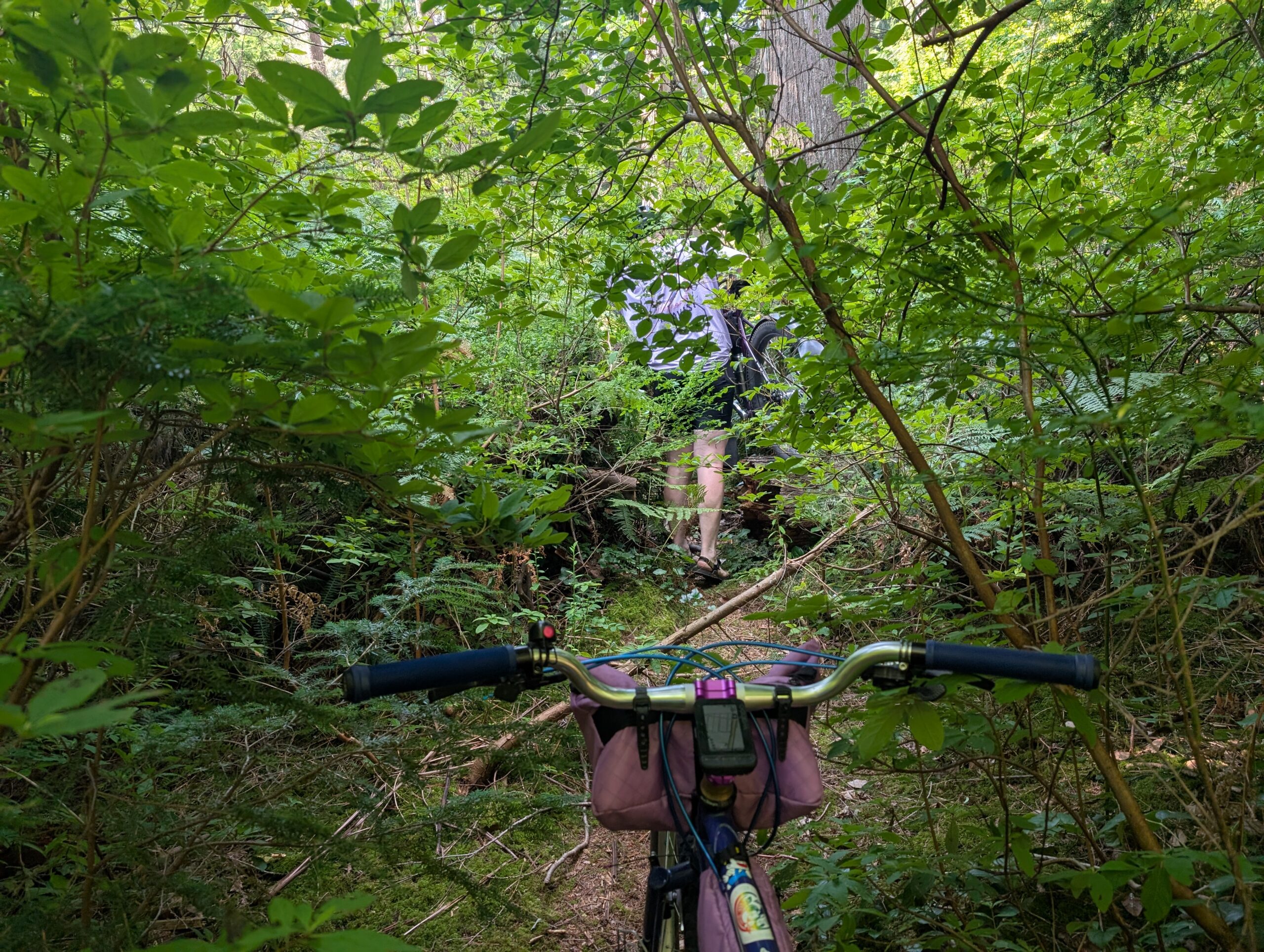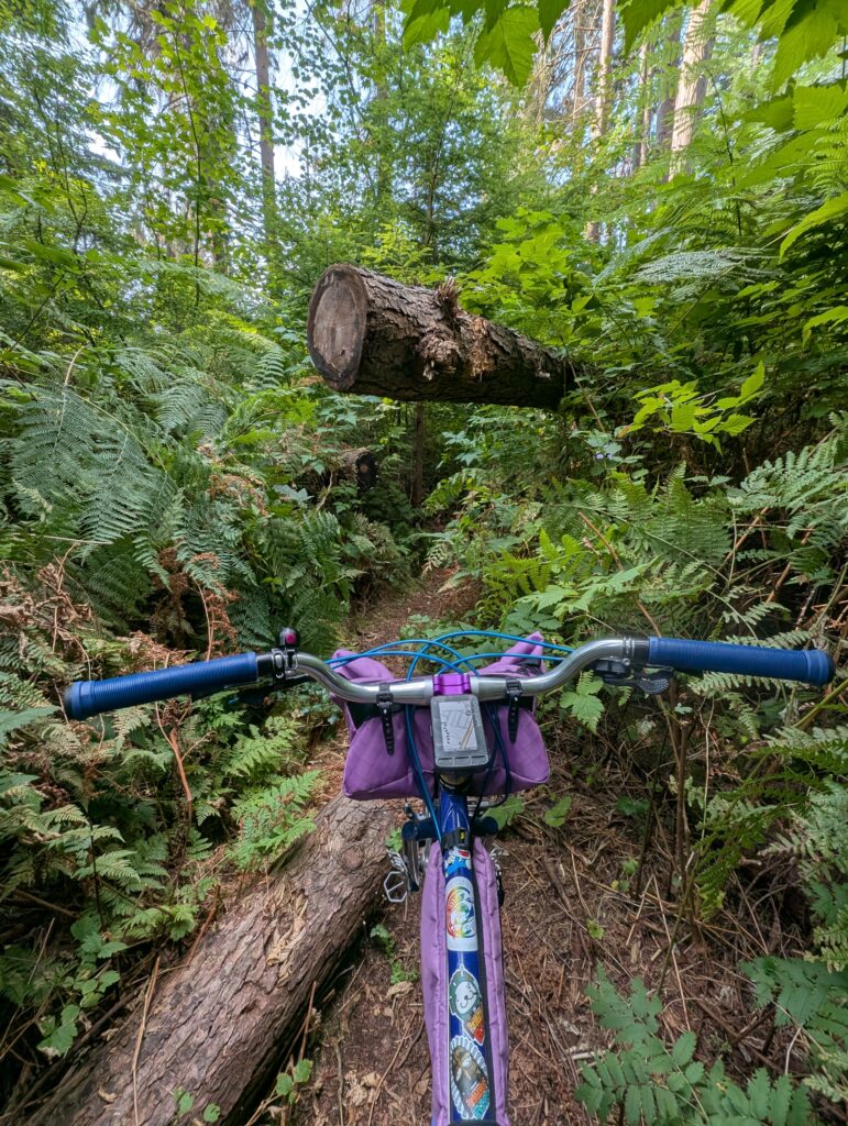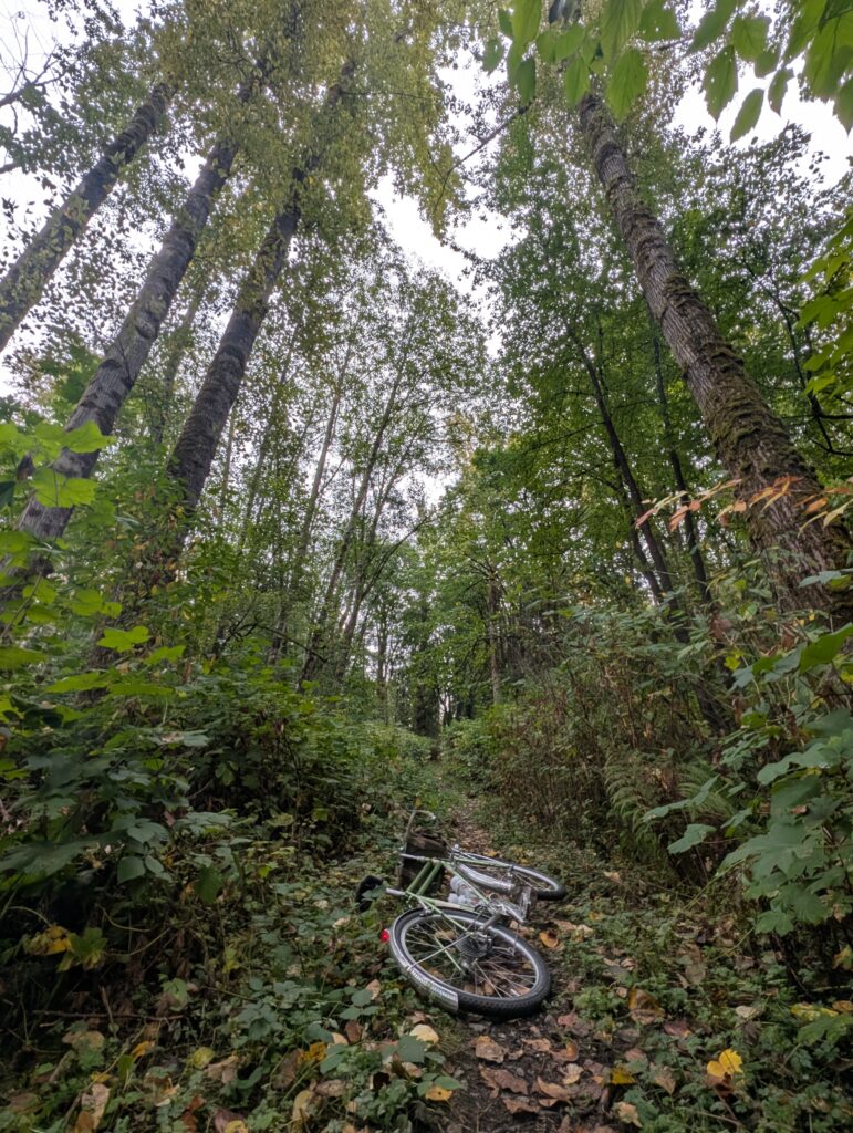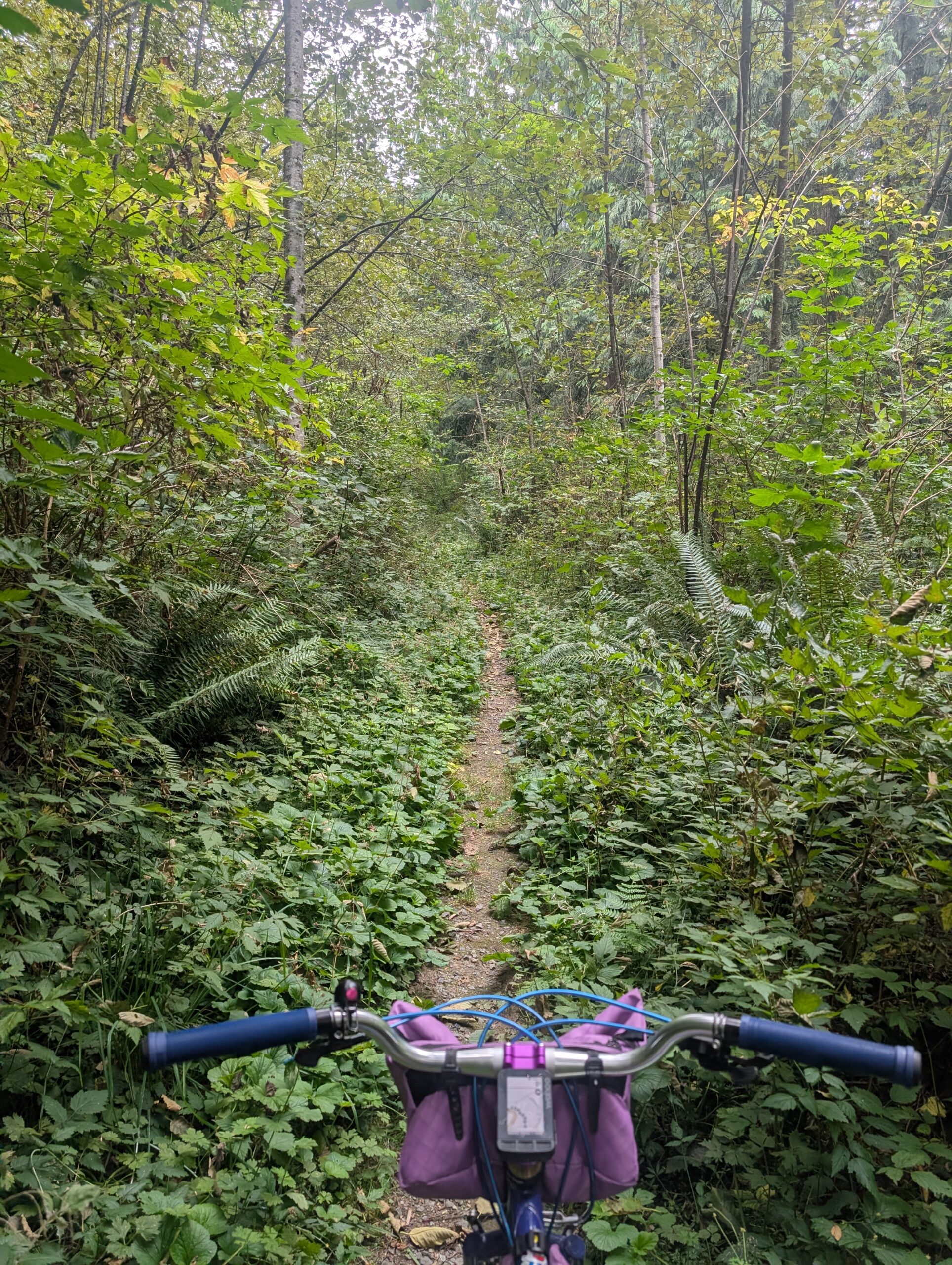 When Saturday came along, which was the 5th, I chose the Stooge with a plan of riding up and down Burnaby Mountain trails and then looping over to Dageraad. Leaving the brewery, I decided I’d extend my ride home by going to the other side of the highway and riding the trails of Derby conservation area – and made the on-the-fly choice to try going through what I knew to be a barely-there trail along the lower section of the forest. I had also rode some low-traffic trails on Burnaby Mtn which were terribly overgrown, so I’m not sure what I was expecting.. needless to say it was a bit of a bushwhack.