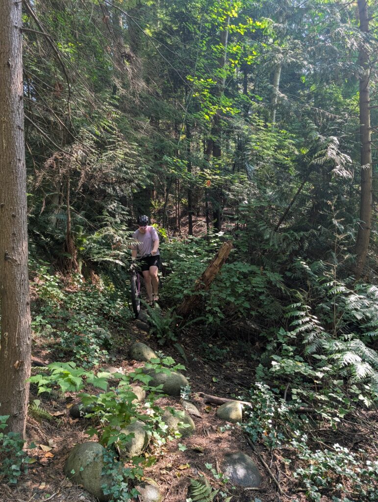 We started descending towards the water and found a tunnel that I’d passed by countless times on my way to the ferry and never noticed! It led us to a school ground with fun rock, and then we ended up on connector trails that were much better than either of us expected. Finally we reached Caulfield Park, a gem of a spot right by the much more well-known Lighthouse Park. The ocean-front riding is really fun, though not always rideable. We also spent a good deal of time just lounging on the rocks like lizards.