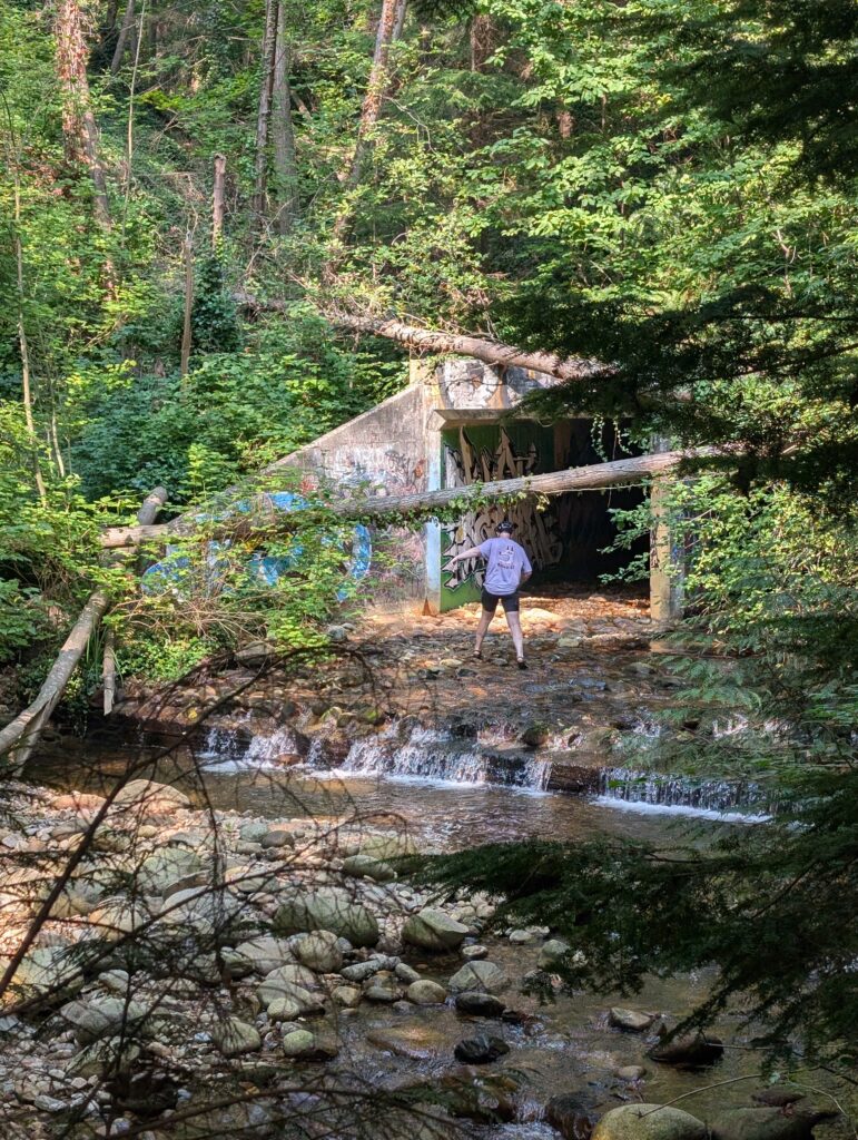 On the last day of August, I got out for a “bike portage club” style ride with Tay and Rob. The first bout of silliness occurred when Tay and I (en route to meeting Rob) decided to try some trails around McKay Creek near Hwy 1, which proved to be overgrown and, in some cases, almost non-existent. I would say it was all worth it though because we came across a concrete tunnel that the creek passes through under the highway, tucked away where few people would see it.