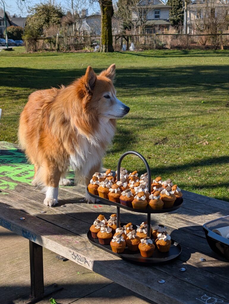 I’ve been telling people Leia is 13 years old for almost two months now, but today it’s officially true. As we’ve been doing for a bunch of years now, Aimée made dog cake (in cupcake form this time) and we went to Pandora park and invited dog friends out to join. About a dozen folks were able to make it out, helped by the great weather this day.