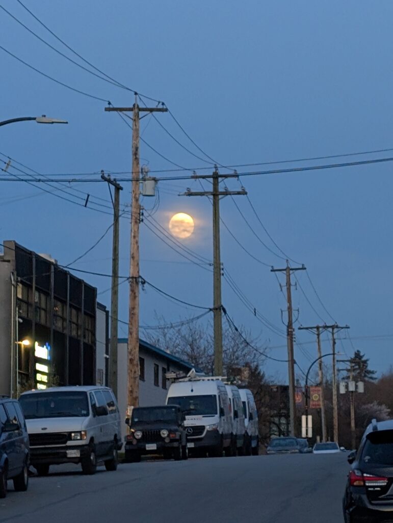 I went out for the sunset but it was the moonrise that stole the show. The moon was full and bright, and appeared huge while it hung near the horizon – the photo was the best I could do with my phone camera, but appeared twice as big in real life.