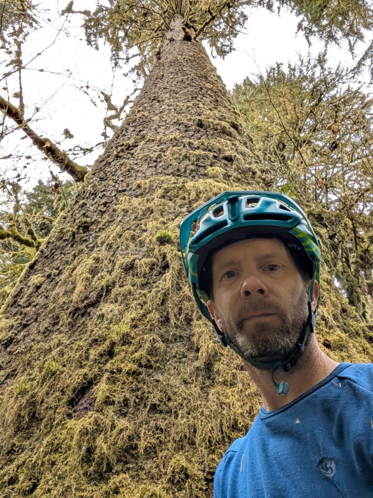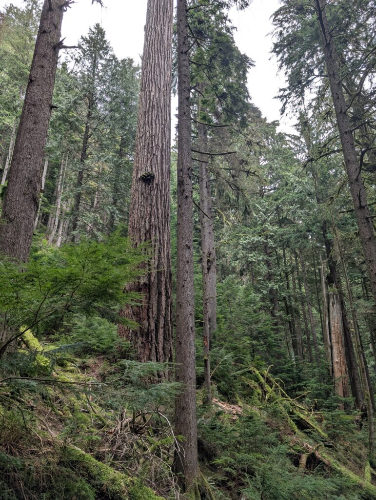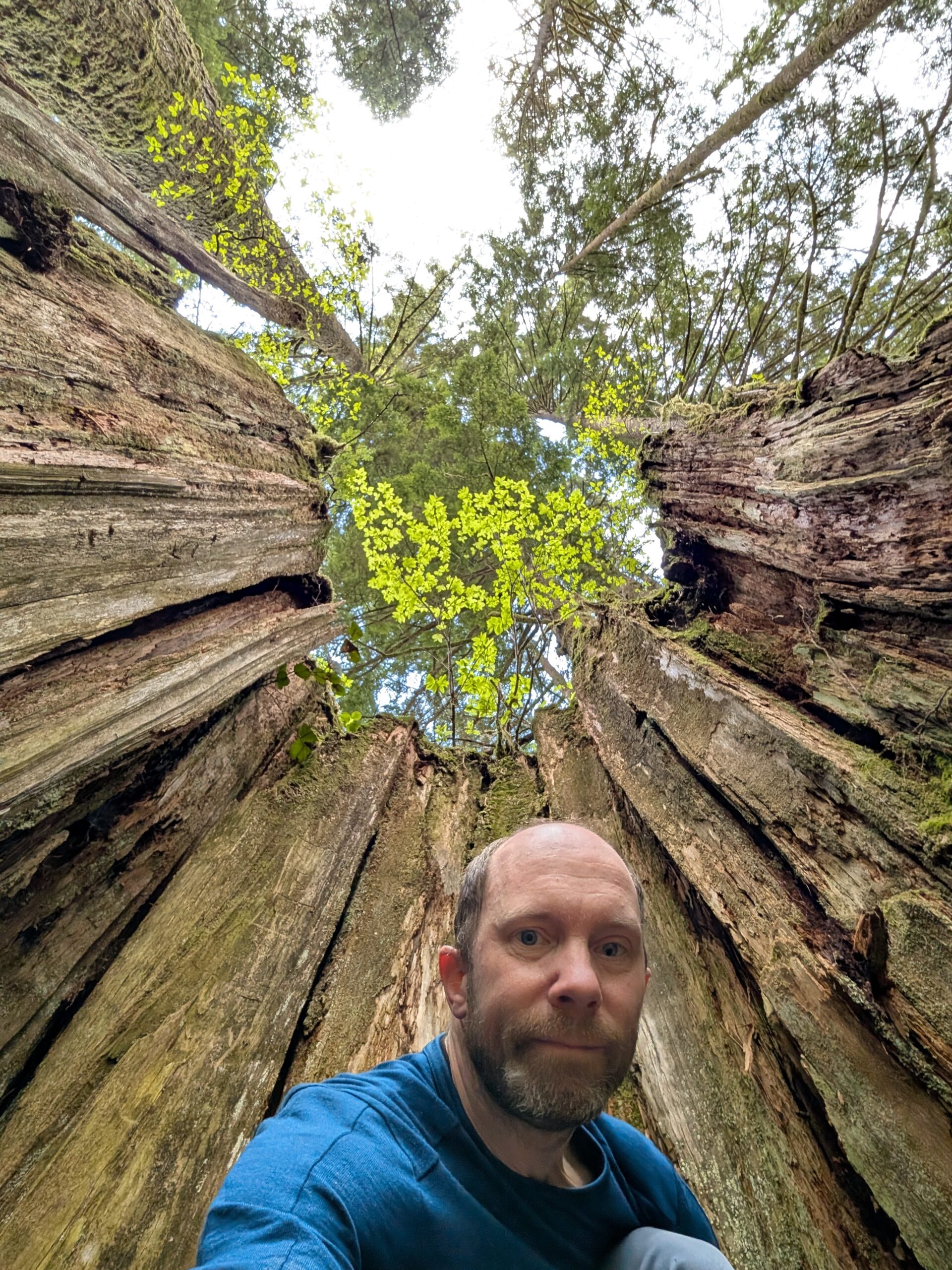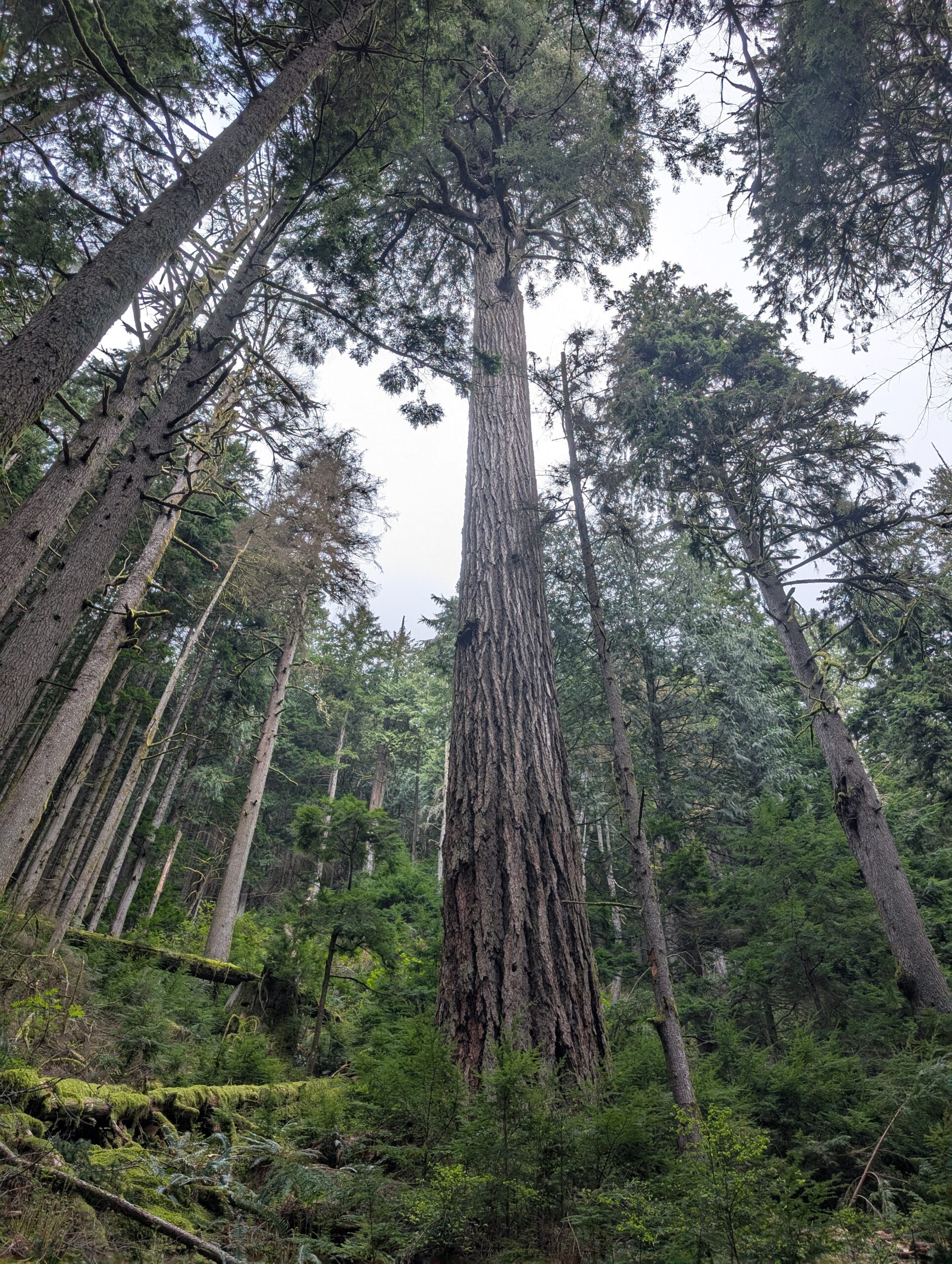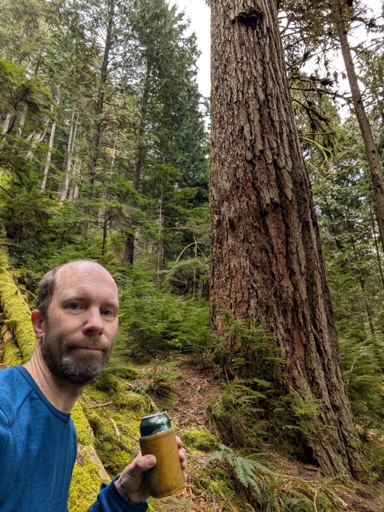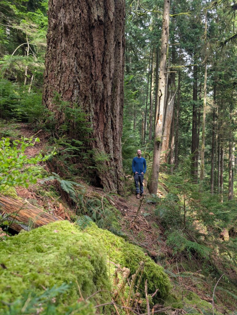 Being by myself this whole time, it had been a pretty silent hike, but as soon as I got a good view of the Temple Giant I was effusively complimenting it out loud. BC Tree Hunter has ranked it fifth in BC for Douglas Firs, with a diameter of about 10 ft, which is about 12-18″ larger diameter than the impressive Doug Fir we’d found a few weeks prior just to the south. Here are four photos of it from different angles, and myself for scale (taken with a 10s timer and a quick scramble from my perched phone):