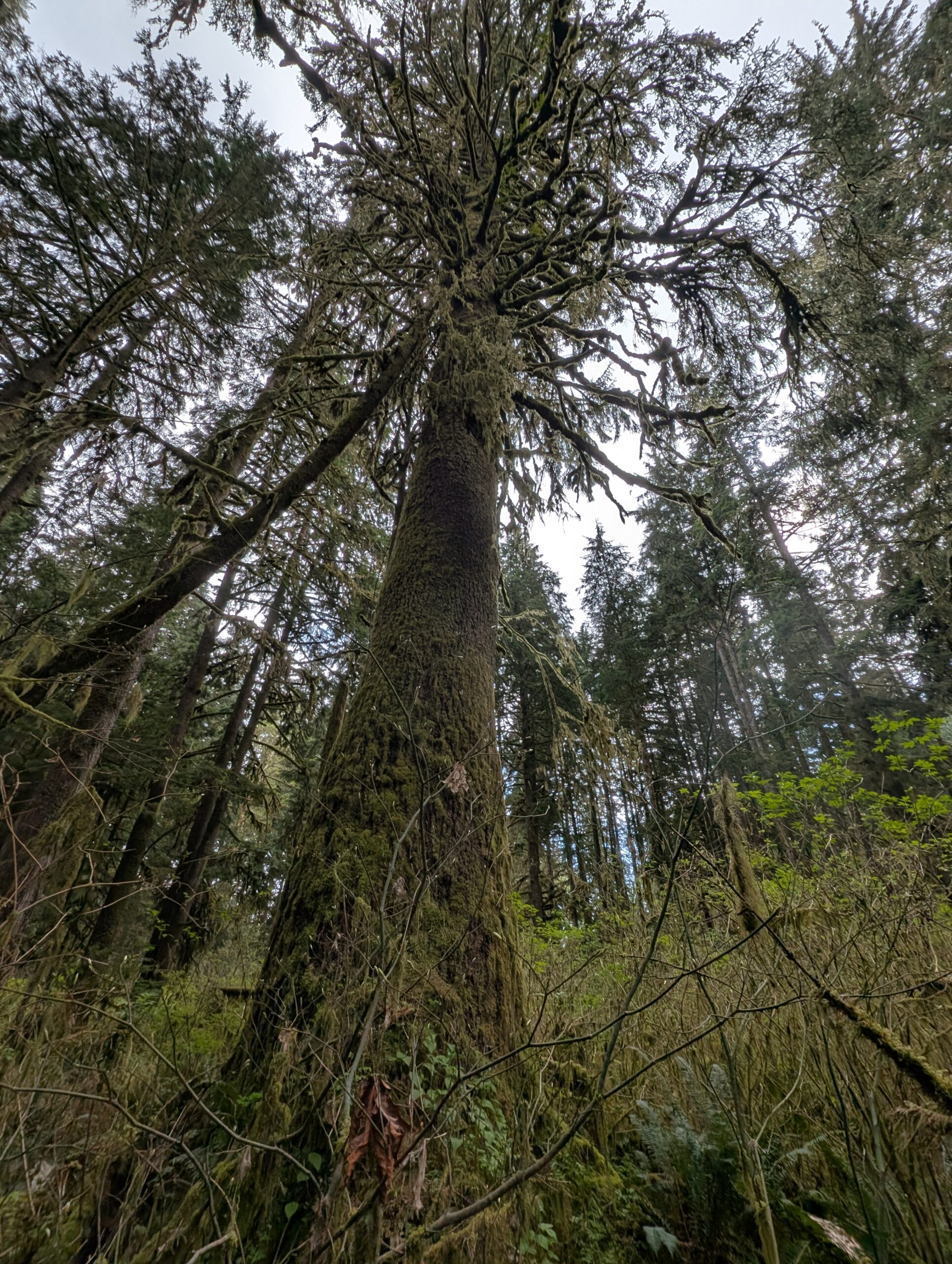 And the next was to bushwhack the 100 ft or so to this massive Sitka spruce I’d noticed off the trail before. It isn’t quite as big as the 500 year old examples on Rainbow Creek trail, but it’s pretty old! There is something extra special about old Sitkas to me with their mossy limbs and trunk.