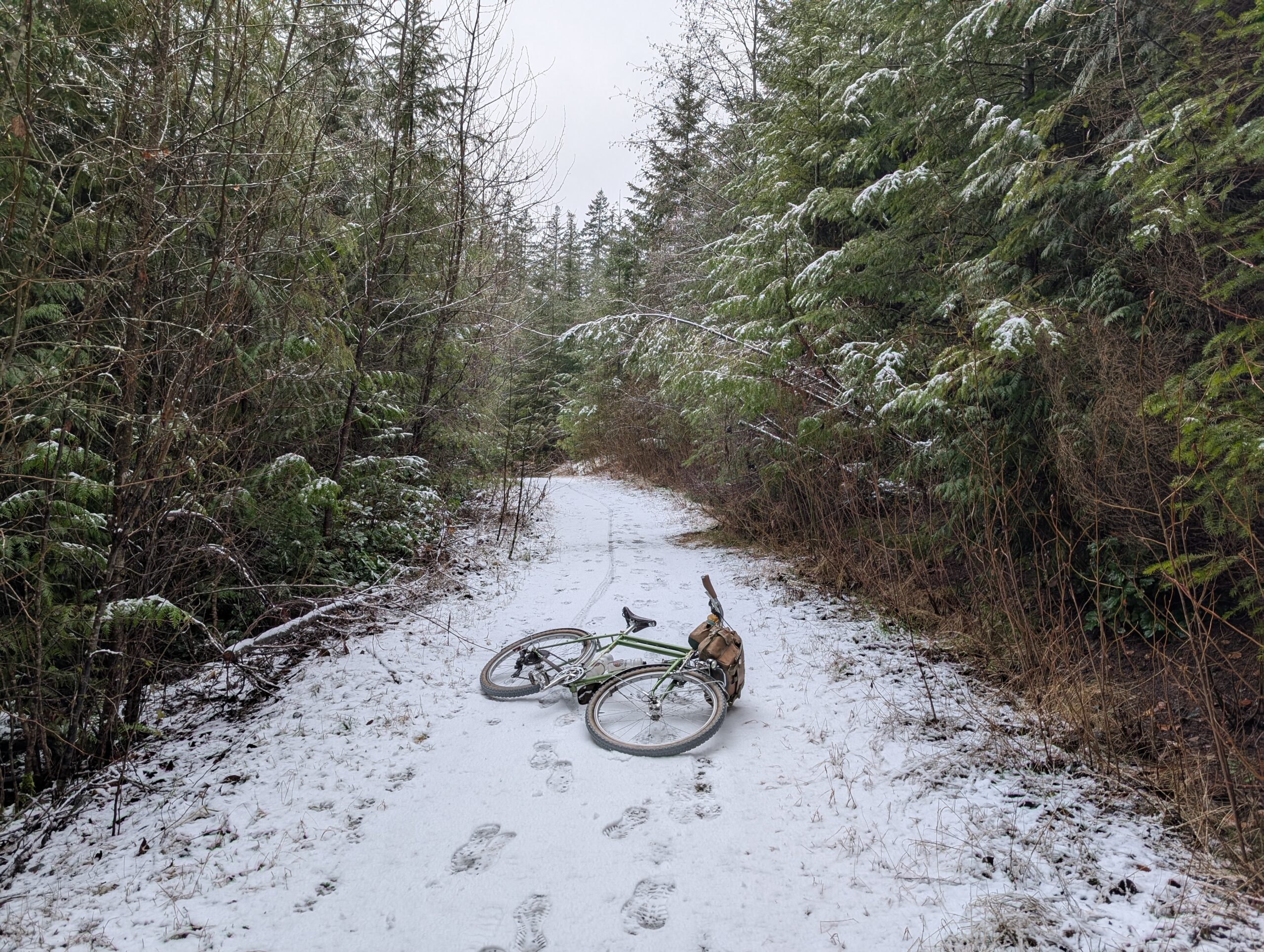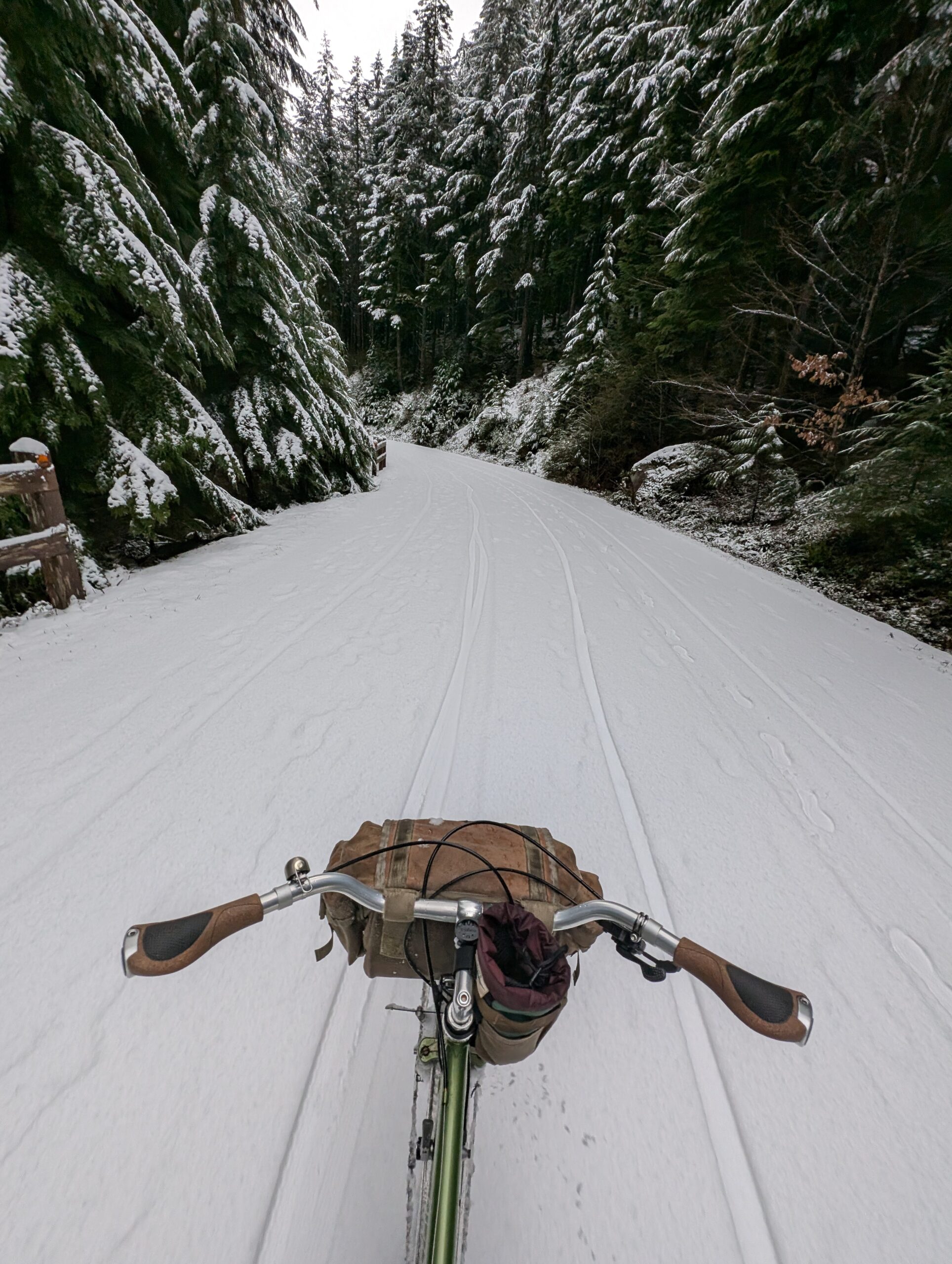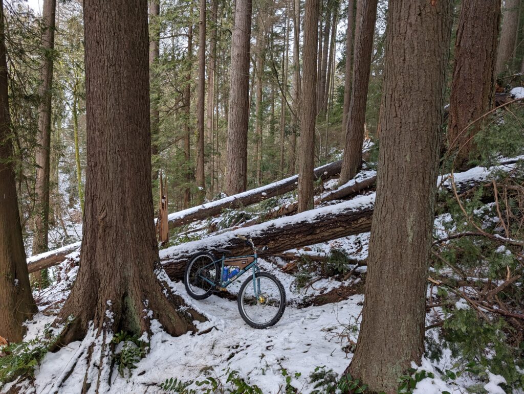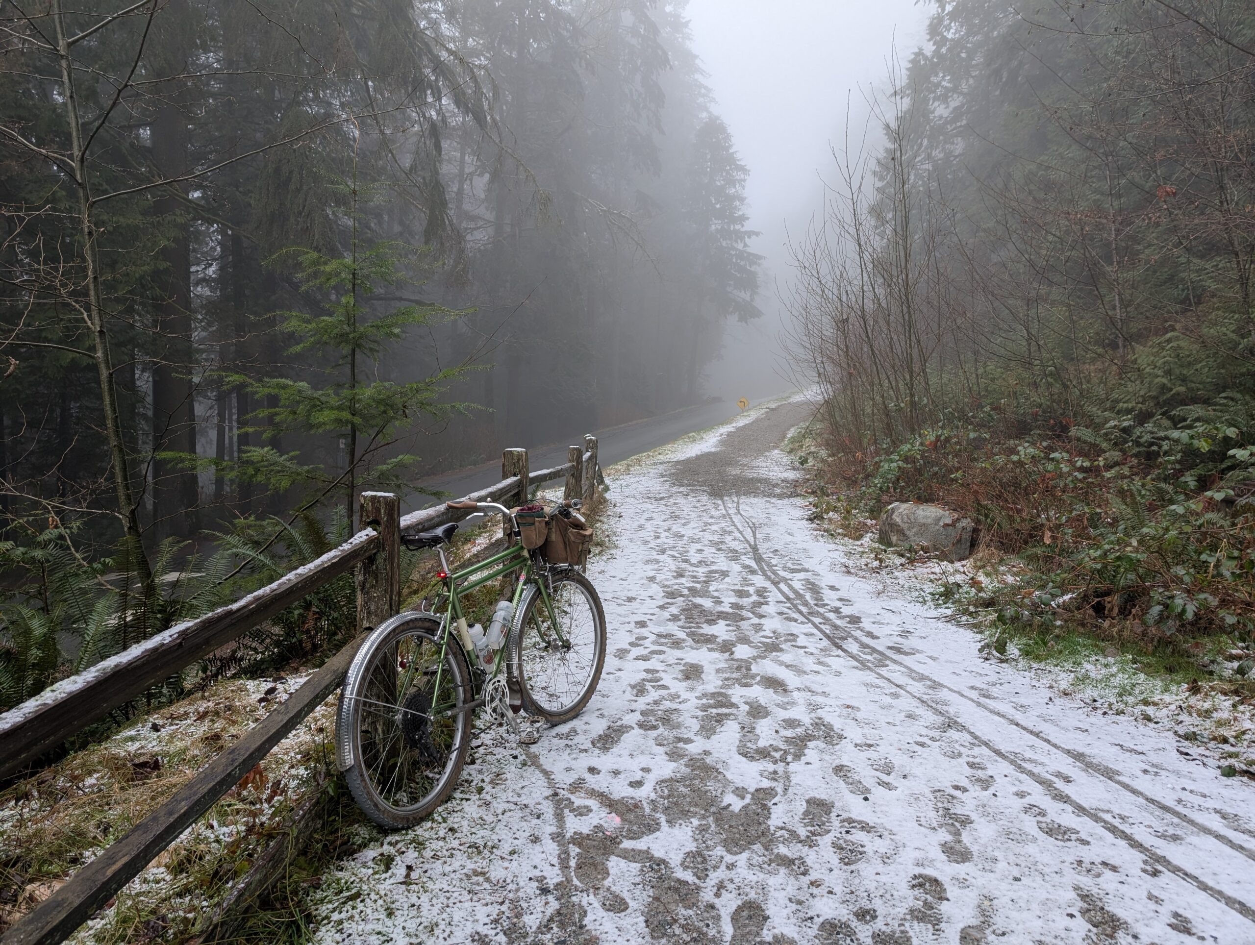 I took the Bombadil and headed over to the north shore. It didn’t take a lot of climbing before I reached some patchy snow. I made my way up Fisherman’s Trail along the Seymour river and didn’t have a real plan for how far I was going to go, I’d base it on the conditions and how I was feeling. It was stunningly beautiful, but the snow was also packing into my fenders. I rode up to the midvalley lookout, then up the Hydraulic creek connector and back on the paved parkway – which felt more like a XC skiing groomer today. As soon as I was back down the hill a bit the snow subsided, and I spent a little bit of time in the oldest corner of the cemetery along my route, reading the old headstones and reflecting on how they, too, are slowly being reclaimed by nature.