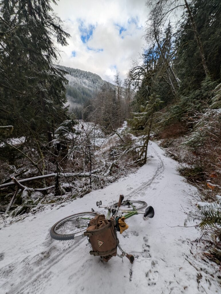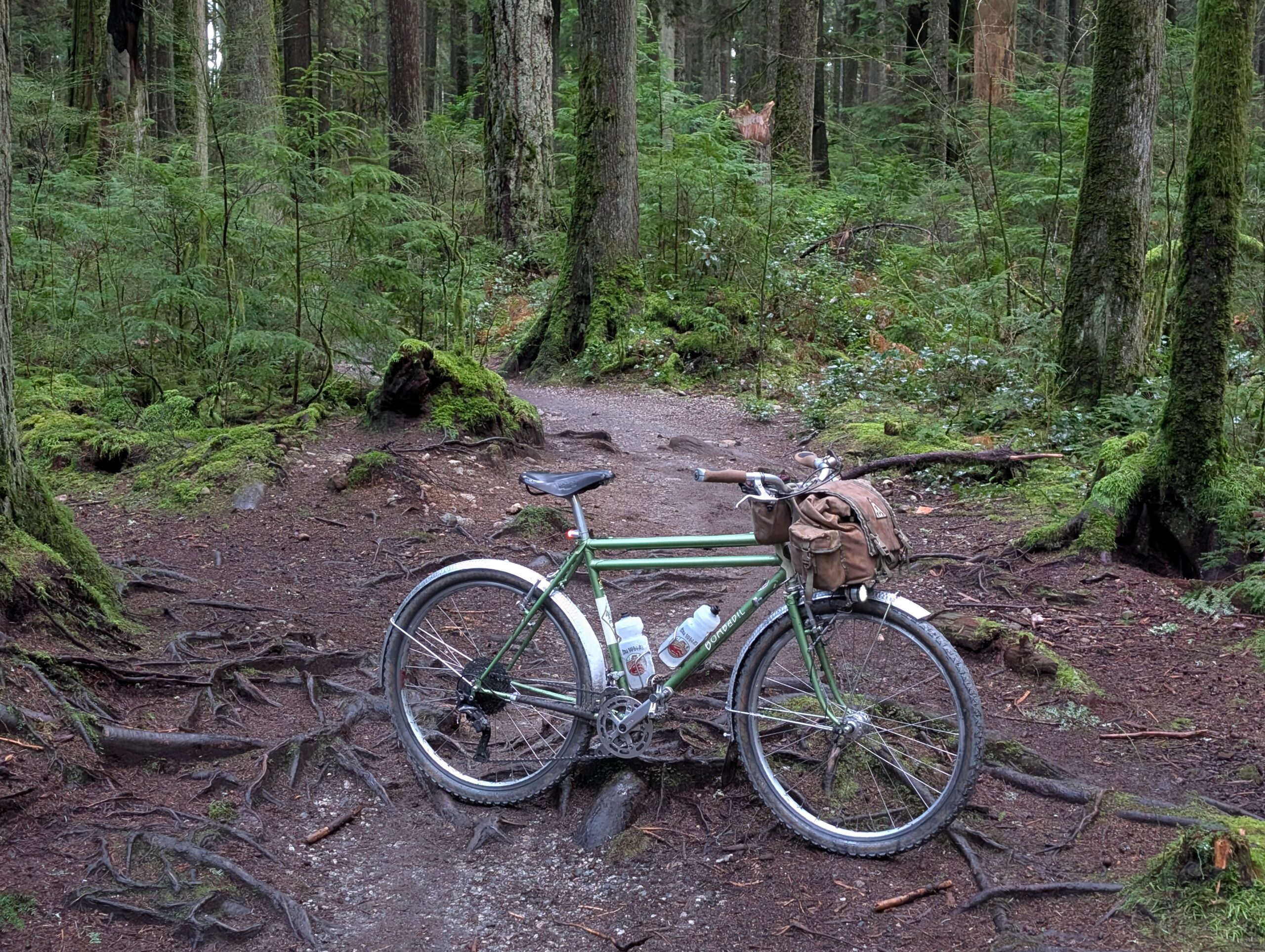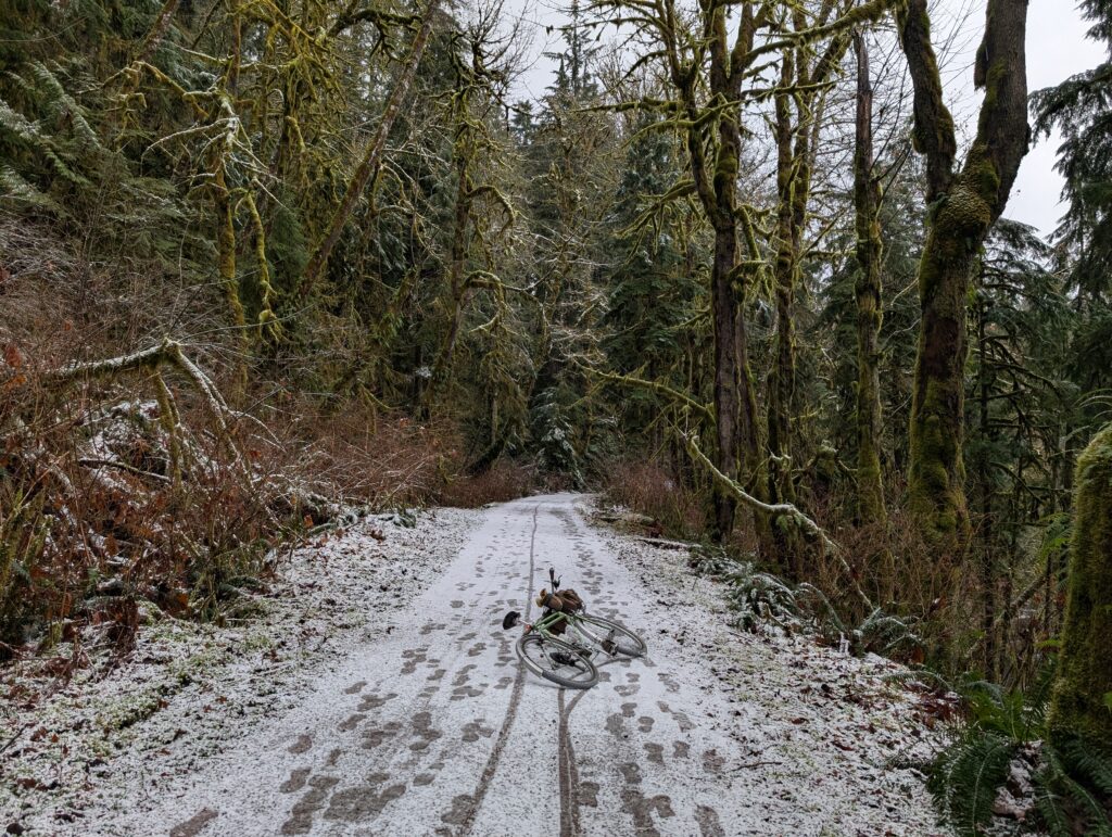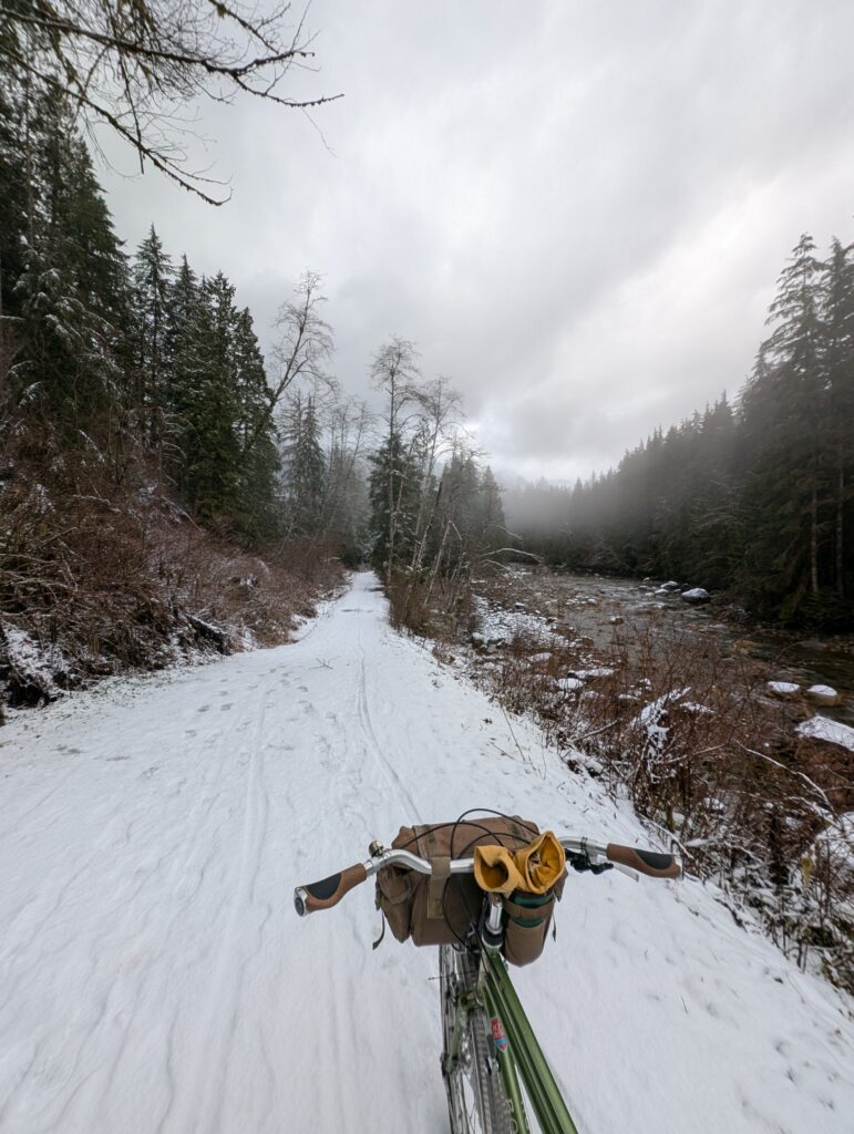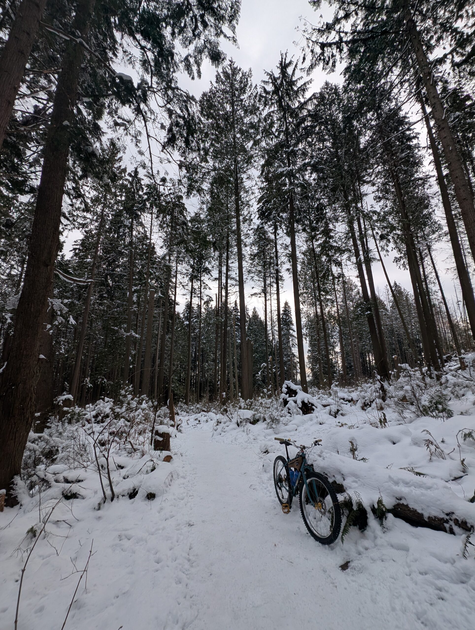 I took the Bombadil and headed over to the north shore. It didn’t take a lot of climbing before I reached some patchy snow. I made my way up Fisherman’s Trail along the Seymour river and didn’t have a real plan for how far I was going to go, I’d base it on the conditions and how I was feeling. It was stunningly beautiful, but the snow was also packing into my fenders. I rode up to the midvalley lookout, then up the Hydraulic creek connector and back on the paved parkway – which felt more like a XC skiing groomer today. As soon as I was back down the hill a bit the snow subsided, and I spent a little bit of time in the oldest corner of the cemetery along my route, reading the old headstones and reflecting on how they, too, are slowly being reclaimed by nature.