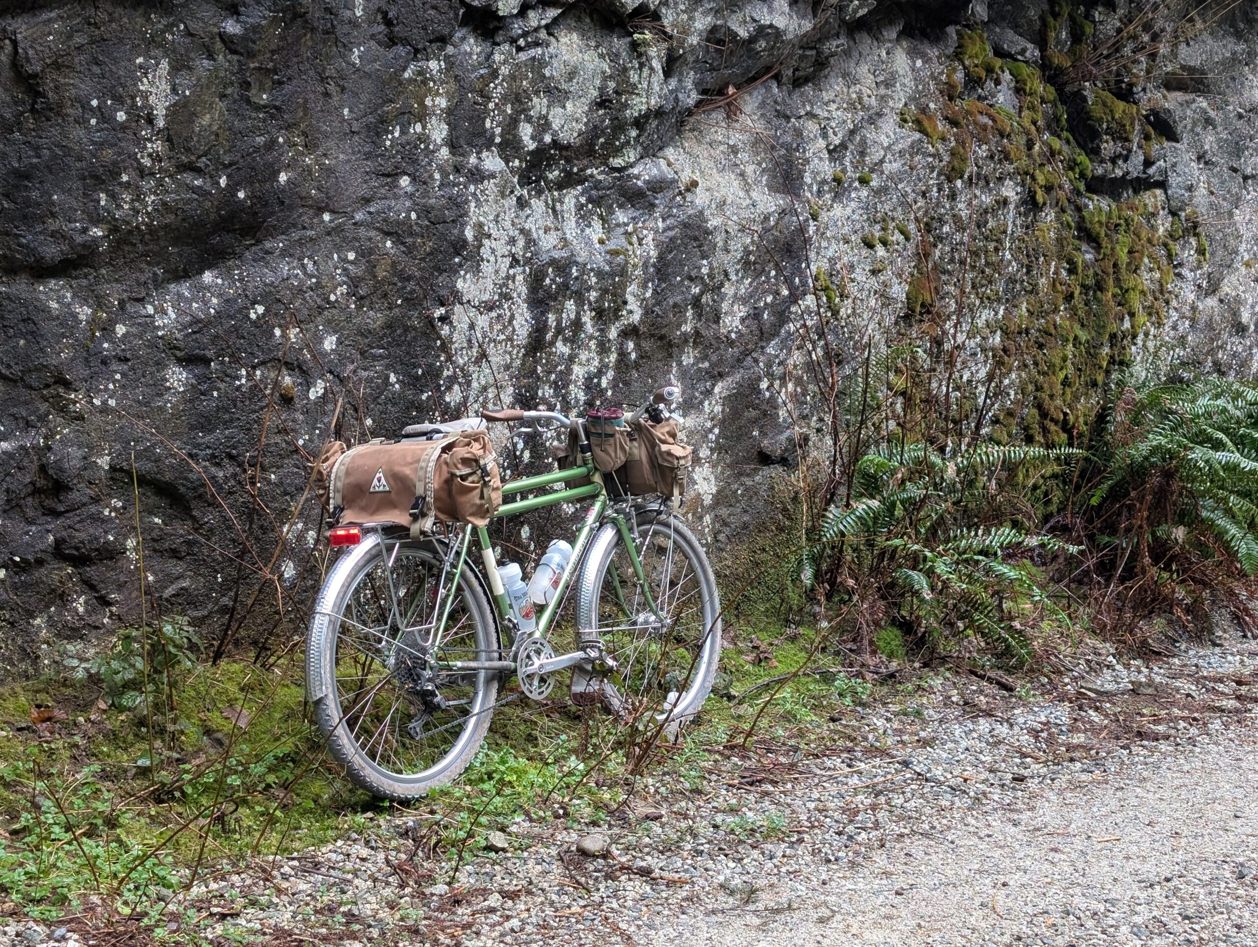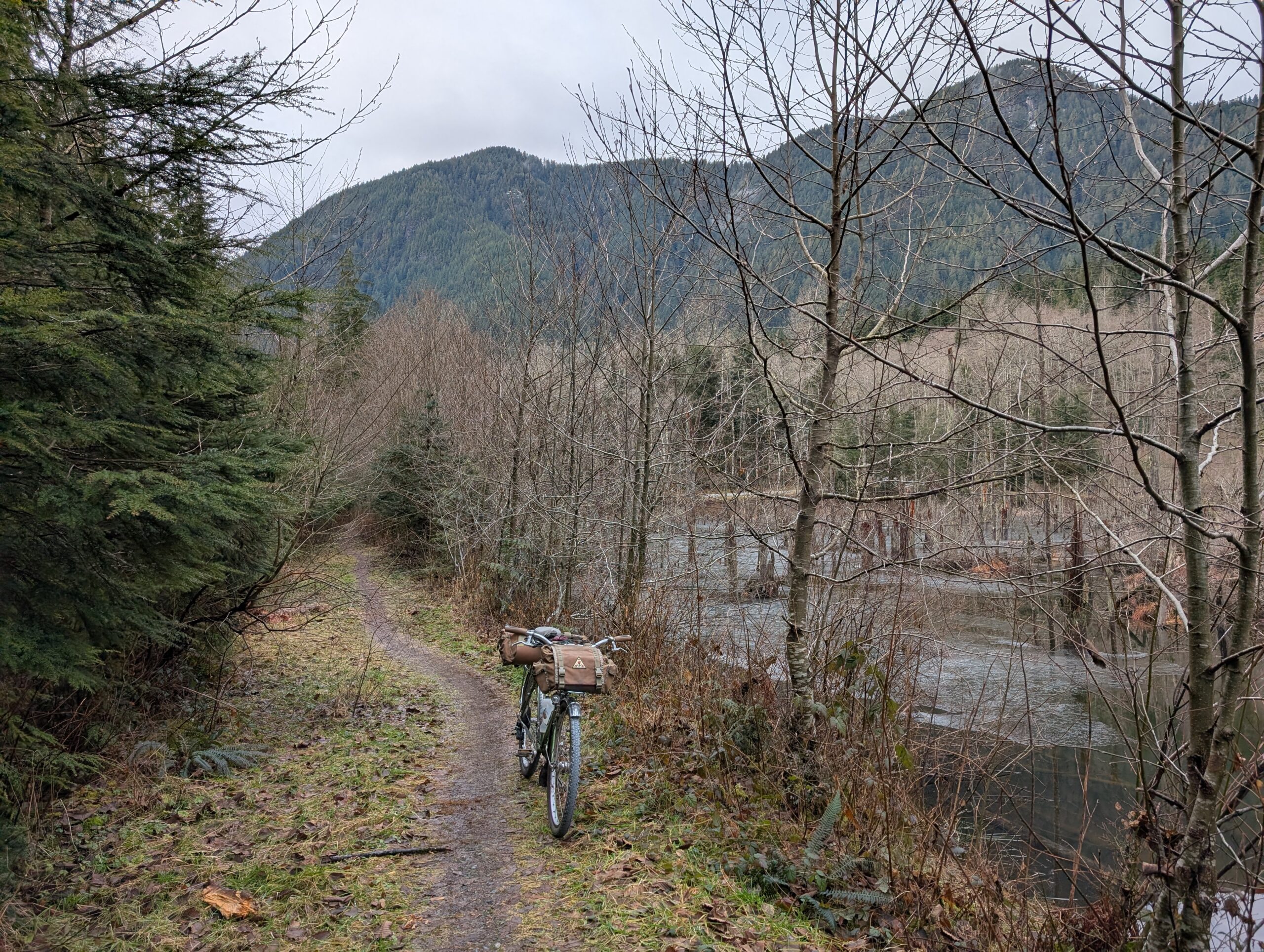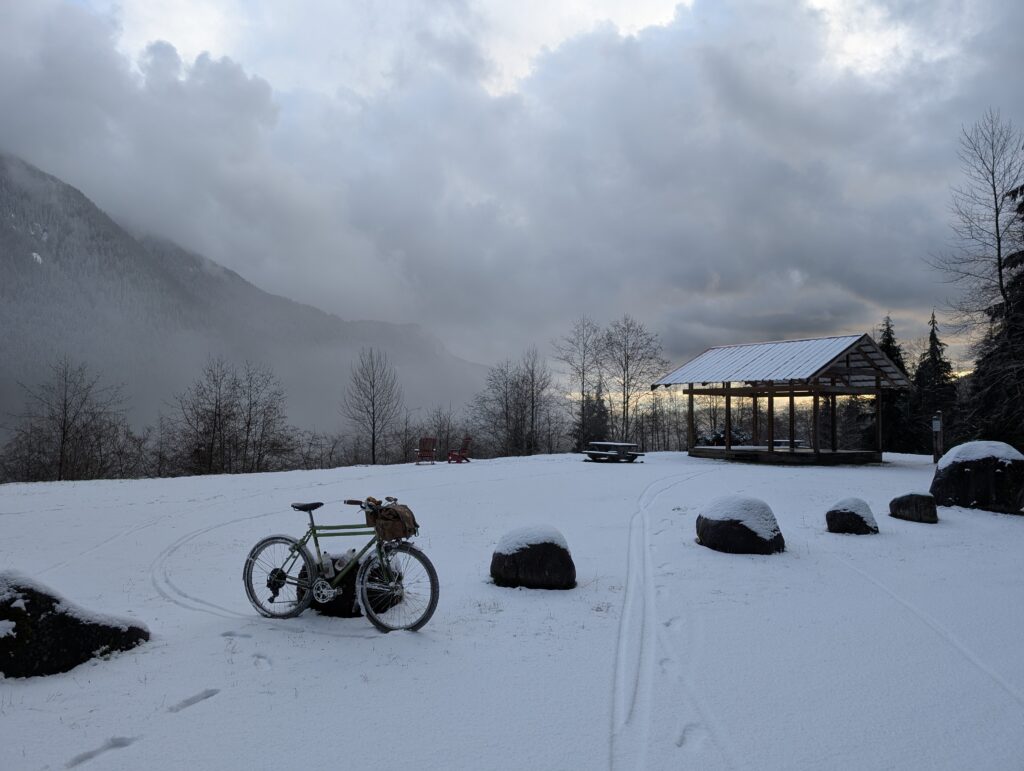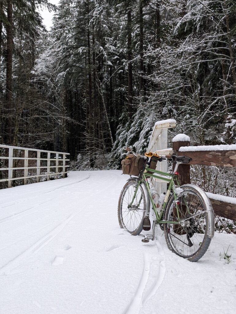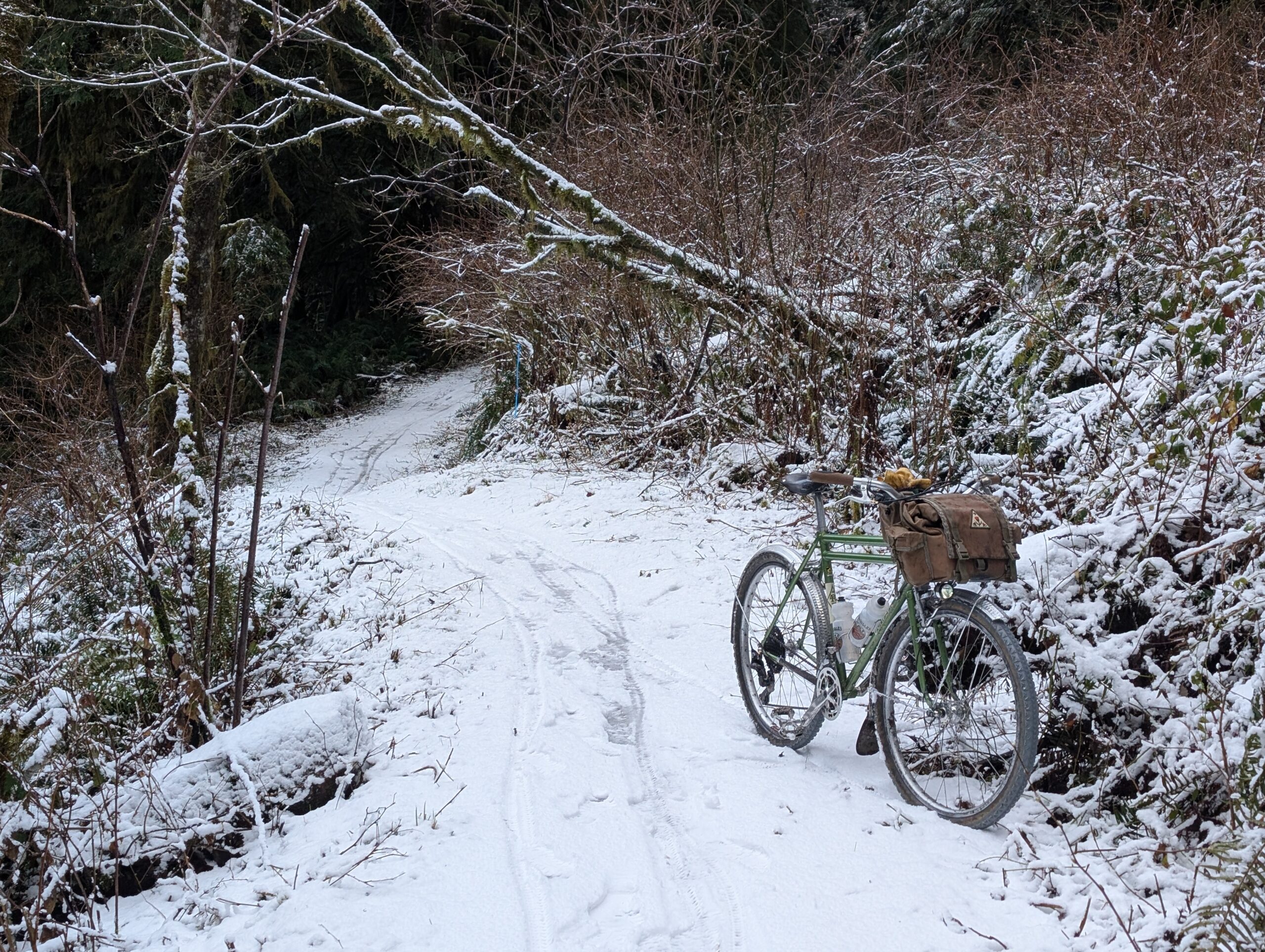 I took the Bombadil and headed over to the north shore. It didn’t take a lot of climbing before I reached some patchy snow. I made my way up Fisherman’s Trail along the Seymour river and didn’t have a real plan for how far I was going to go, I’d base it on the conditions and how I was feeling. It was stunningly beautiful, but the snow was also packing into my fenders. I rode up to the midvalley lookout, then up the Hydraulic creek connector and back on the paved parkway – which felt more like a XC skiing groomer today. As soon as I was back down the hill a bit the snow subsided, and I spent a little bit of time in the oldest corner of the cemetery along my route, reading the old headstones and reflecting on how they, too, are slowly being reclaimed by nature.