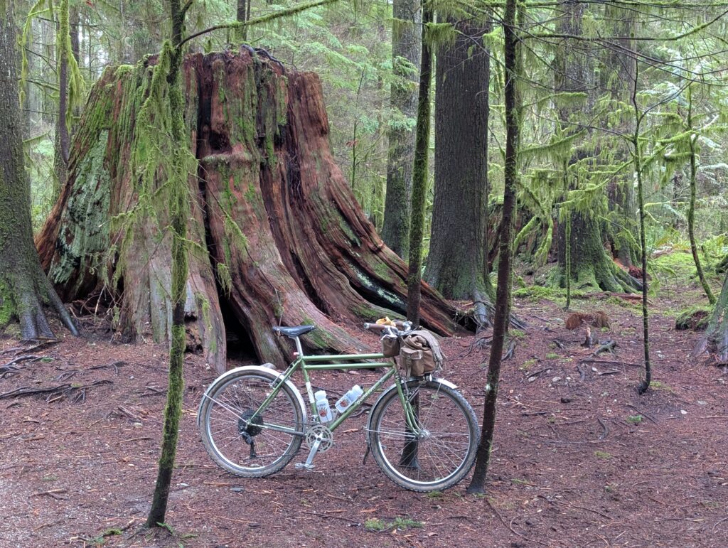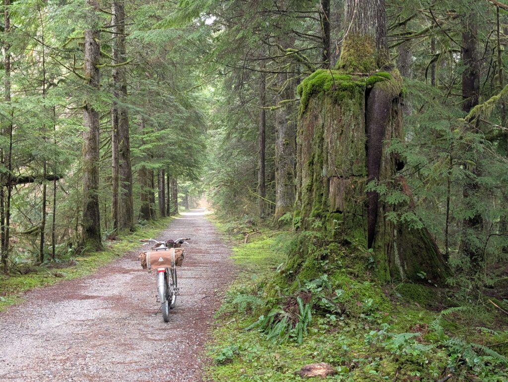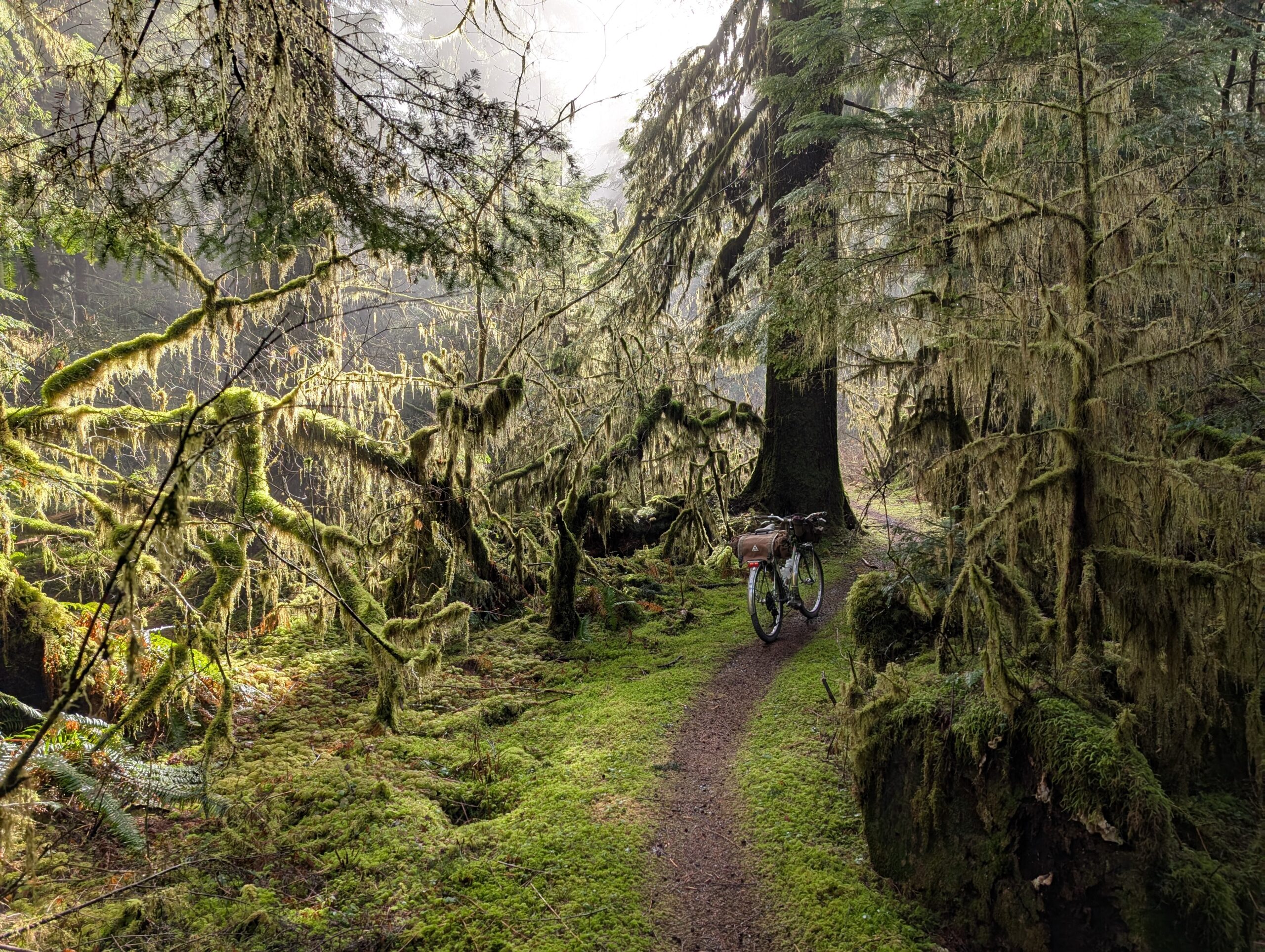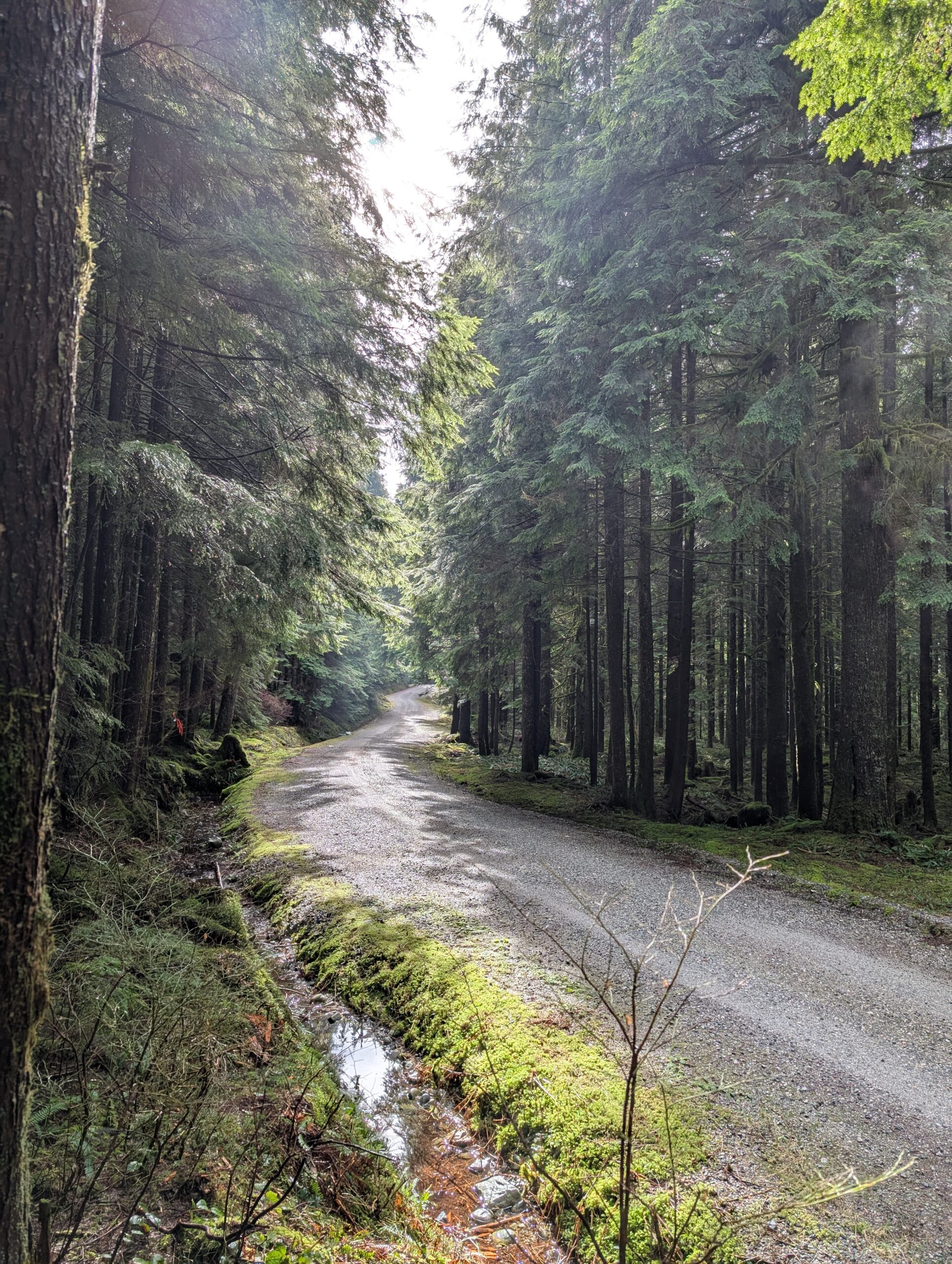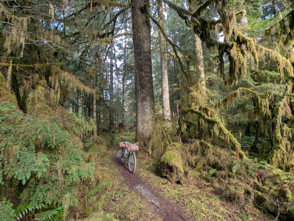 The first half is gravel access road, but then there is about 2km of trail at the north end that is the highlight of the route (as I’ve surely said before), and highlight among the highlight is the Rainbow Creek loop. Appearing prehistoric, this moss- and lichen-covered area is home to some very old Sitka spruce.