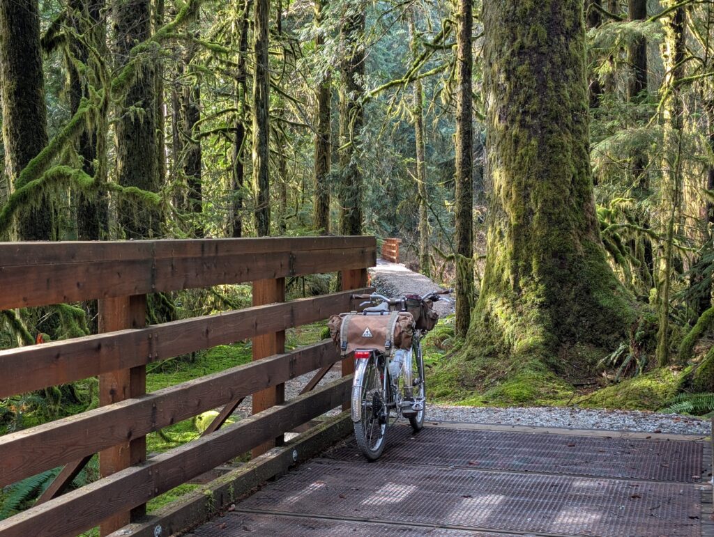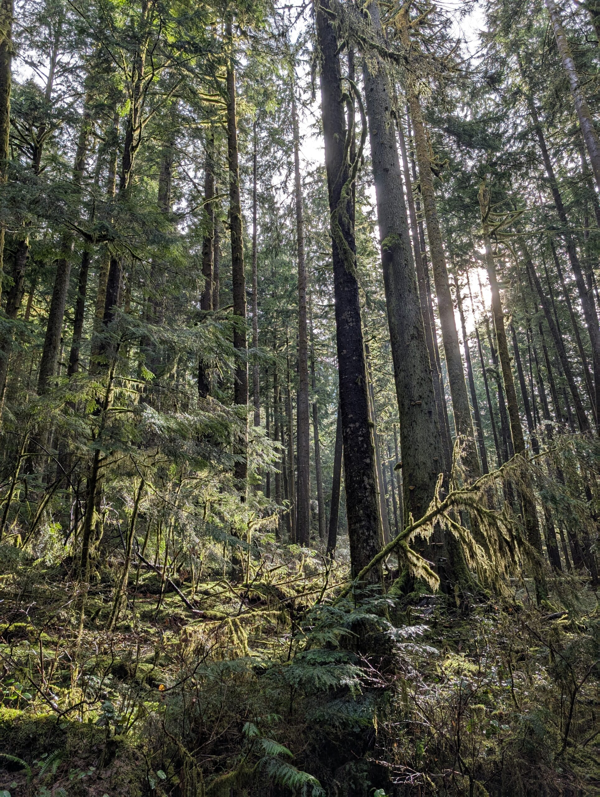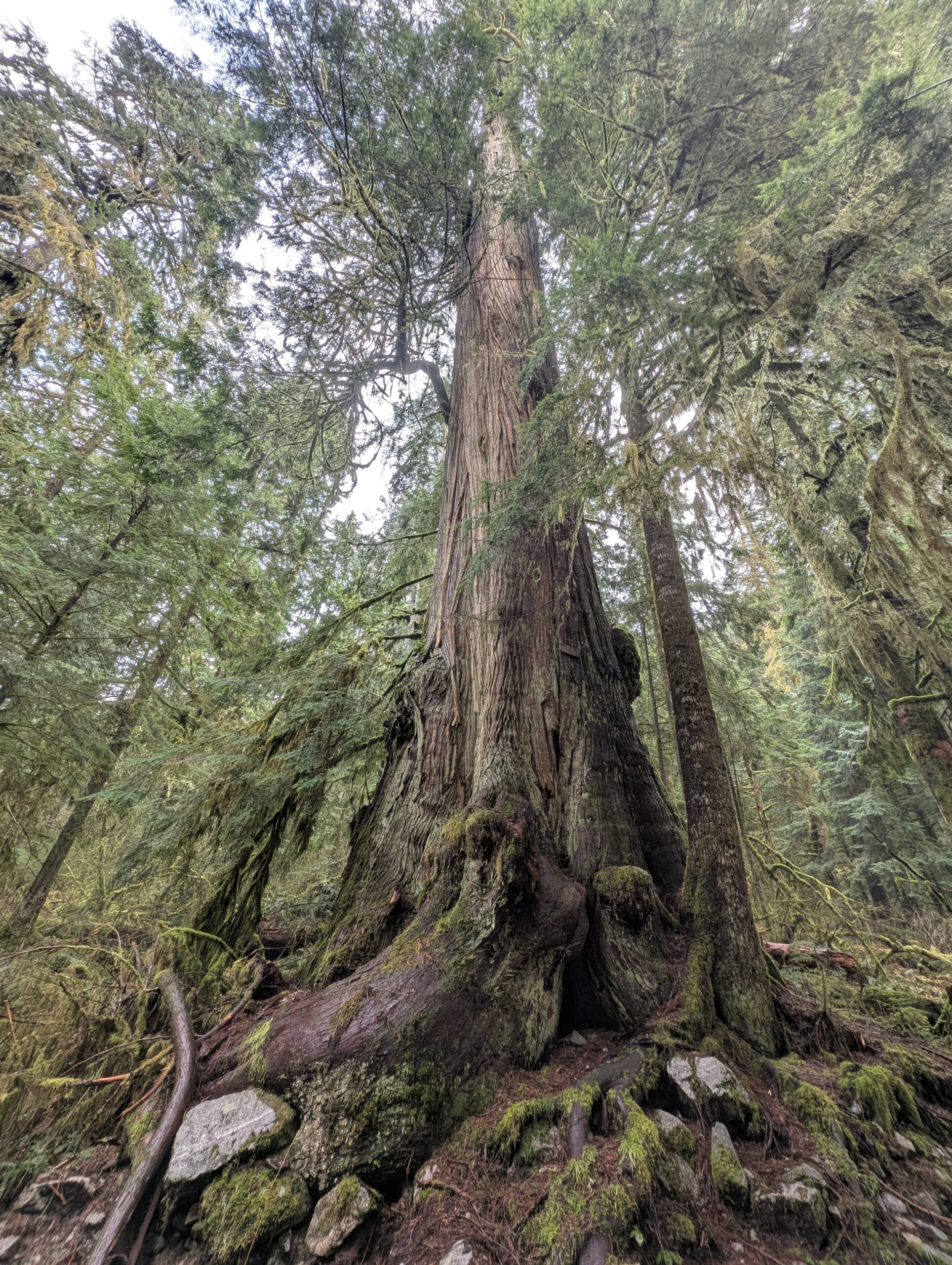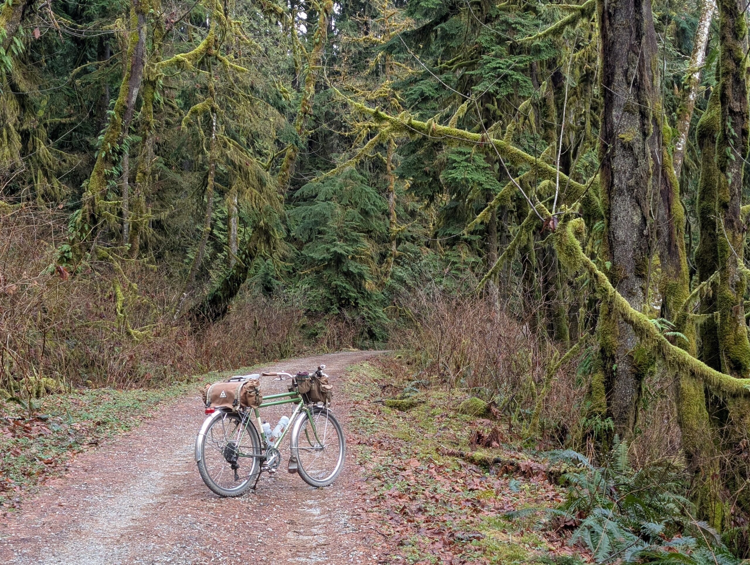The first half is gravel access road, but then there is about 2km of trail at the north end that is the highlight of the route (as I’ve surely said before), and highlight among the highlight is the Rainbow Creek loop. Appearing prehistoric, this moss- and lichen-covered area is home to some very old Sitka spruce.