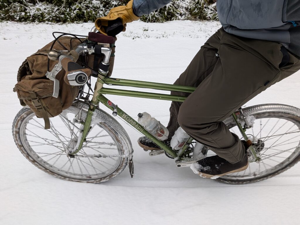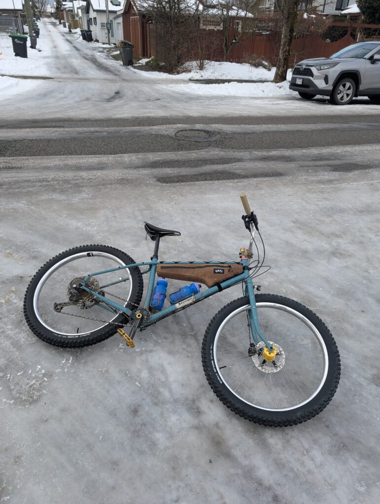 Now the 15th of February, the snow has been turning to slush with the past couple days’ temperatures so I headed back out on the fat tire’d Stooge. With much of the roads now free of snow, I became acutely aware how slow these tires actually are. My heart rate was spiking just trying to over-take a jogger! No doubt they were great in the mud and snow, though.