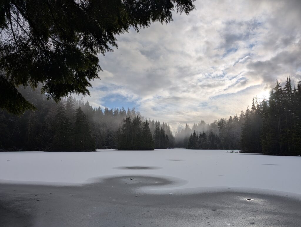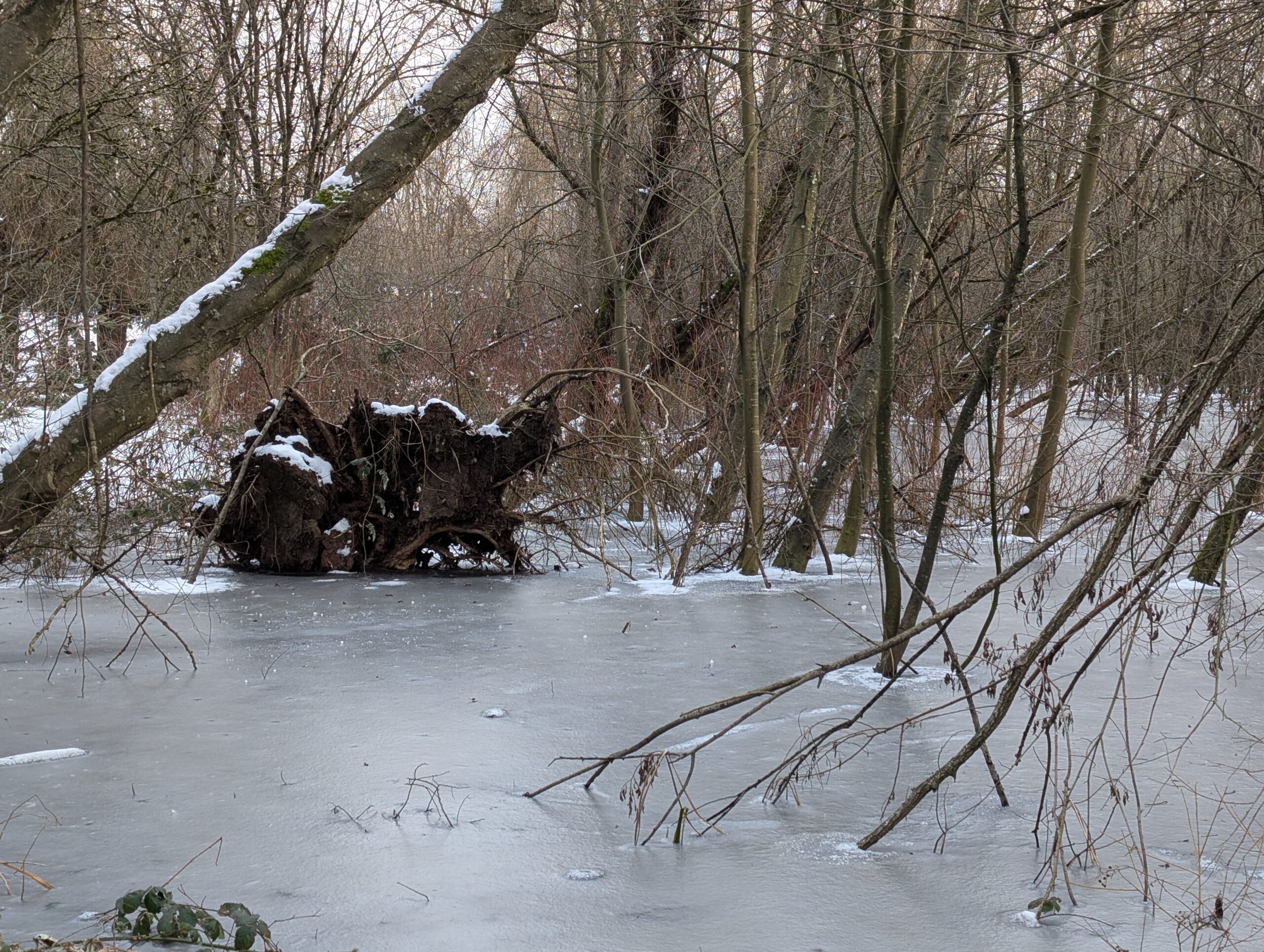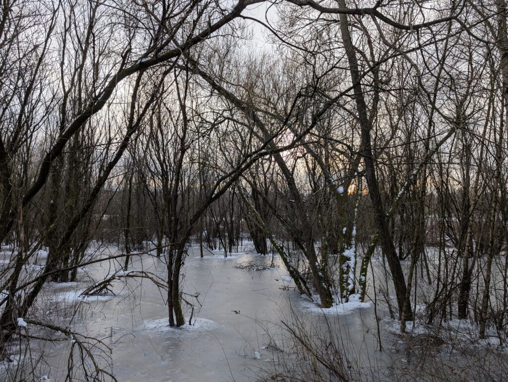 As of February 13th, the cold weather had been constant for nearly two weeks now, but warmer temps were on the way. I realized that meant that Trout Lake would be thawing soon and if I wanted to see it in its frozen glory, I better get over there. It didn’t disappoint! I went to an area that I knew was flooded and was visually quite interesting, and it was pretty awesome. The ice was plenty thick to support my weight, though I only walked around on areas I knew weren’t deep.