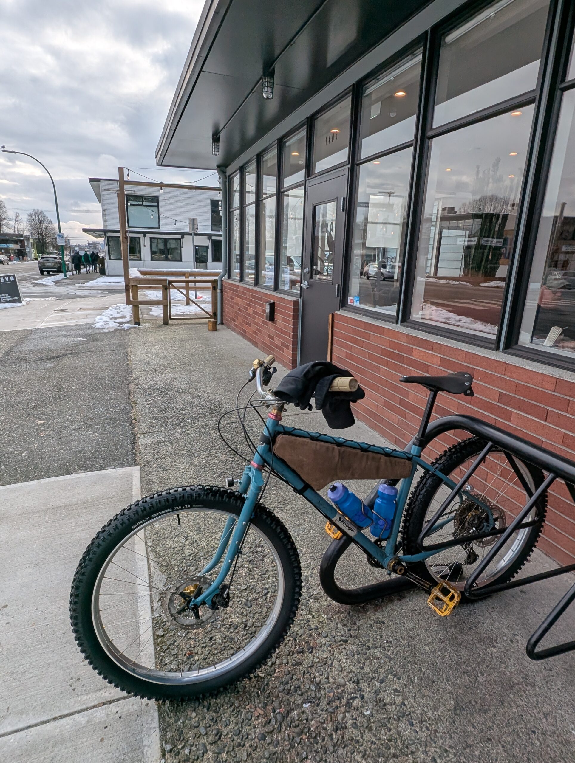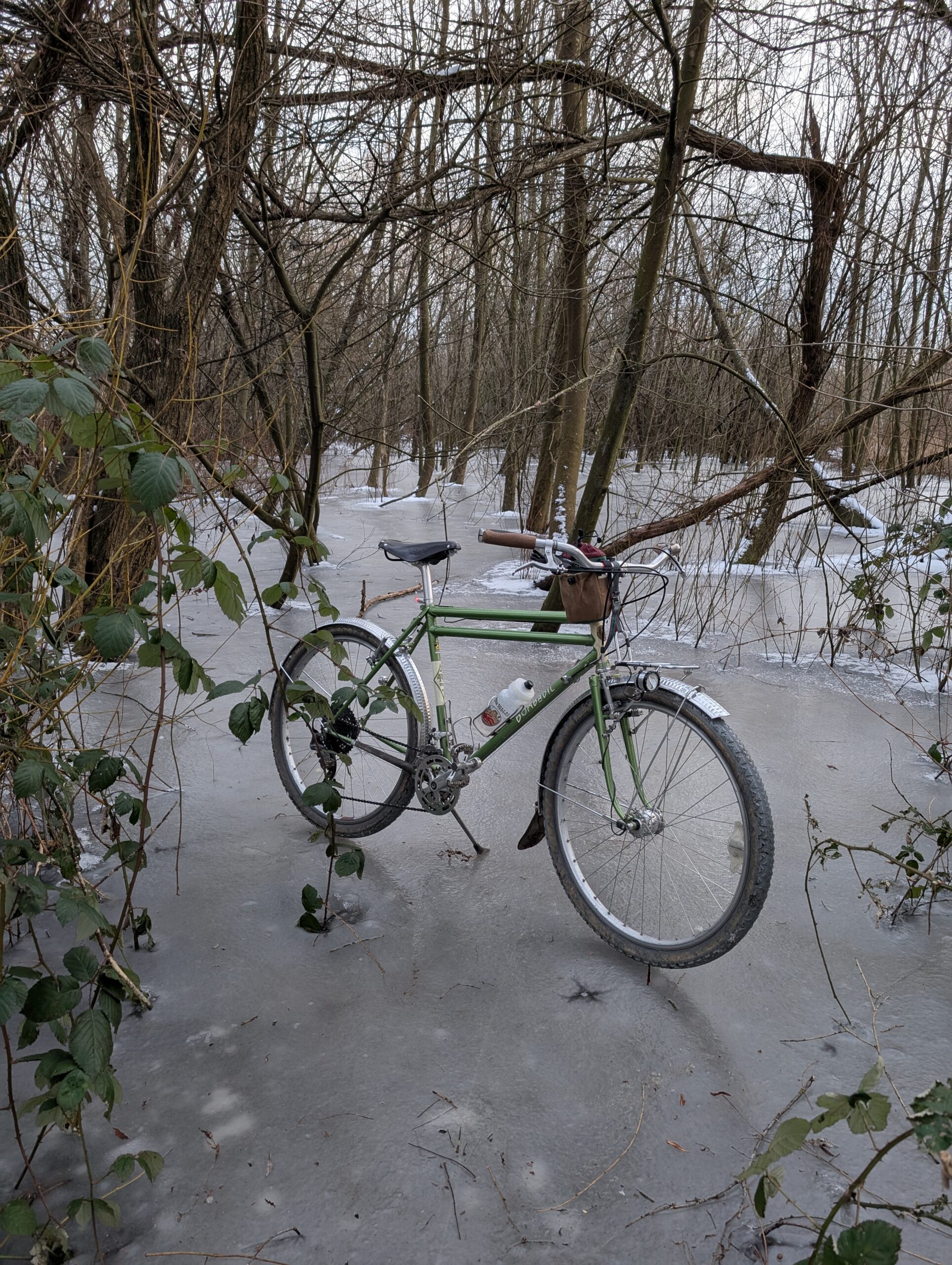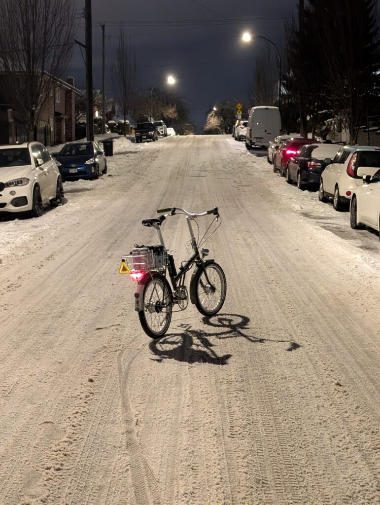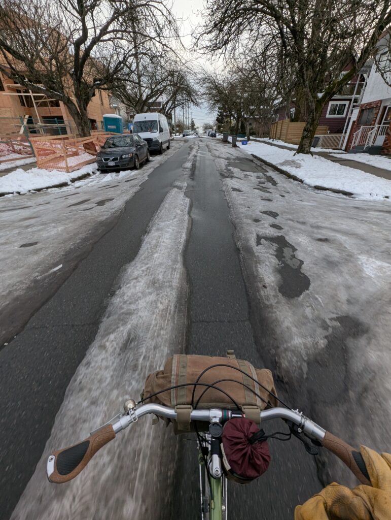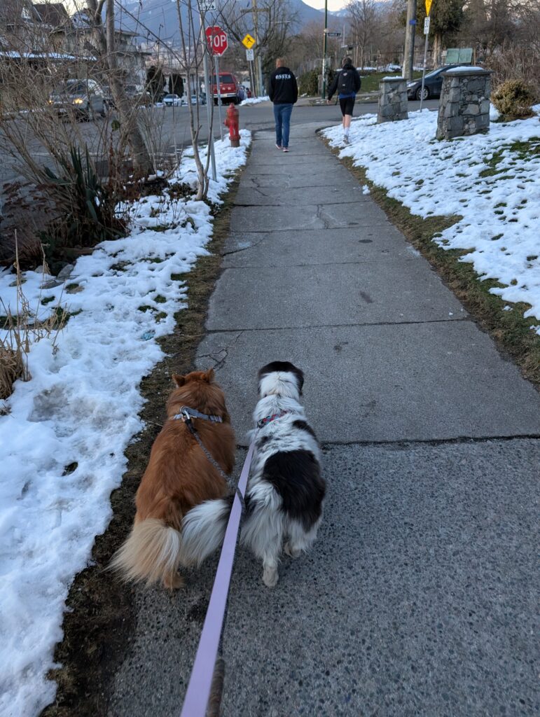 The next morning, Sunday Feb 2nd, we woke up to snow in the city as well. A decent amount of it! We went for a walk with Leia, who loves the snow, and ran into a friend who had some personal stuff and needed someone to take her dog, Archie, for a bit. So he came home with us, and Leia was a bit confused. We kept Archie a few days, over which time it remained consistently well below freezing, so the sidewalks and roads became rather treacherous to walk. I managed one ride over these few days, just a short one to run some errands on the old Raleigh. It is fitted with “all weather” Schwalbe tires that have siping similar to automotive winter tires .. but they aren’t super effective on this rather icy surface.